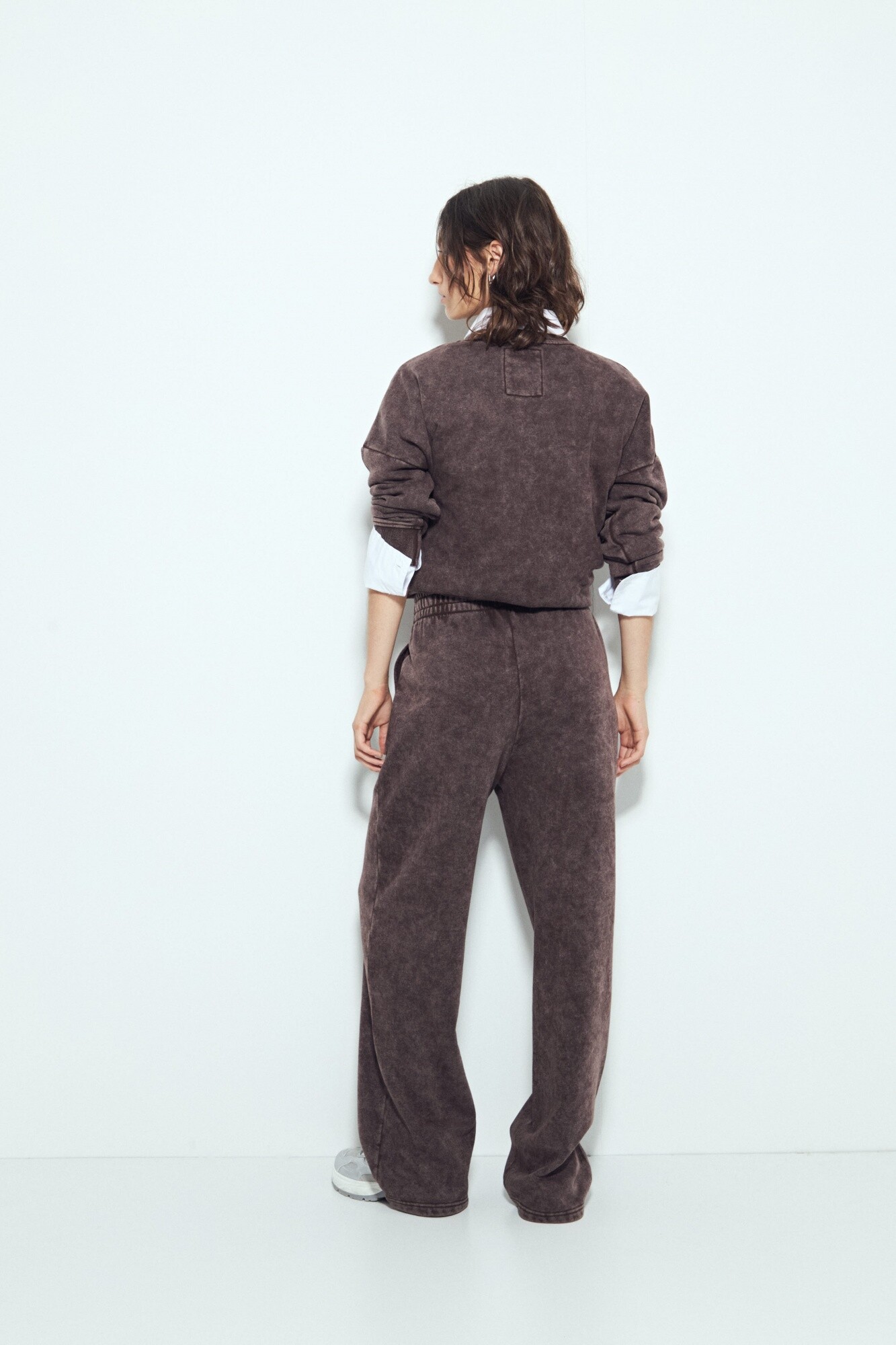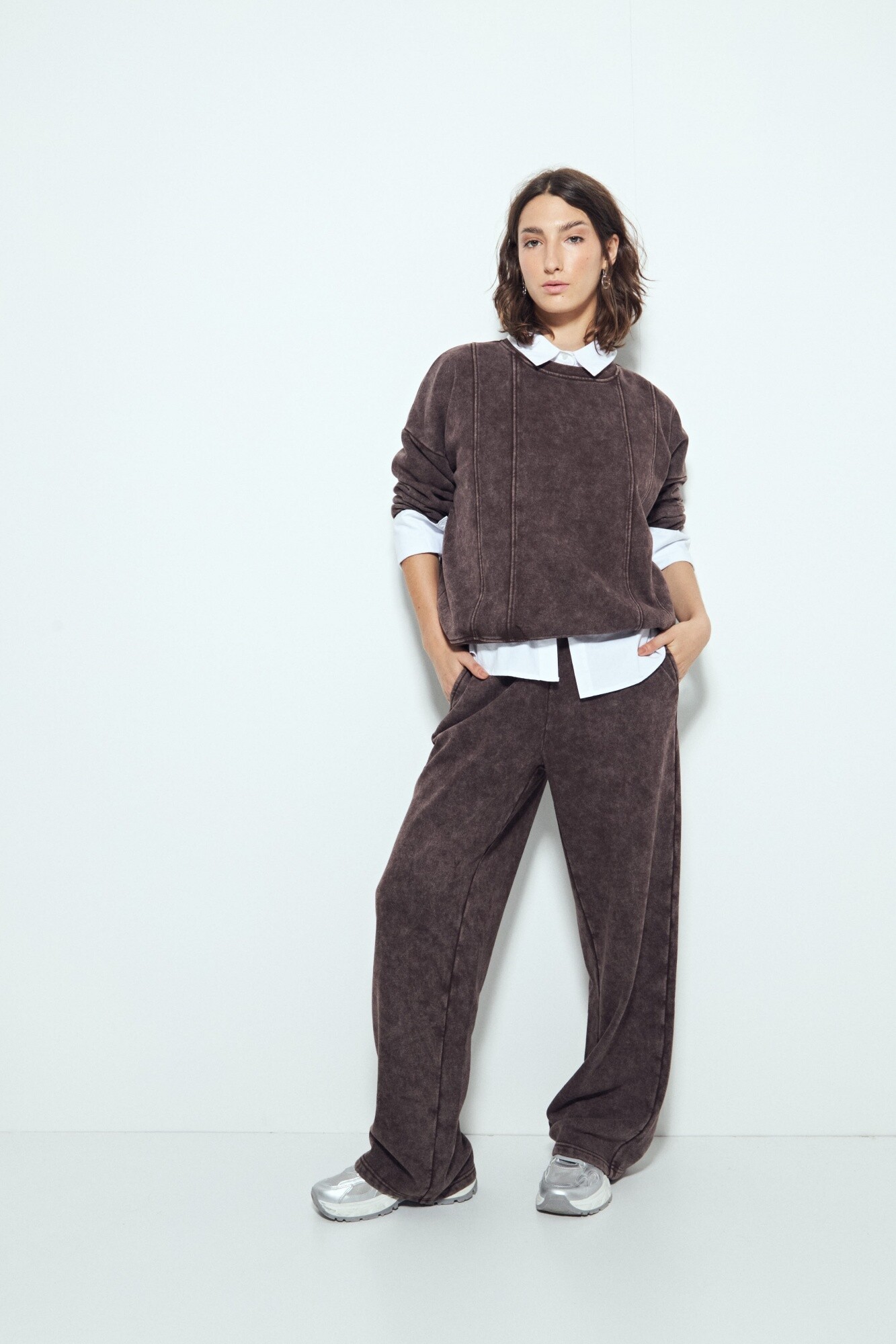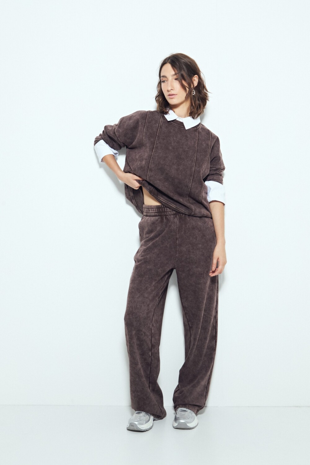 Babucha recta con elástica en la cintura y bolsillos en los laterales, de tela washed dyed que le proporciona ese color desgastado, lavado.