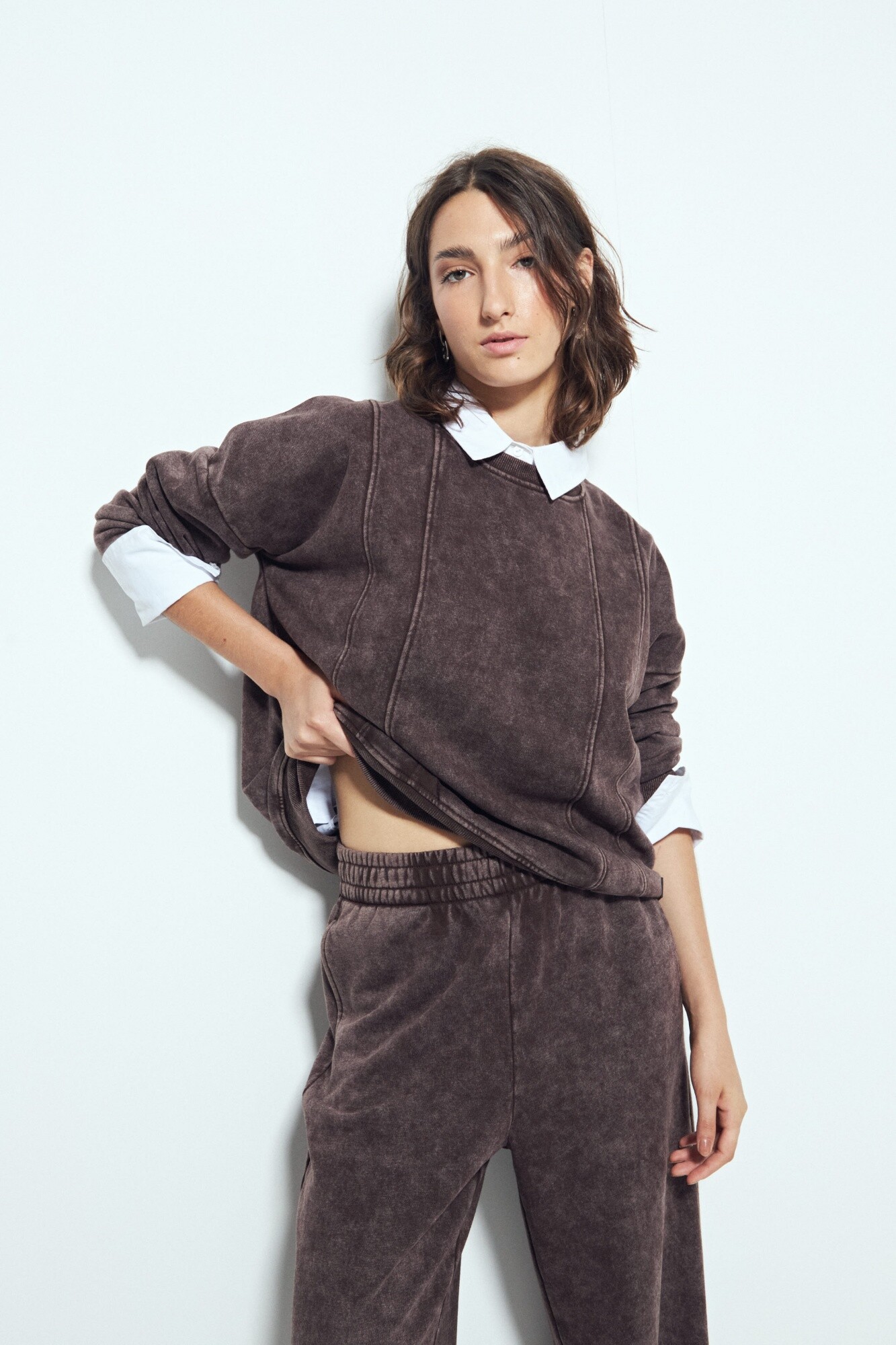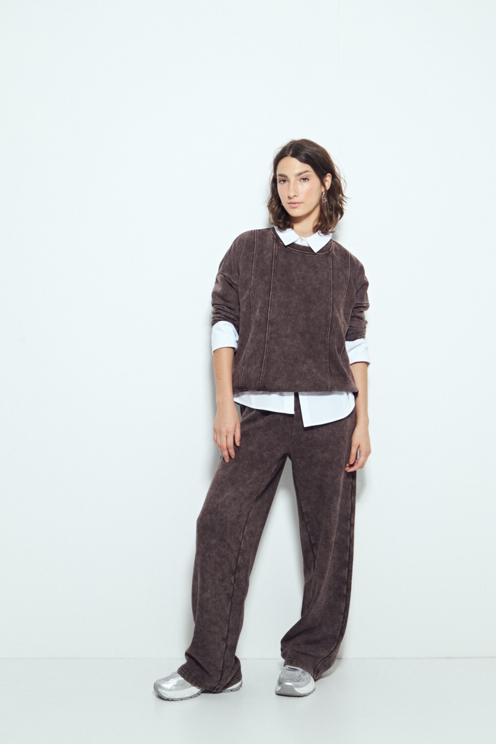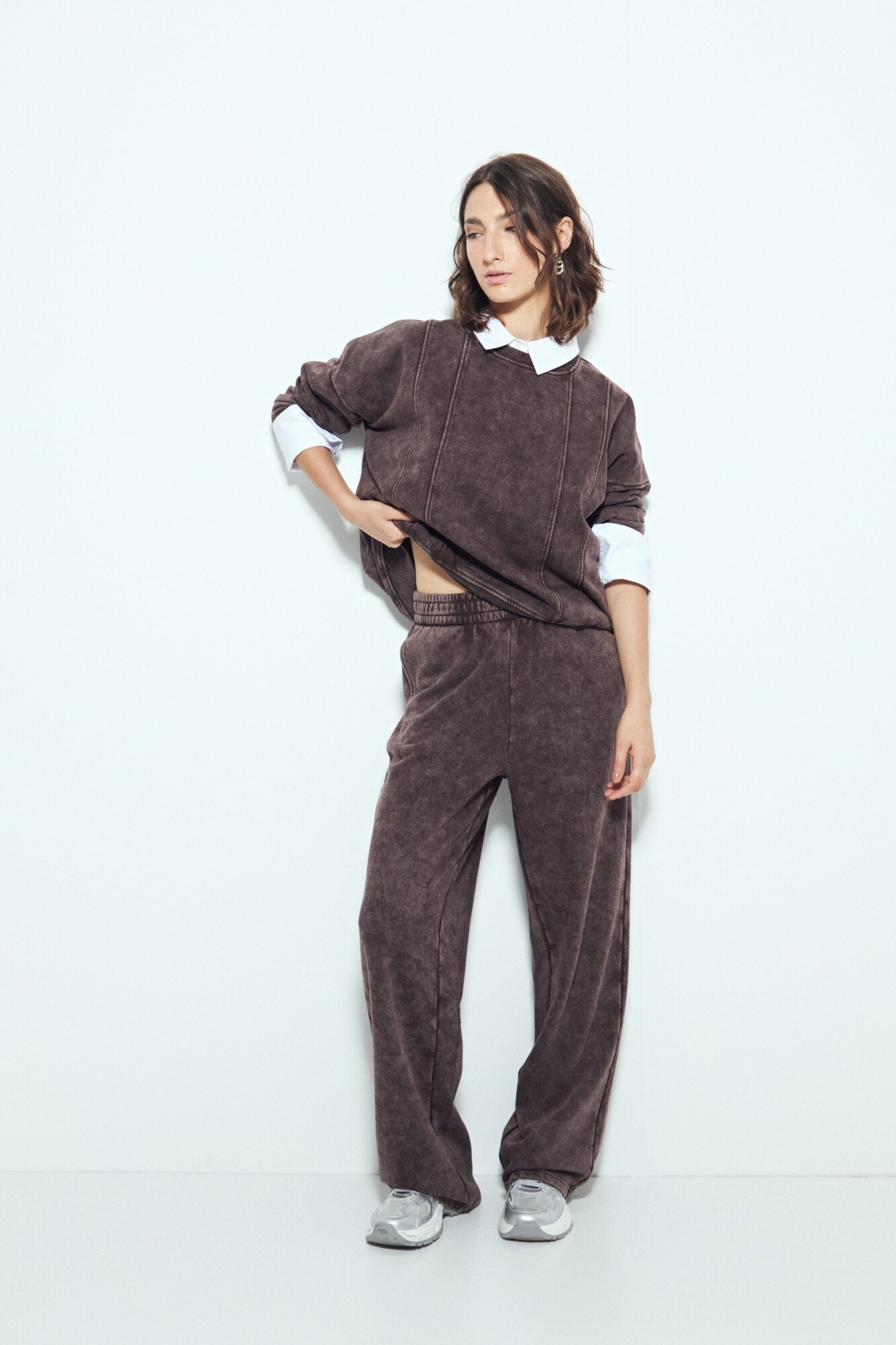 Babucha recta con elástica en la cintura y bolsillos en los laterales, de tela washed dyed que le proporciona ese color desgastado, lavado.