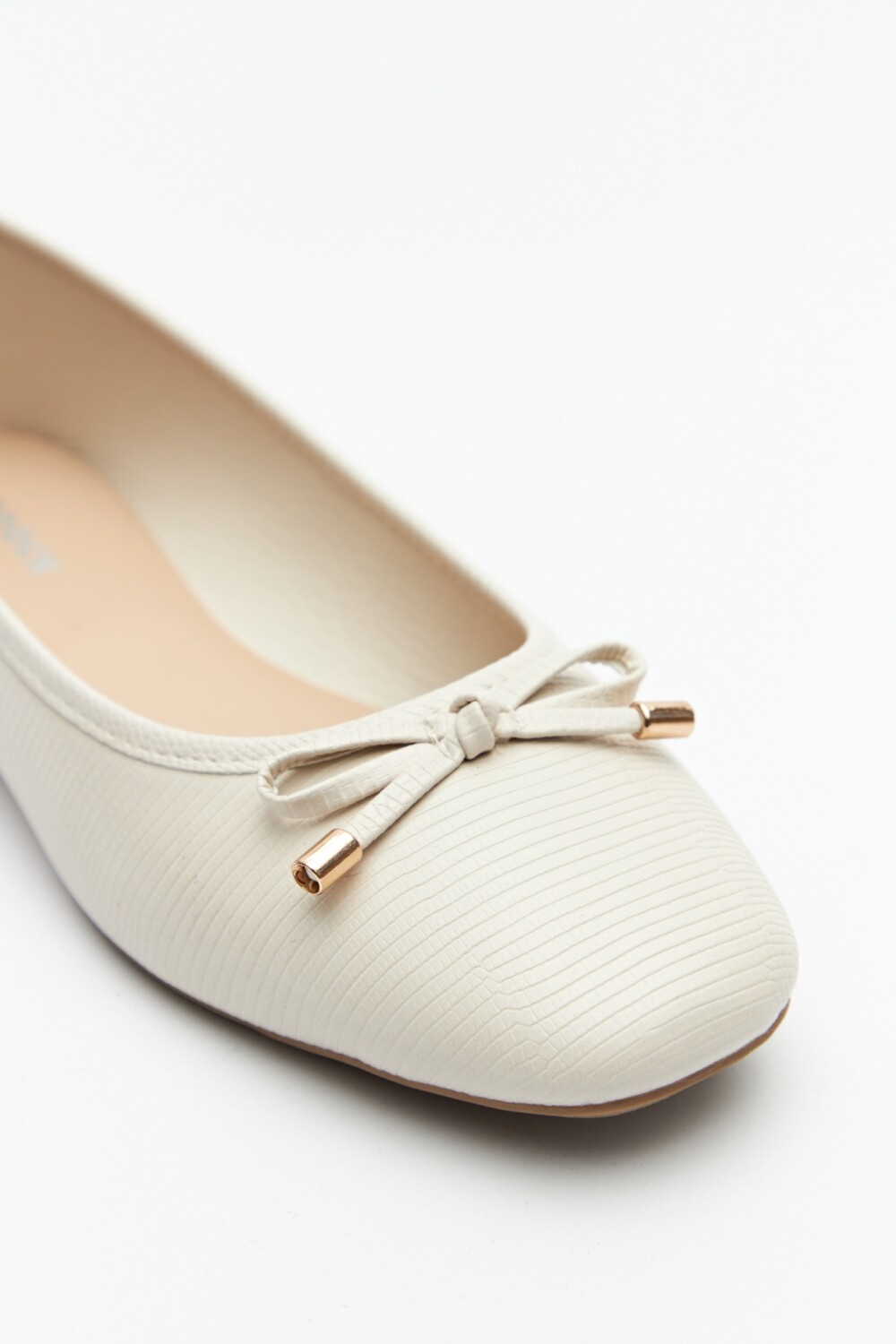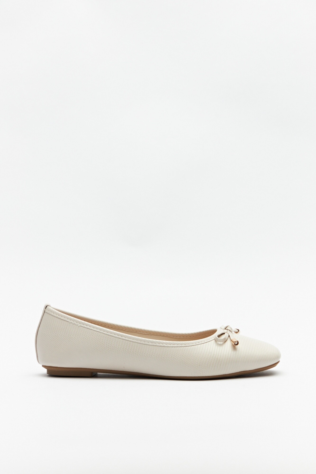 Balerina en símil cuero texturizado con aplique de moña y delicados detalles metálicos. Suela súper confortable.