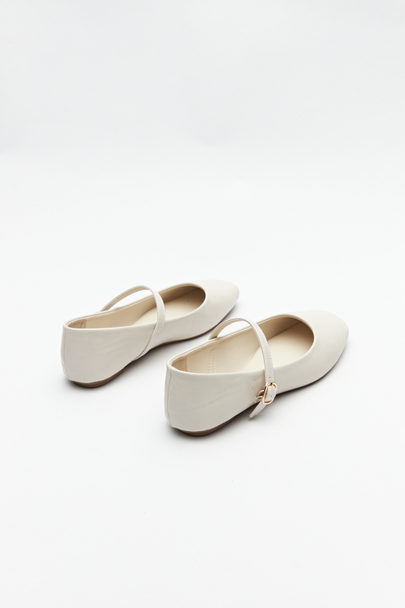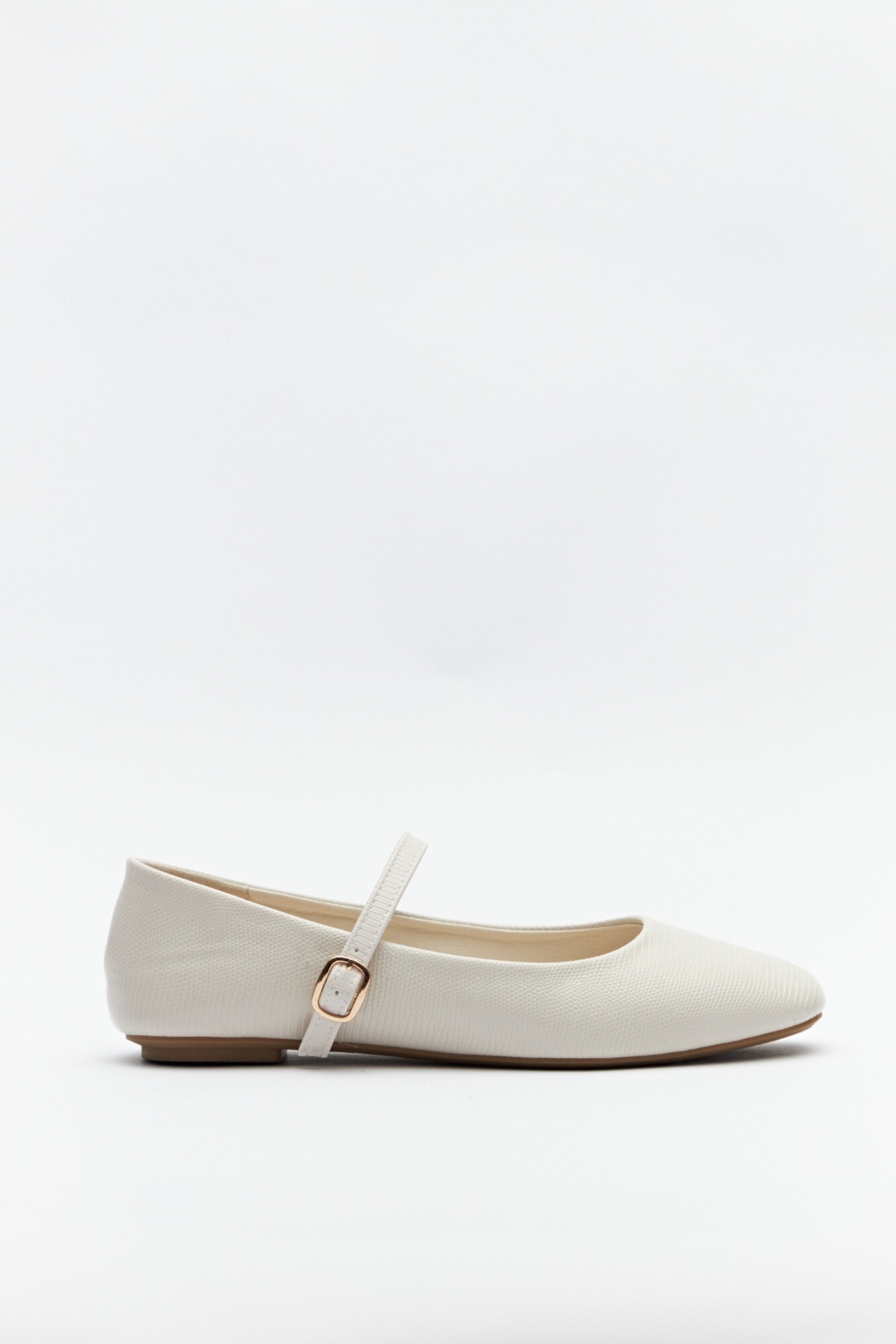 Balerinas en sími cuero texturizado con tira y hebilla metálica ajustable.