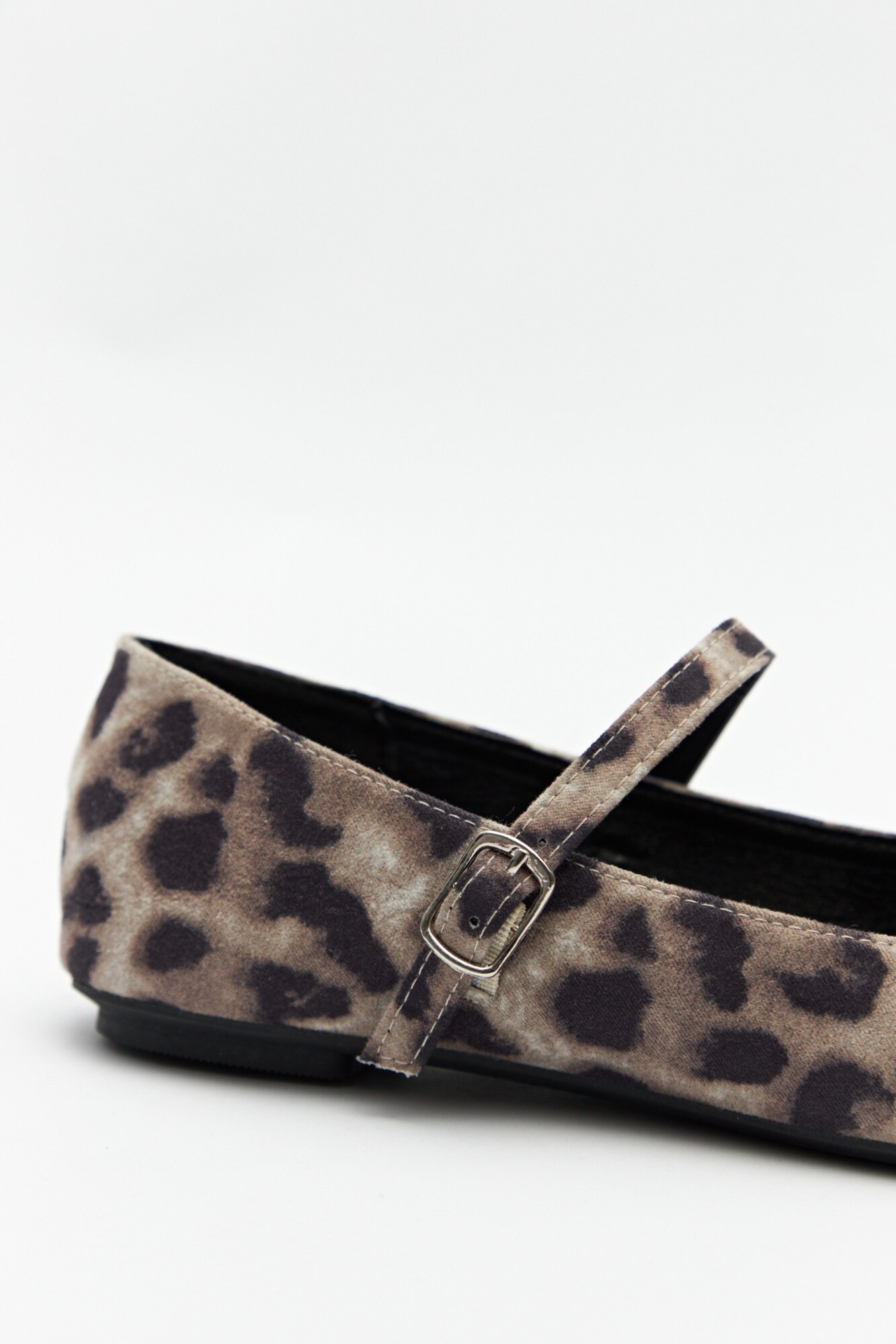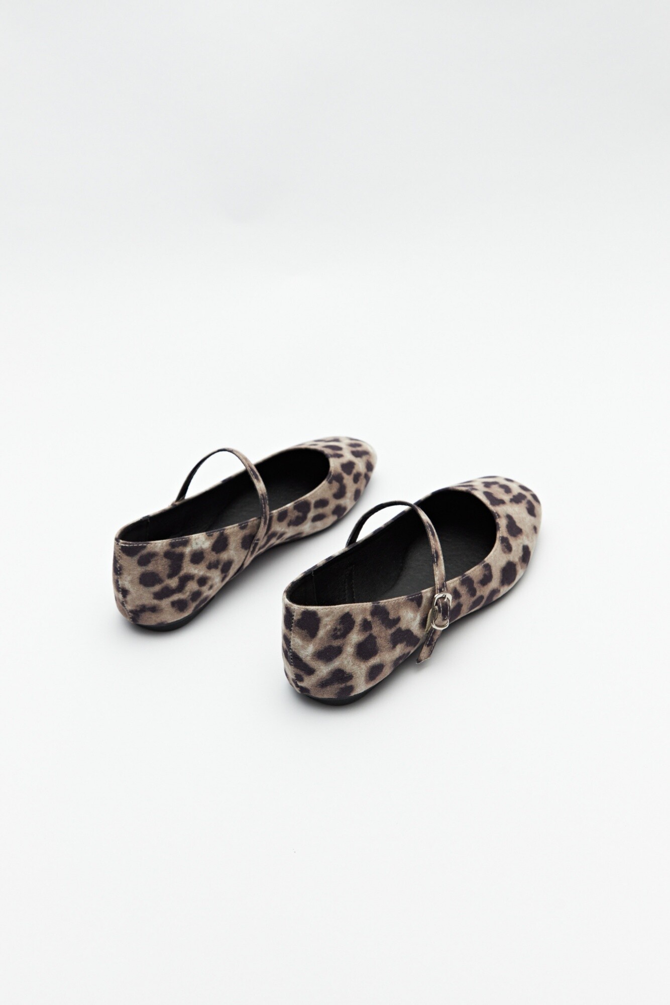 Balerinas animal print con tira y hebilla metálica ajustable, suela confortable y acolchonada.