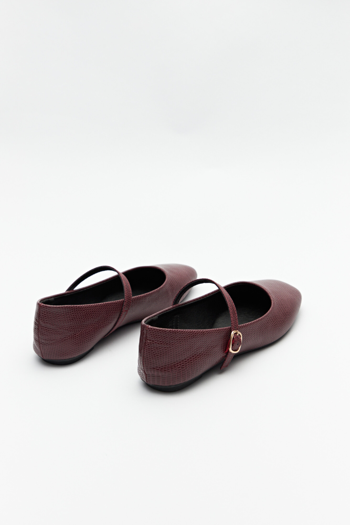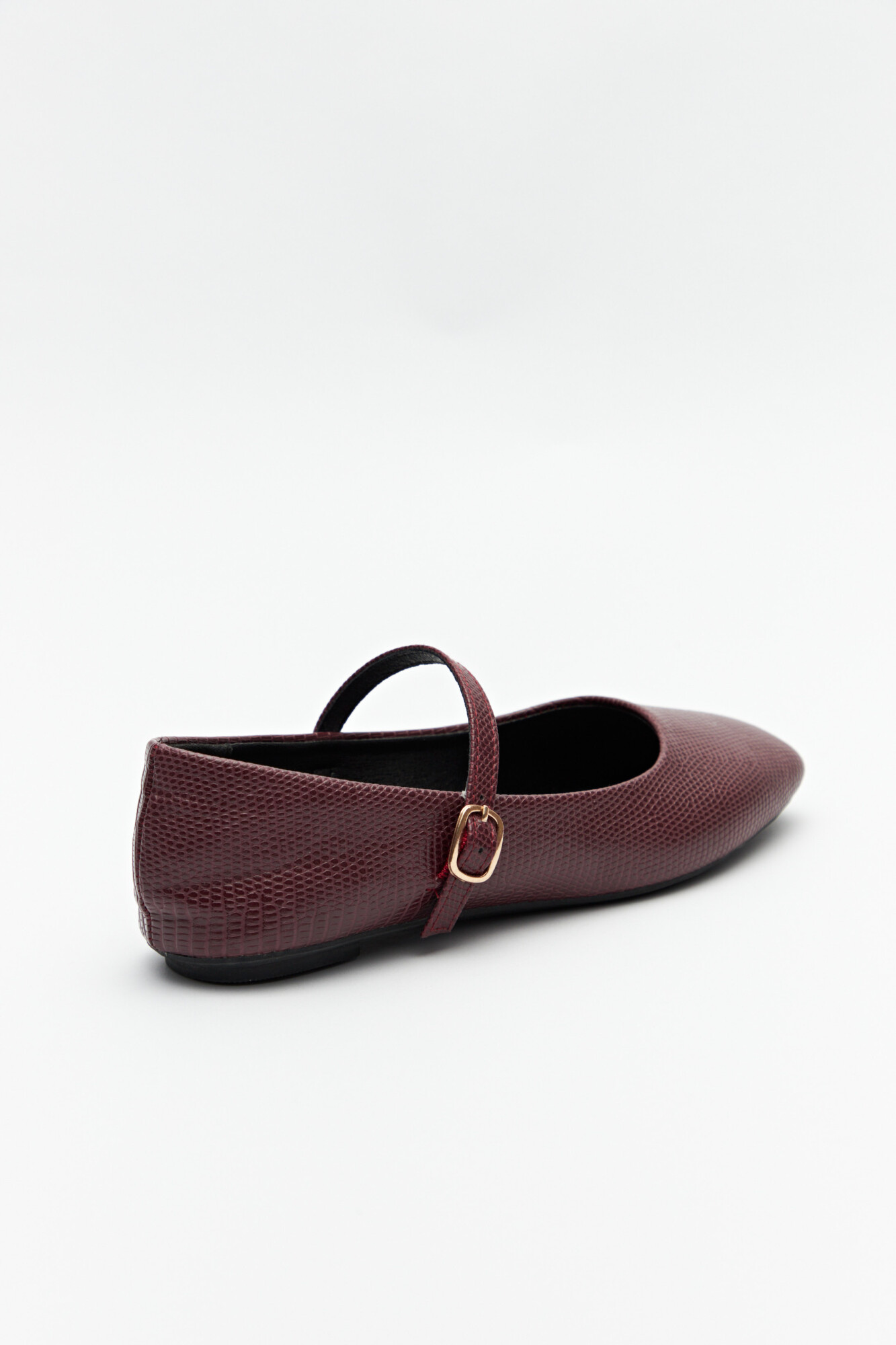 Balerinas en sími cuero texturizado con tira y hebilla metálica ajustable.