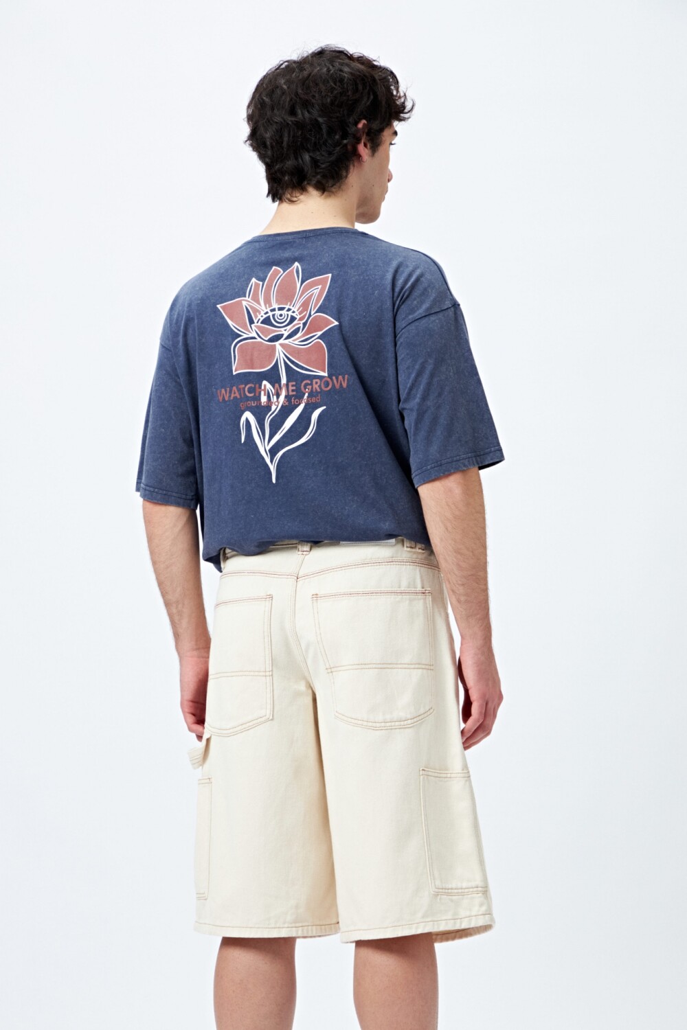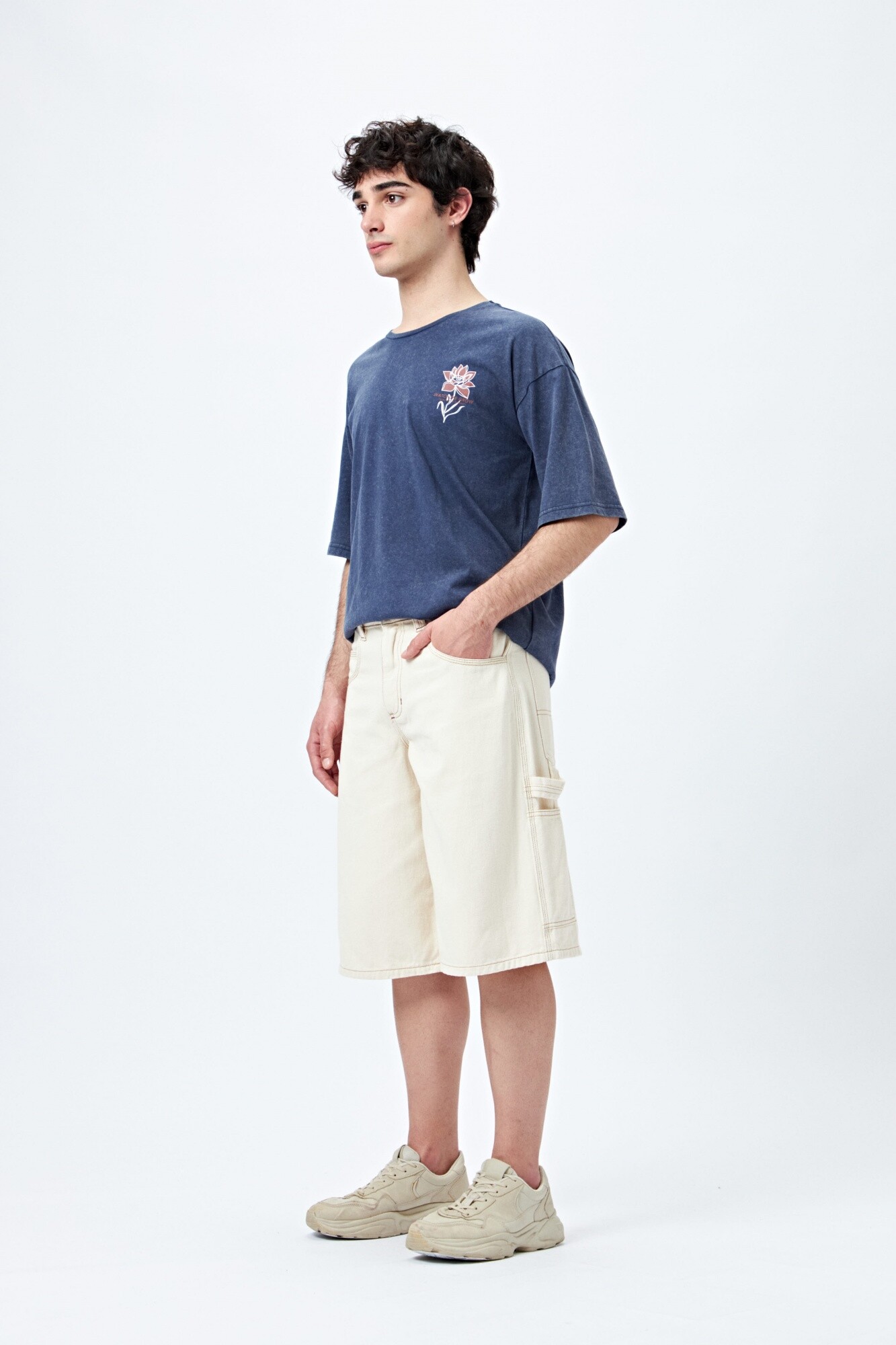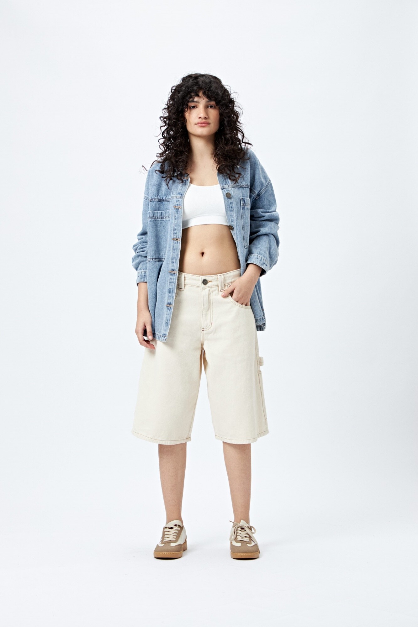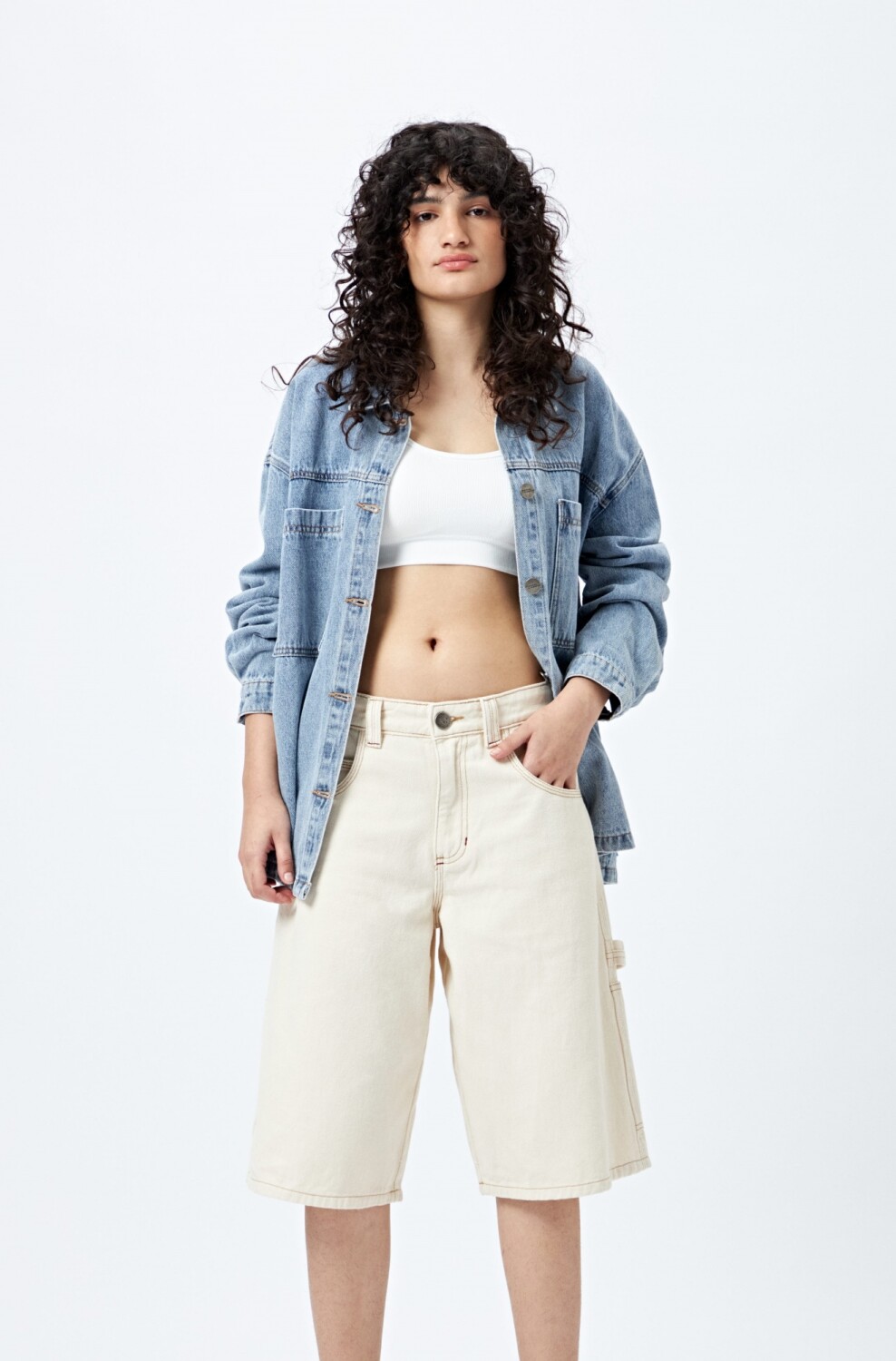 Bermuda carpenter de denim con fit relaxed y largo por encima de la rodilla. Con costuras visibles y múltiples bolsillos funcionales, aporta ese aire utilitario que la hace trendy y canchera. Una prenda sin género, pensada para todos los estilos.