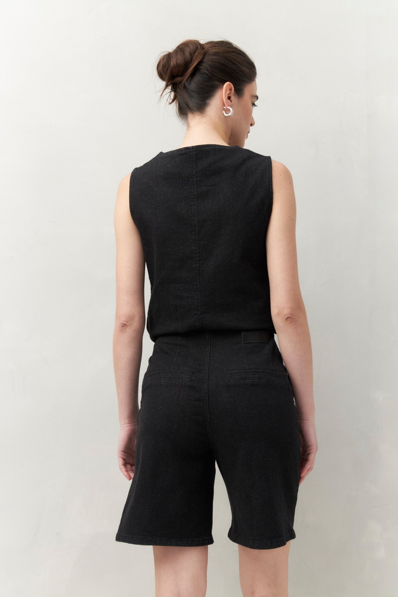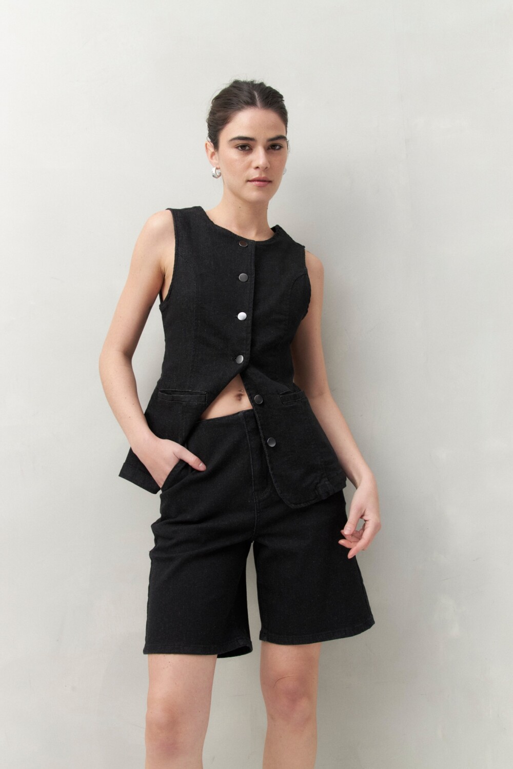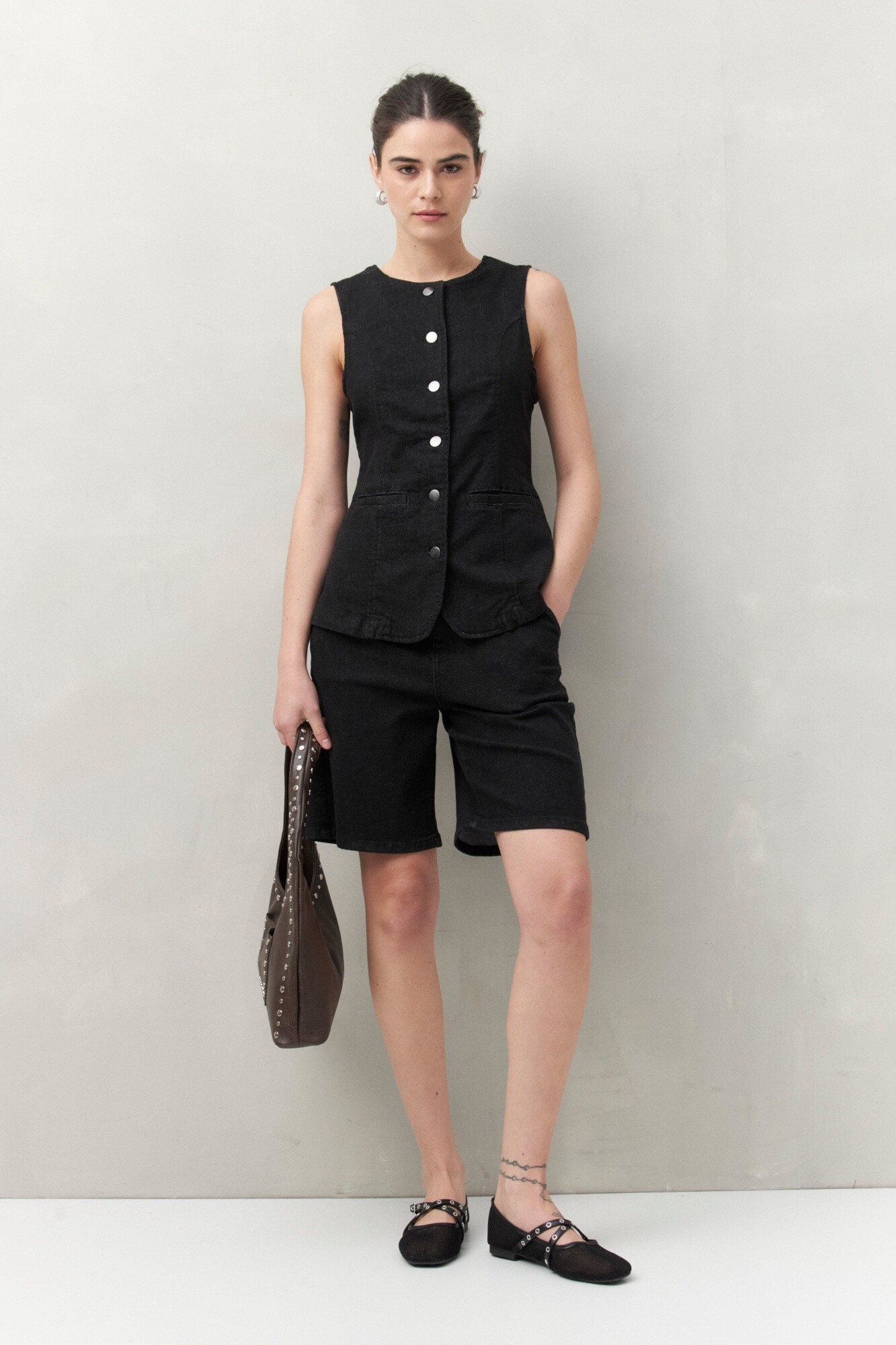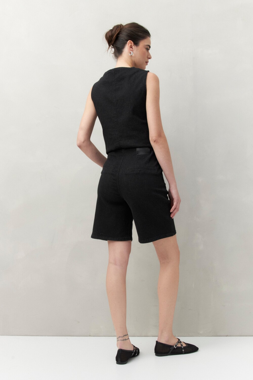 Bermuda de tiro medio con silueta recta y largo a la altura de la rodilla. Presenta bolsillos laterales y traseros, y costuras visibles que aportan un toque casual. Su calce cómodo y tejido con leve elasticidad la convierten en una prenda versátil, perfecta para looks urbanos o relajados.