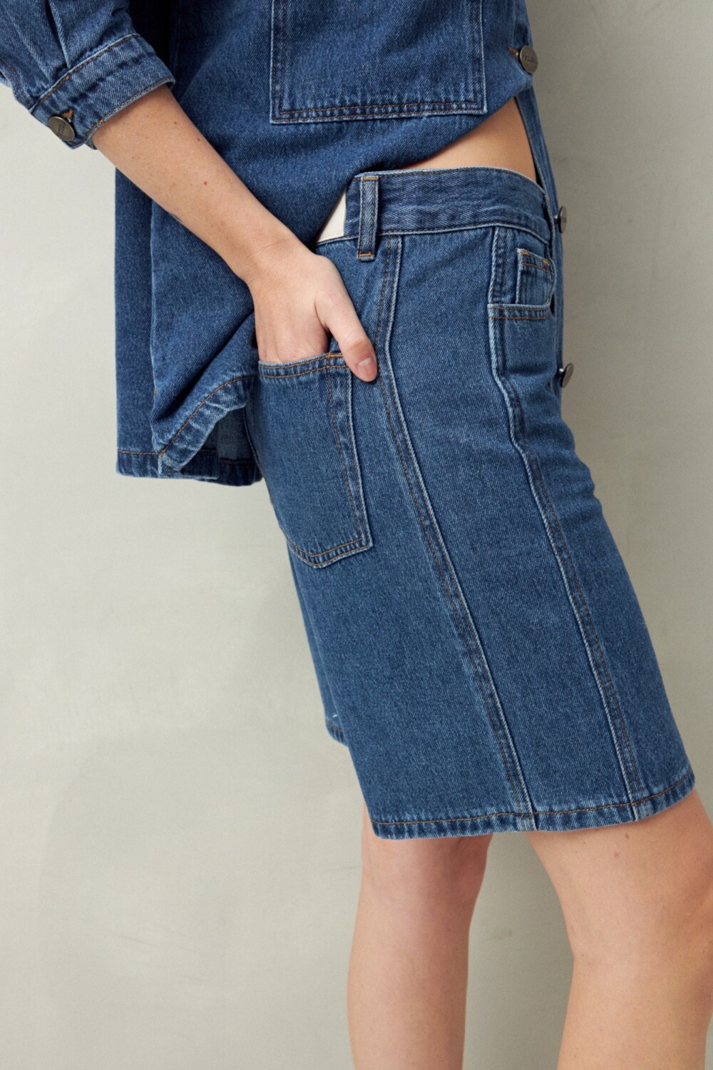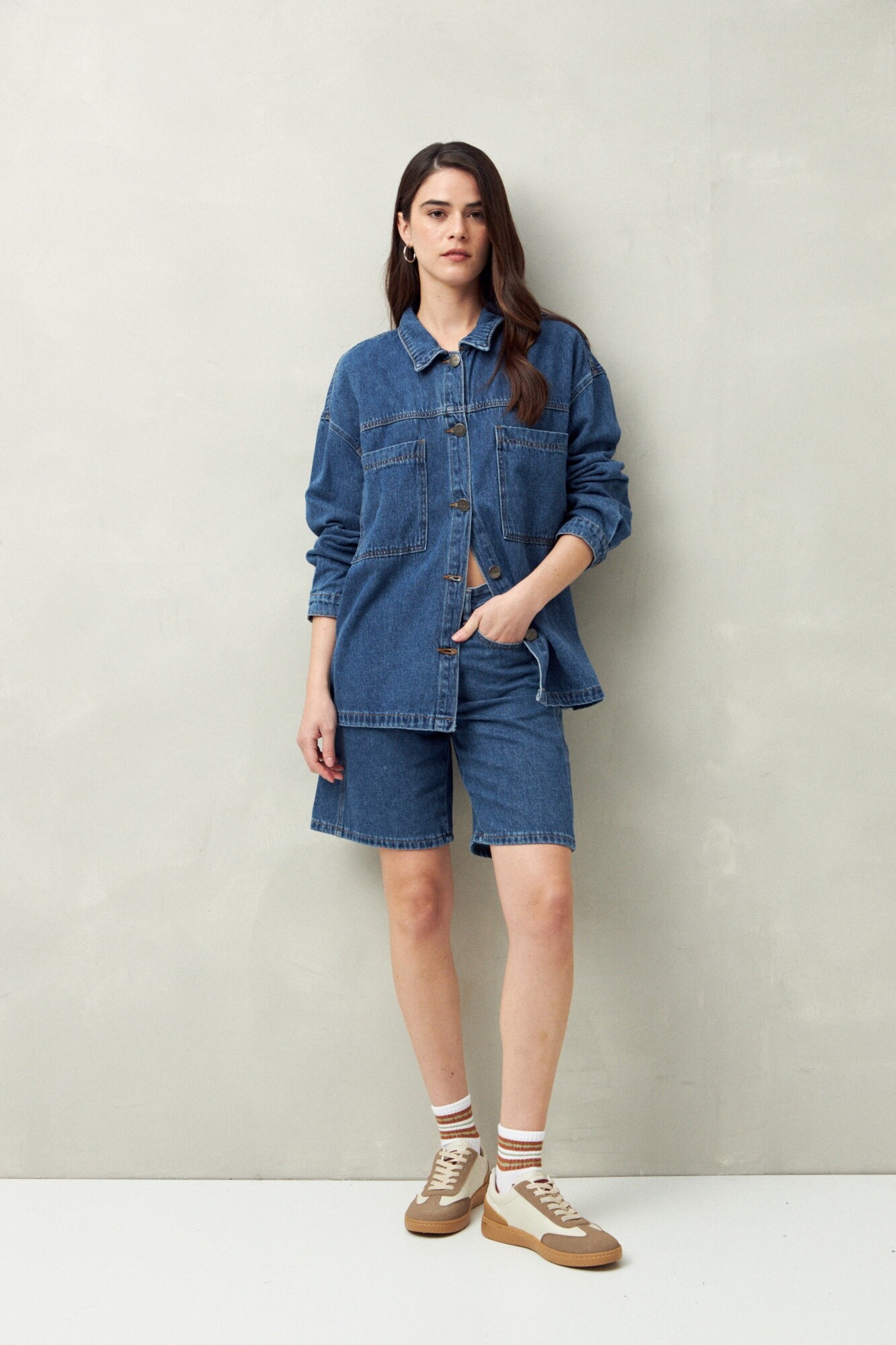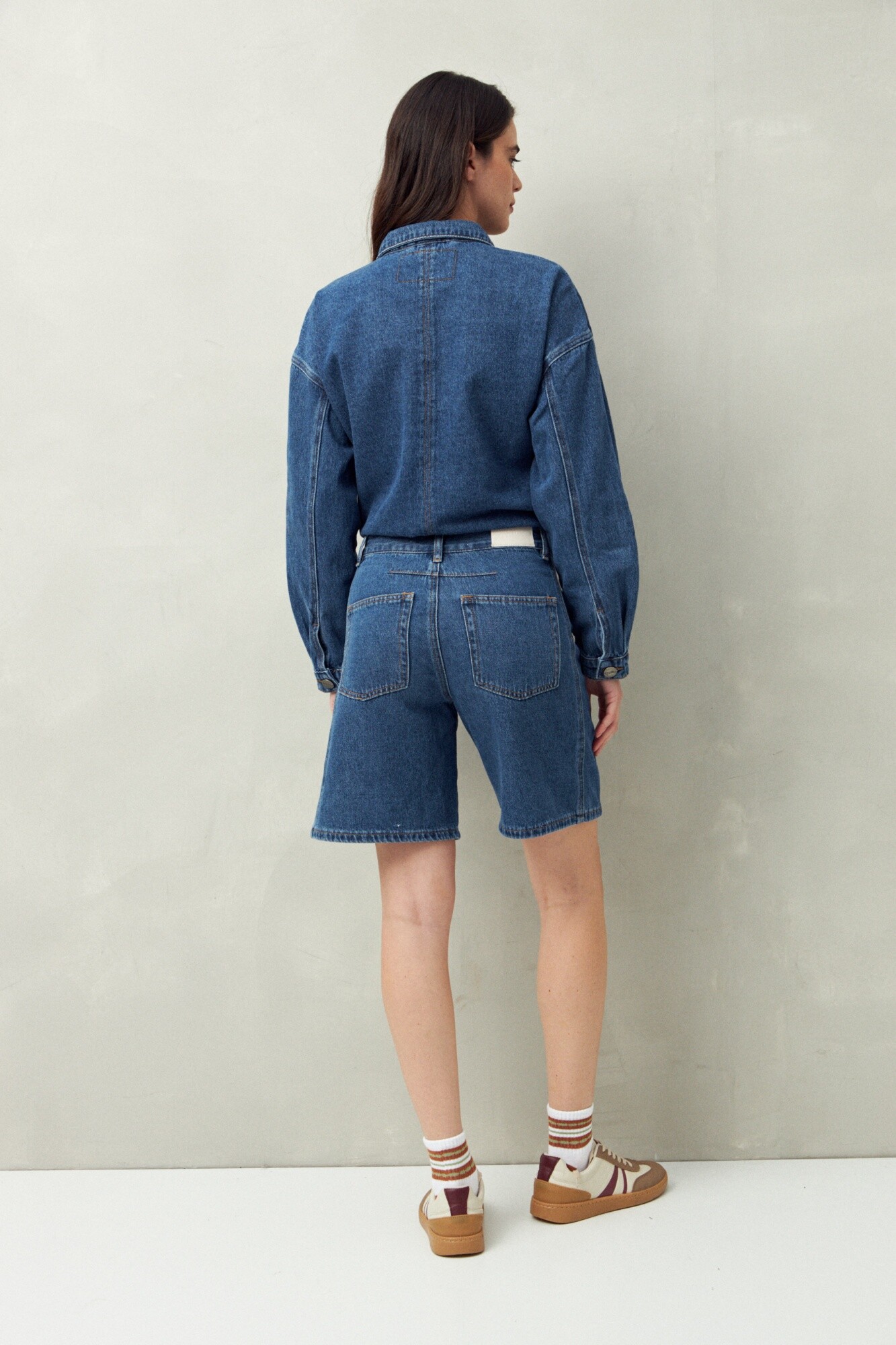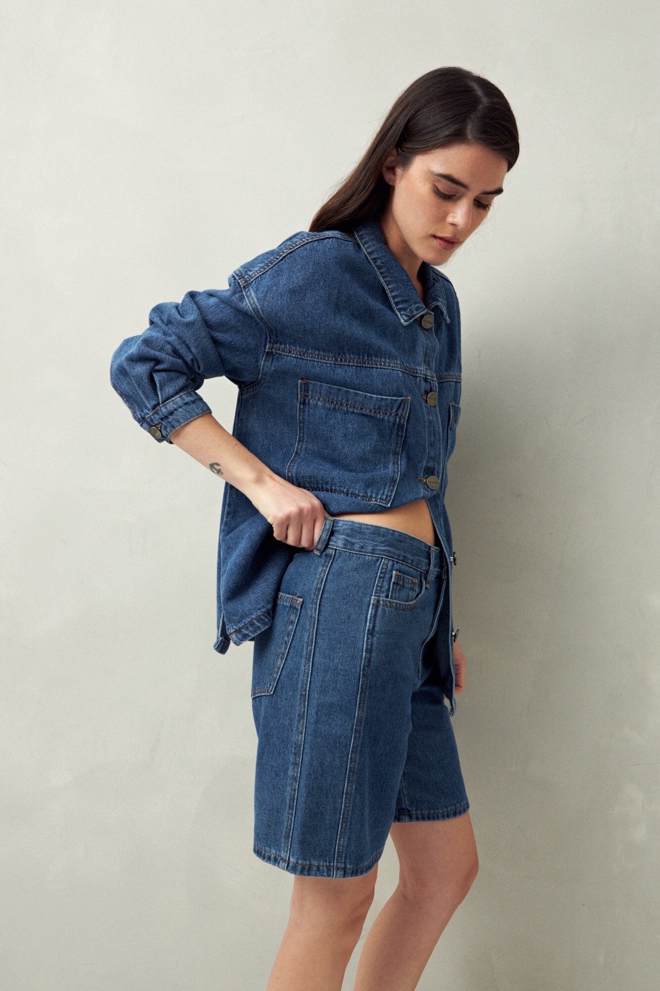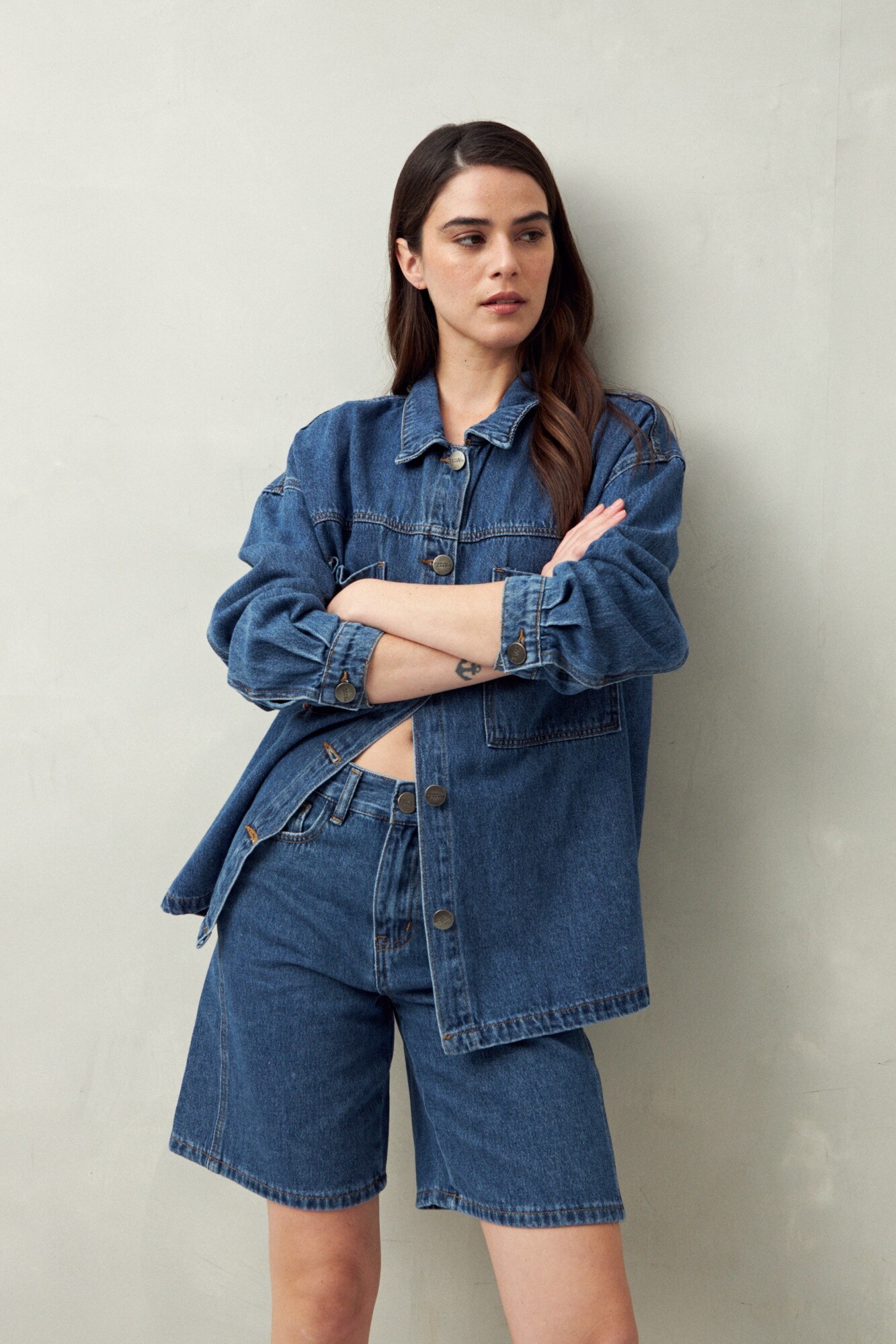 Bermuda de jean de corte clásico y largo a la rodilla, pensada para un look relajado pero con estilo! Confeccionada en algodón con un pequeño porcentaje de poliéster que aporta resistencia y mantiene la forma con el uso. Un básico versátil que podés combinar en total look con sobrecamisa de denim o integrar en outfits urbanos de temporada.