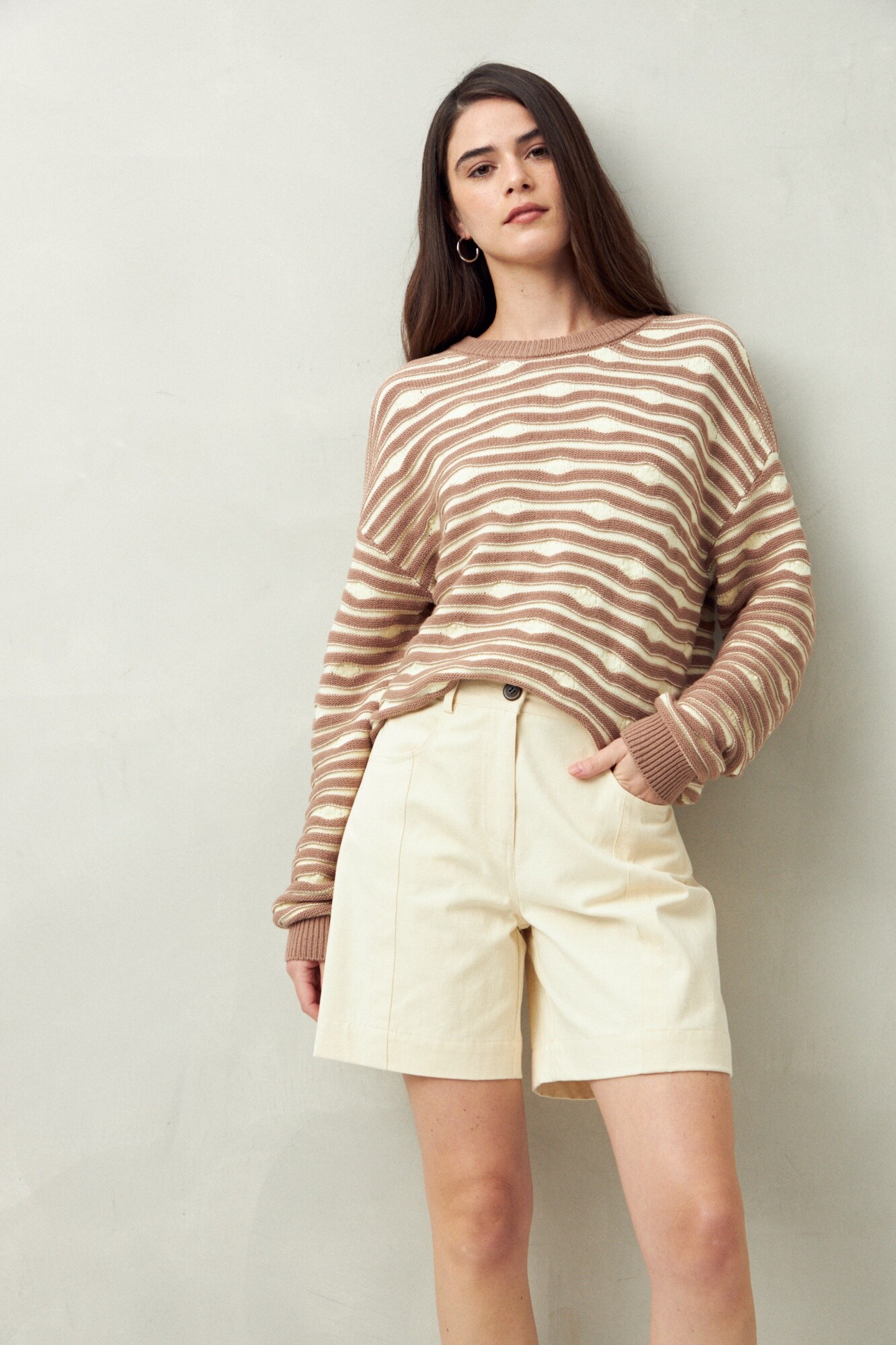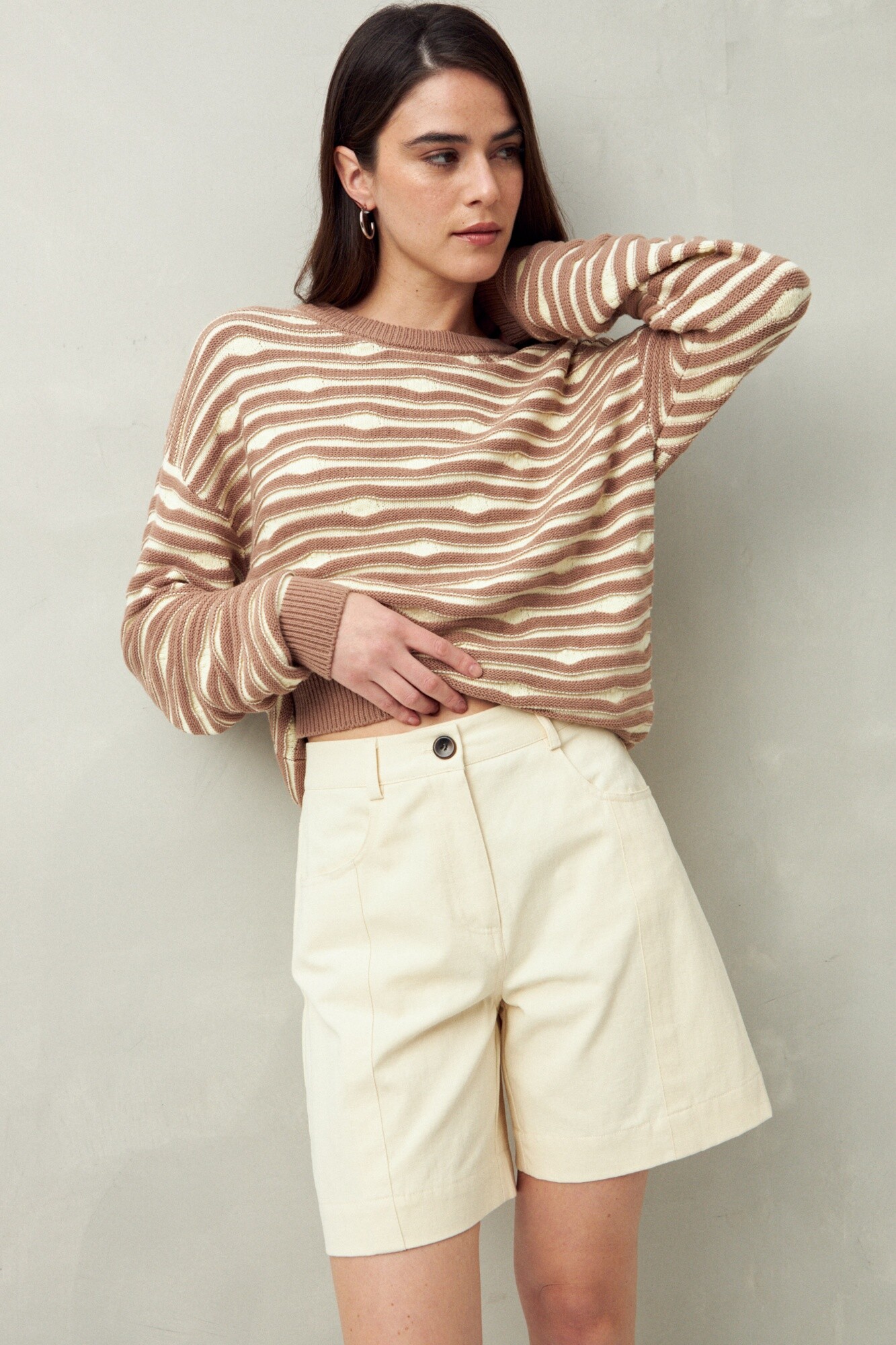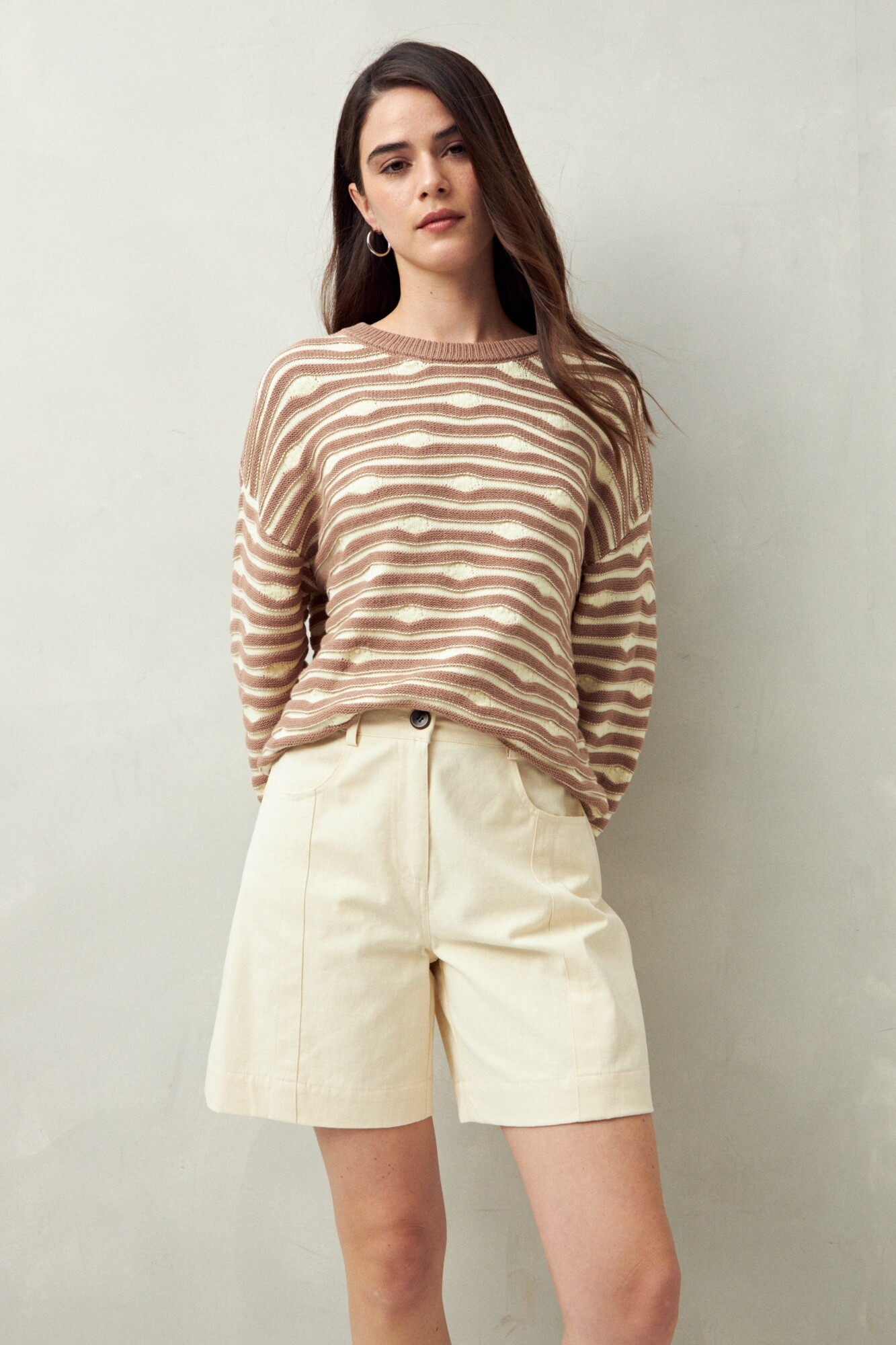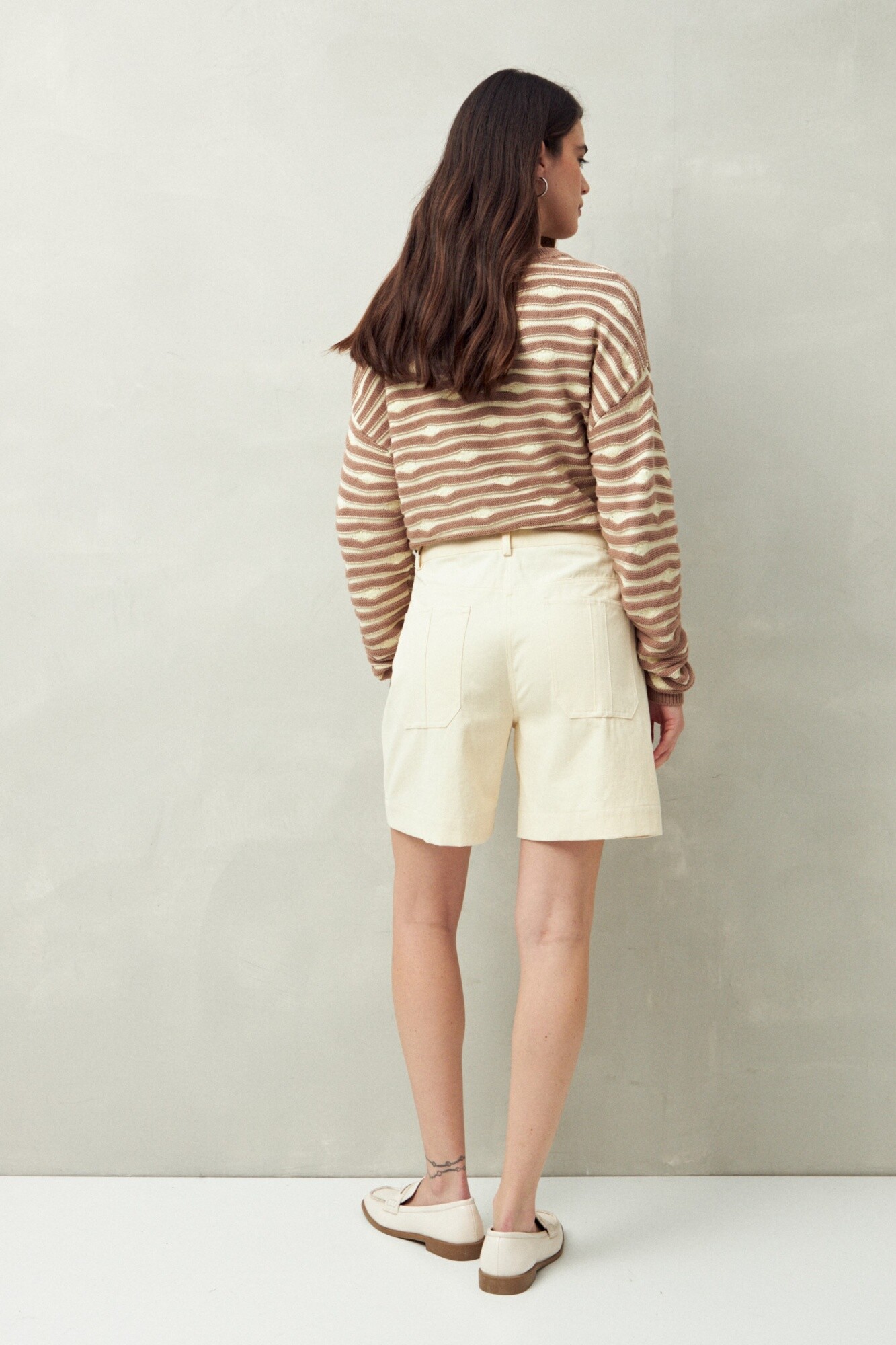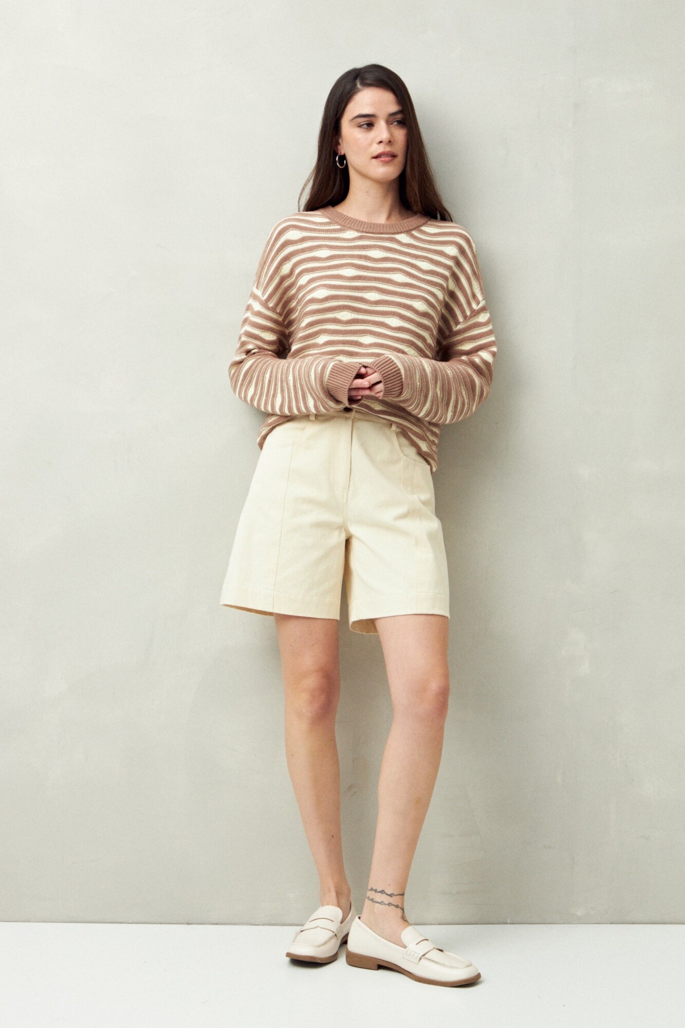 Bermuda de algodón, de tiro medio y calce relajado, diseñada para quienes buscan frescura y comodidad sin perder estilo. Su confección en tejido natural la hace ideal para el día a día.