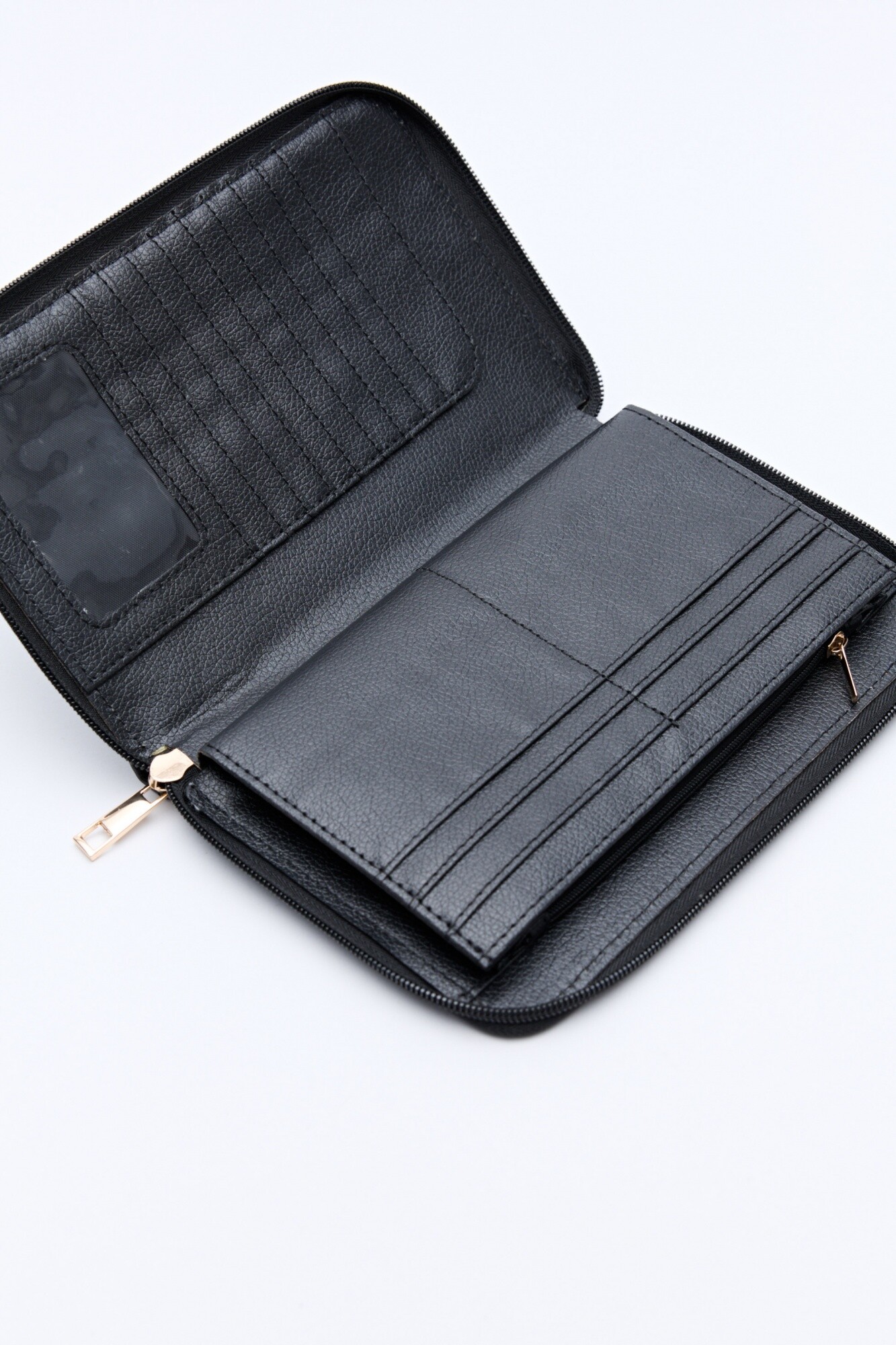 Gracias a su estructura firme y cierre perimetral, puede usarse no solo como billetera organizadora sino también como cartera tipo sobre para una fiesta o evento, elevando cualquier look con un toque elegante. En su interior cuenta con múltiples compartimentos: tarjeteros, bolsillo con cierre y divisiones amplias para billetes y documentos, manteniendo todo perfectamente ordenado.