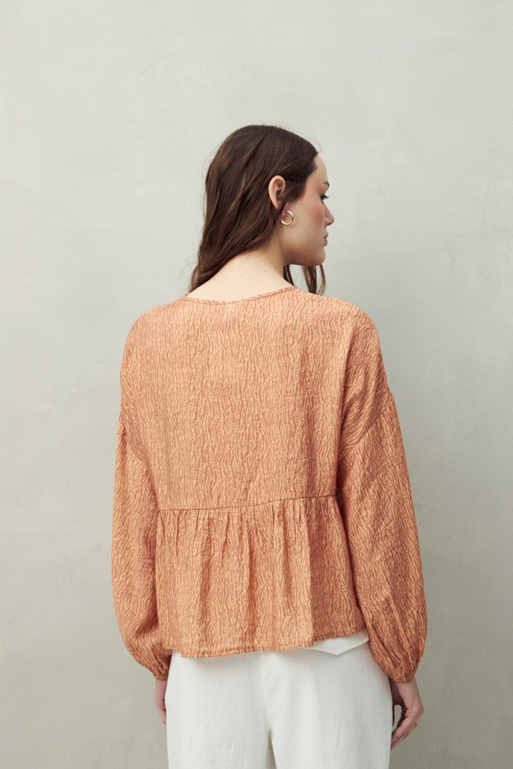 Blusa estampada de caída fluida con cuello redondo y dos lazos frontales que aportan un toque delicado y femenino. Su diseño con cortes horizontales y frunces genera un volumen sutil, mientras que las mangas largas con puños elastizados suman comodidad. Una prenda ligera y versátil, perfecta para un look relajado pero cuidado.