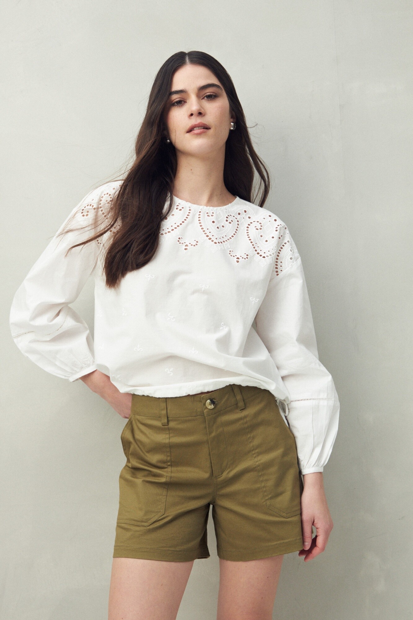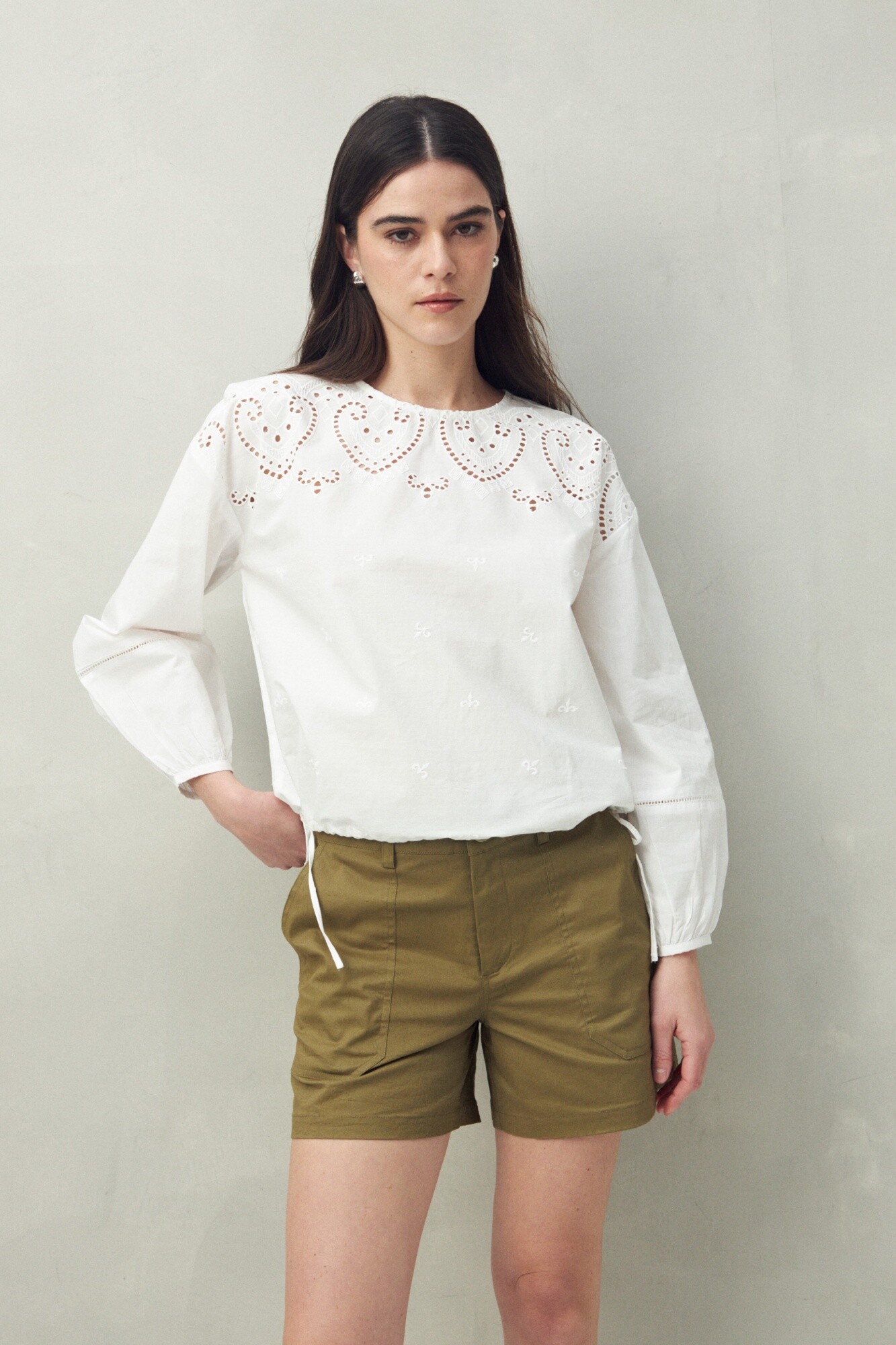Blusa de algodón con cuello a la base y delicados bordados calados en el canesú que aportan un aire artesanal y femenino. Presenta mangas largas con pequeñas aberturas lineales y ajuste con elástico en el puño, sumando comodidad y un toque sutil de volumen. El cordón en la base permite entallarla o llevarla más suelta según el estilo.
