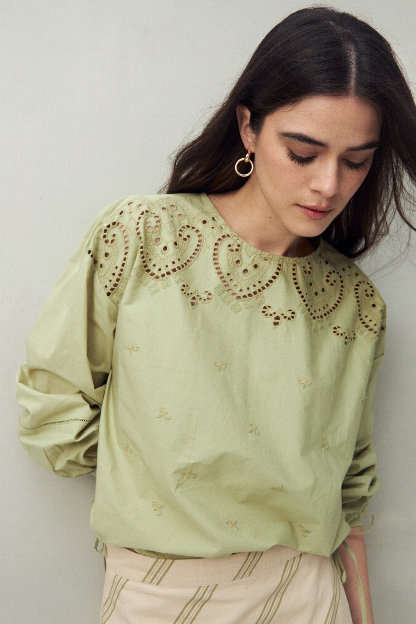 Blusa de algodón con cuello a la base y delicados bordados calados en el canesú que aportan un aire artesanal y femenino. Presenta mangas largas con pequeñas aberturas lineales y ajuste con elástico en el puño, sumando comodidad y un toque sutil de volumen. El cordón en la base permite entallarla o llevarla más suelta según el estilo.
