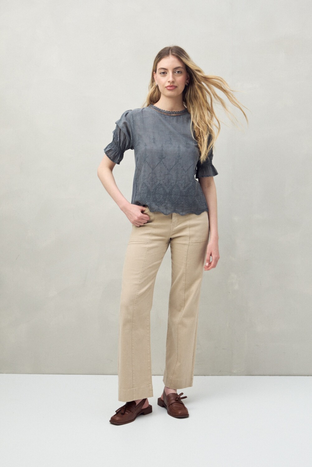Blusa 100% algodón con delicados bordados frontales y terminaciones festoneadas que aportan un aire artesanal y femenino. Su moldería relajada y mangas con frunces la convierten en una pieza ideal para sumar textura y detalle a cualquier look. Un diseño con encanto natural, perfecto para combinar con jeans o pantalones neutros.