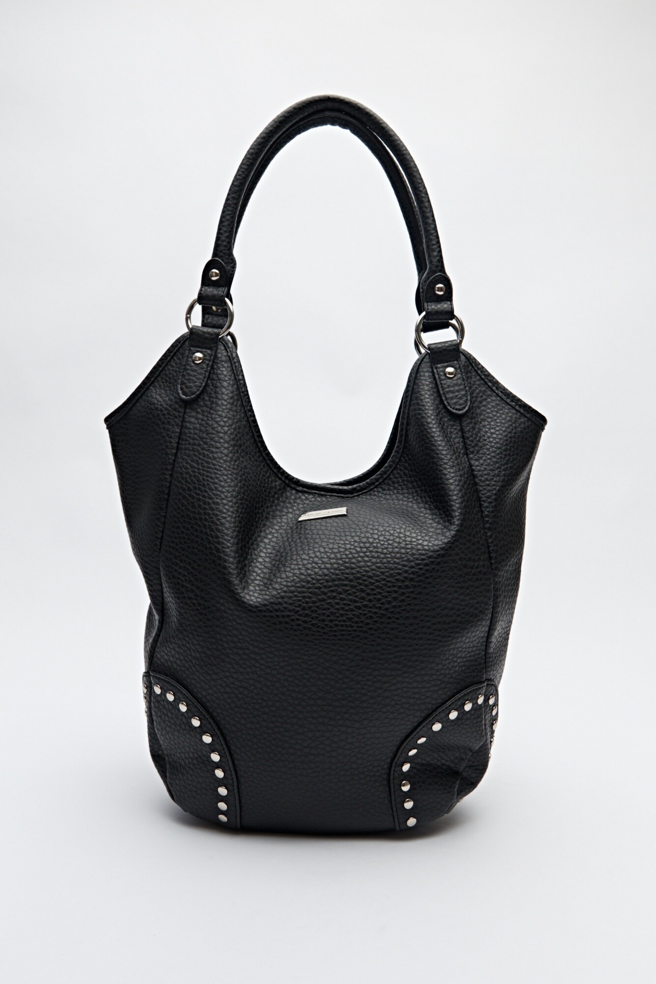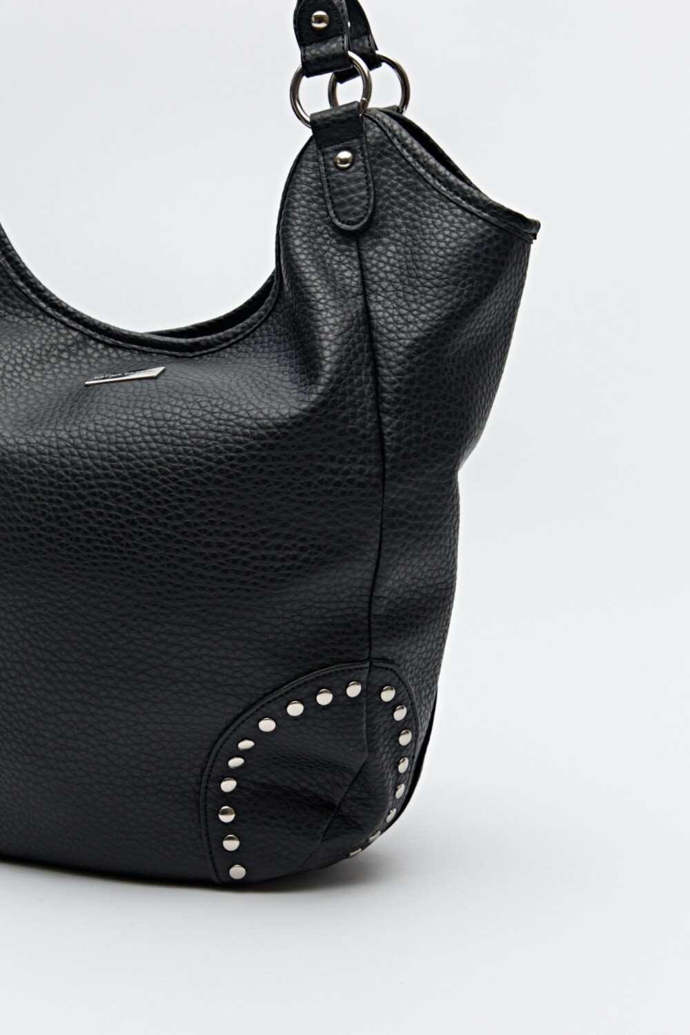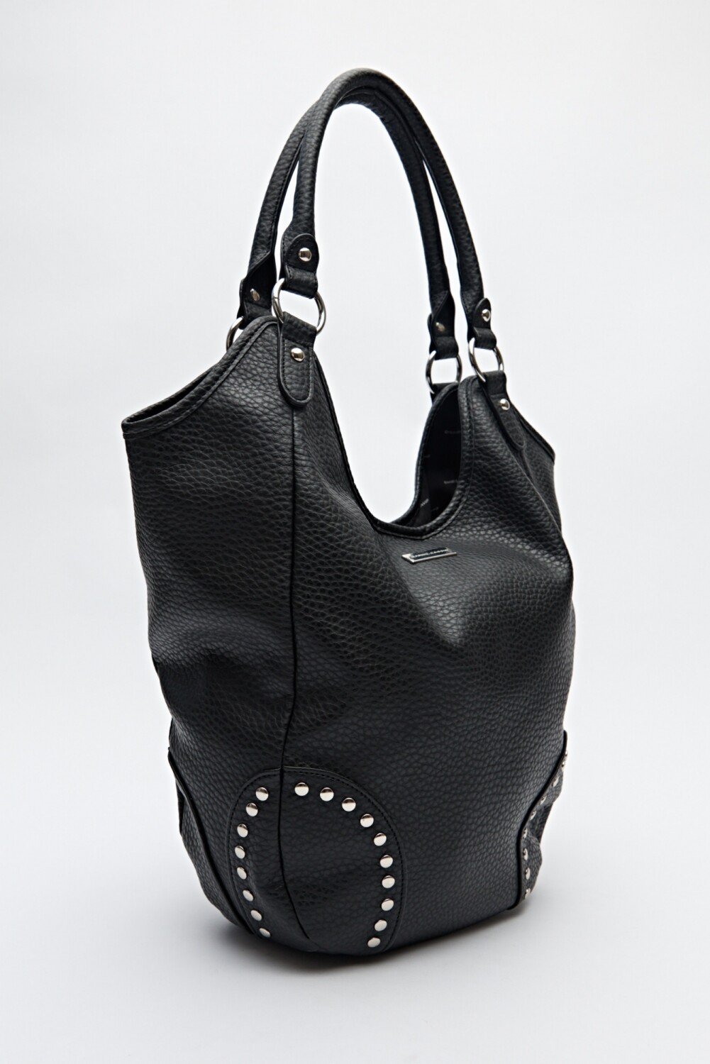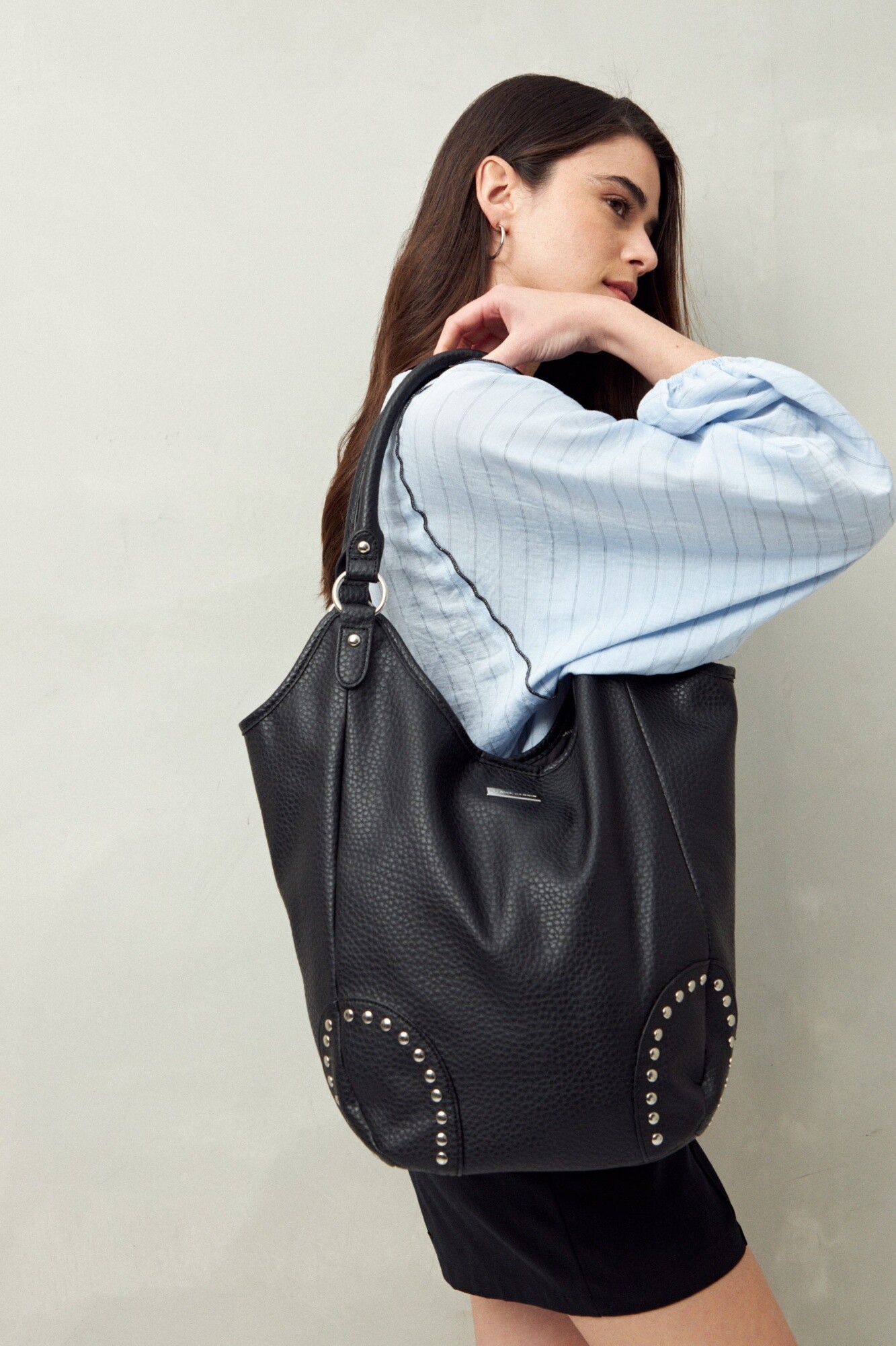 Bolso shopper en símil cuero texturizado con detalles de tachas metálicas que realzan su impronta urbana. De gran capacidad y asas resistentes, se convierte en un accesorio trendy y versátil para elevar tus looks del día a día.