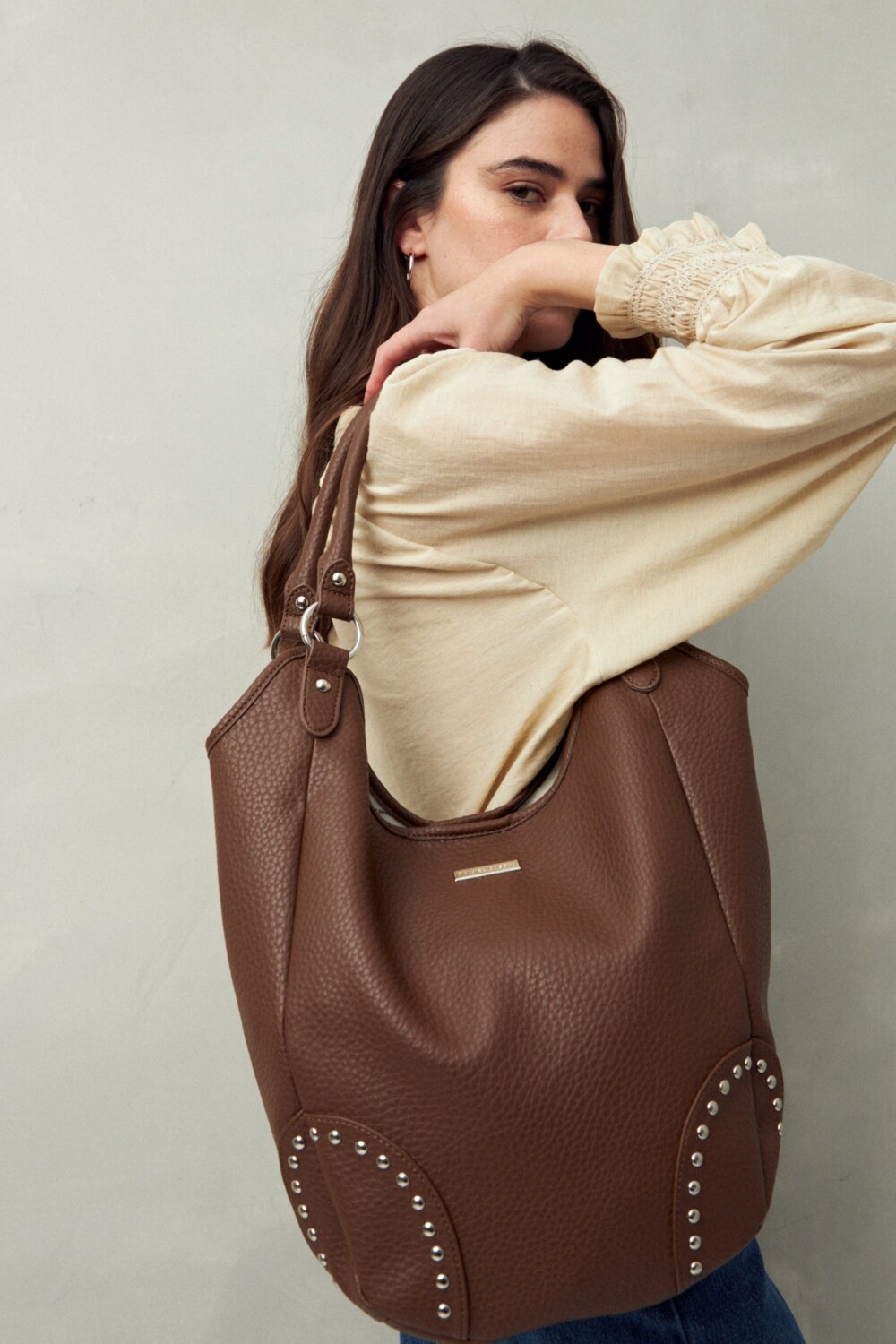 Bolso shopper en símil cuero texturizado con detalles de tachas metálicas que realzan su impronta urbana. De gran capacidad y asas resistentes, se convierte en un accesorio trendy y versátil para elevar tus looks del día a día.