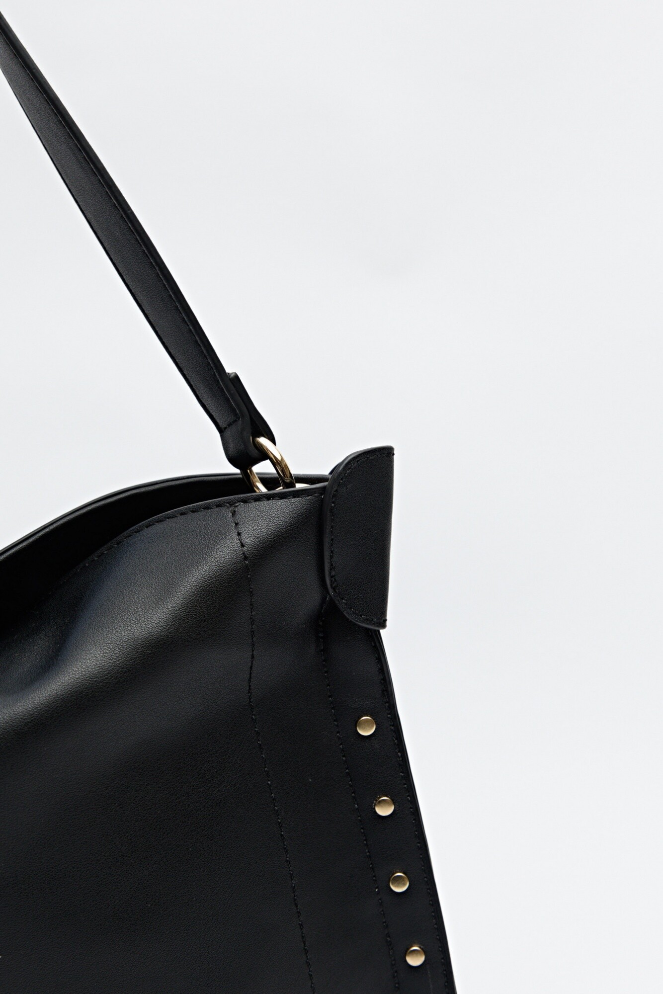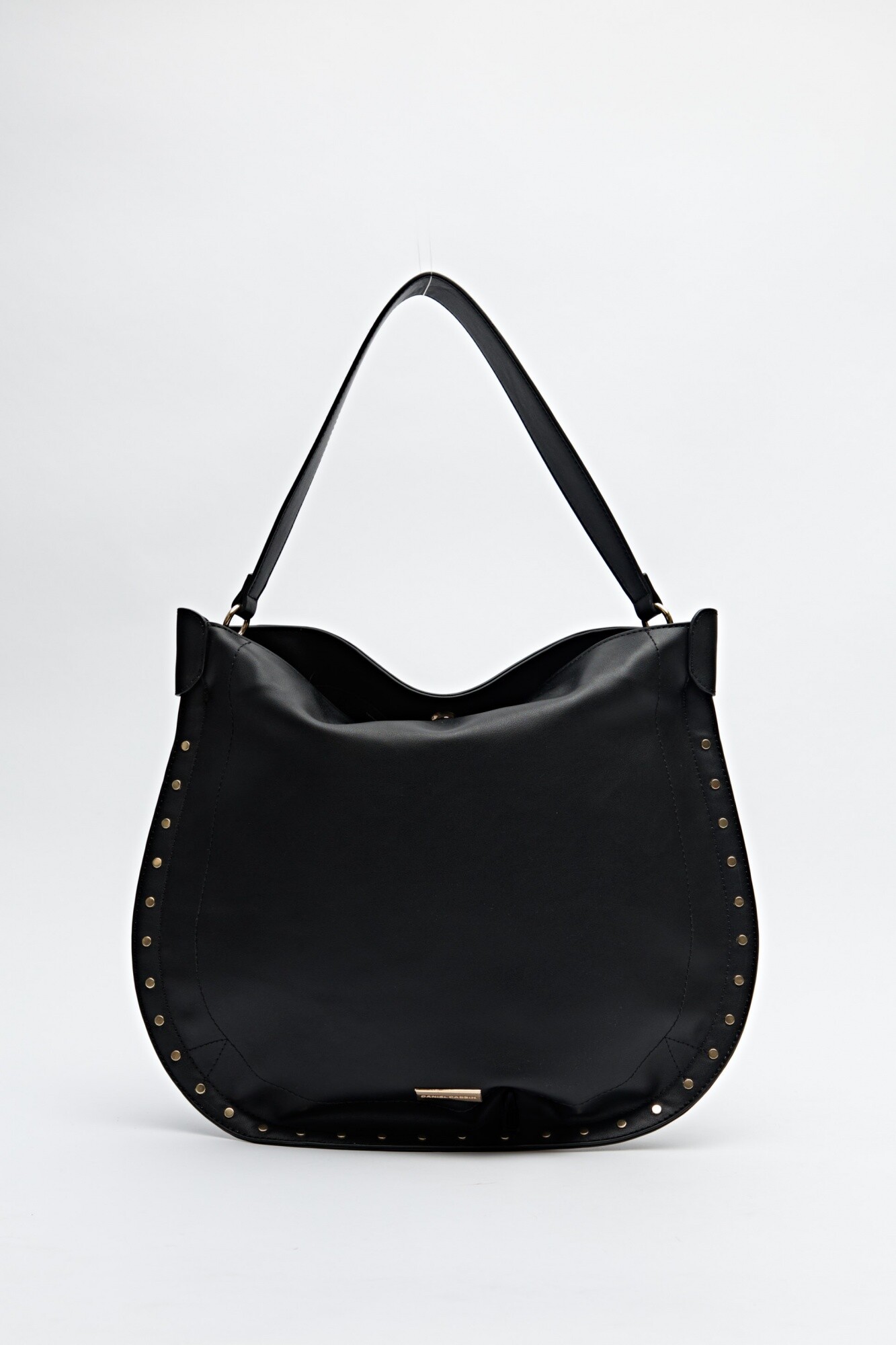 Cartera amplia en símil cuero con textura suave, diseñada en un formato curvo que resulta práctico y moderno a la vez. El detalle de tachas metálicas en los bordes le aporta un aire trendy y urbano, convirtiéndola en la pieza ideal para elevar un look casual. Su correa al hombro asegura comodidad en el uso diario, mientras que su tamaño permite llevar todo lo esencial sin perder estilo.