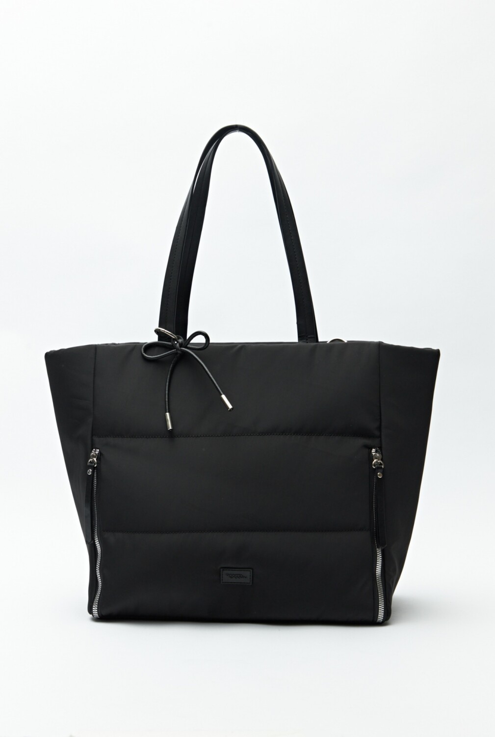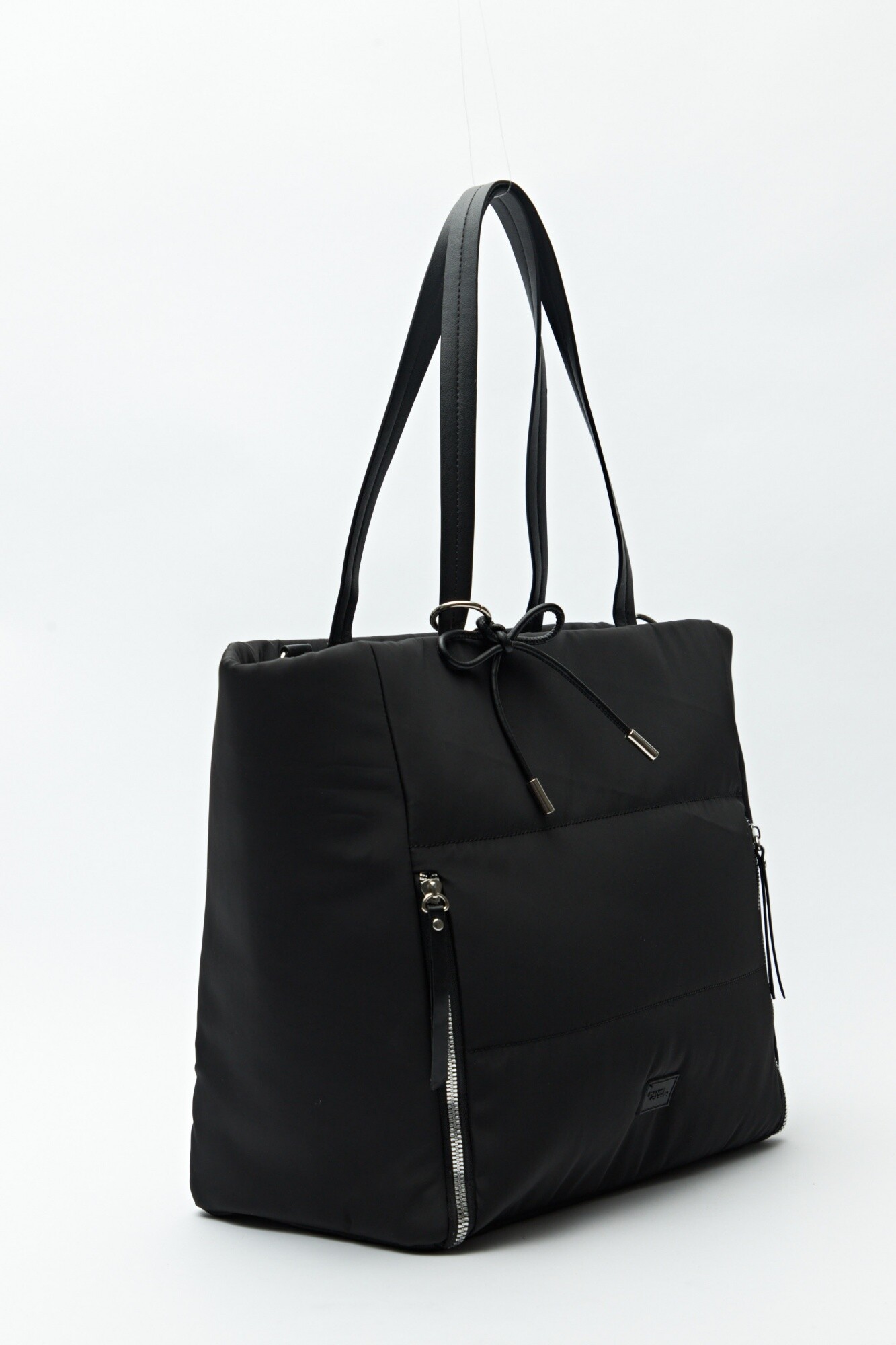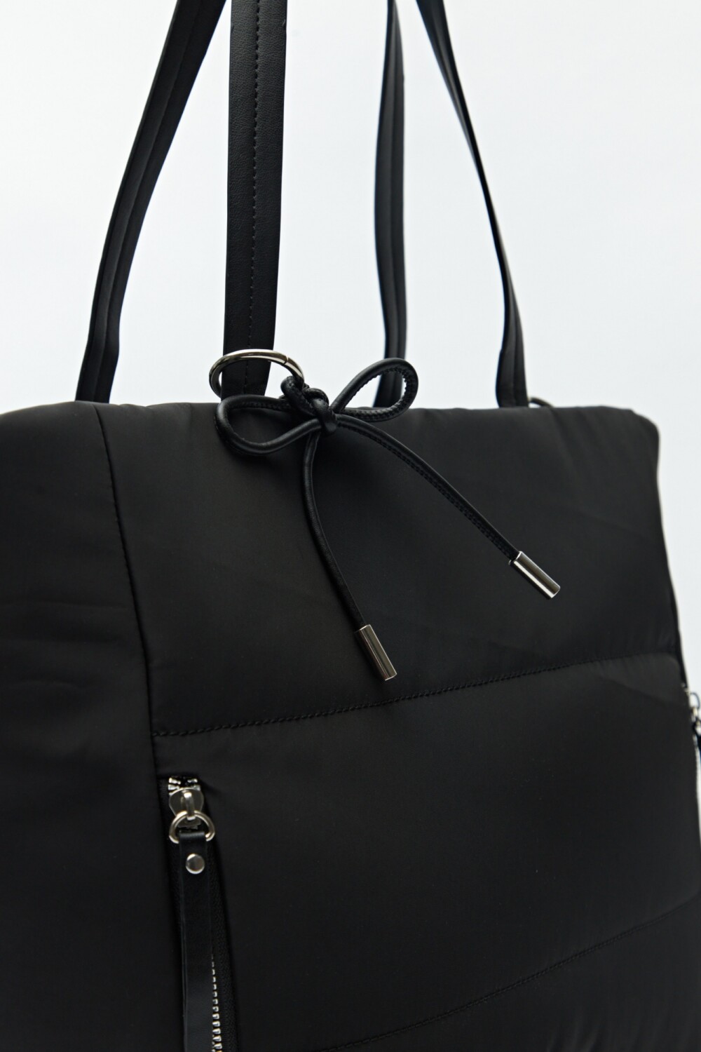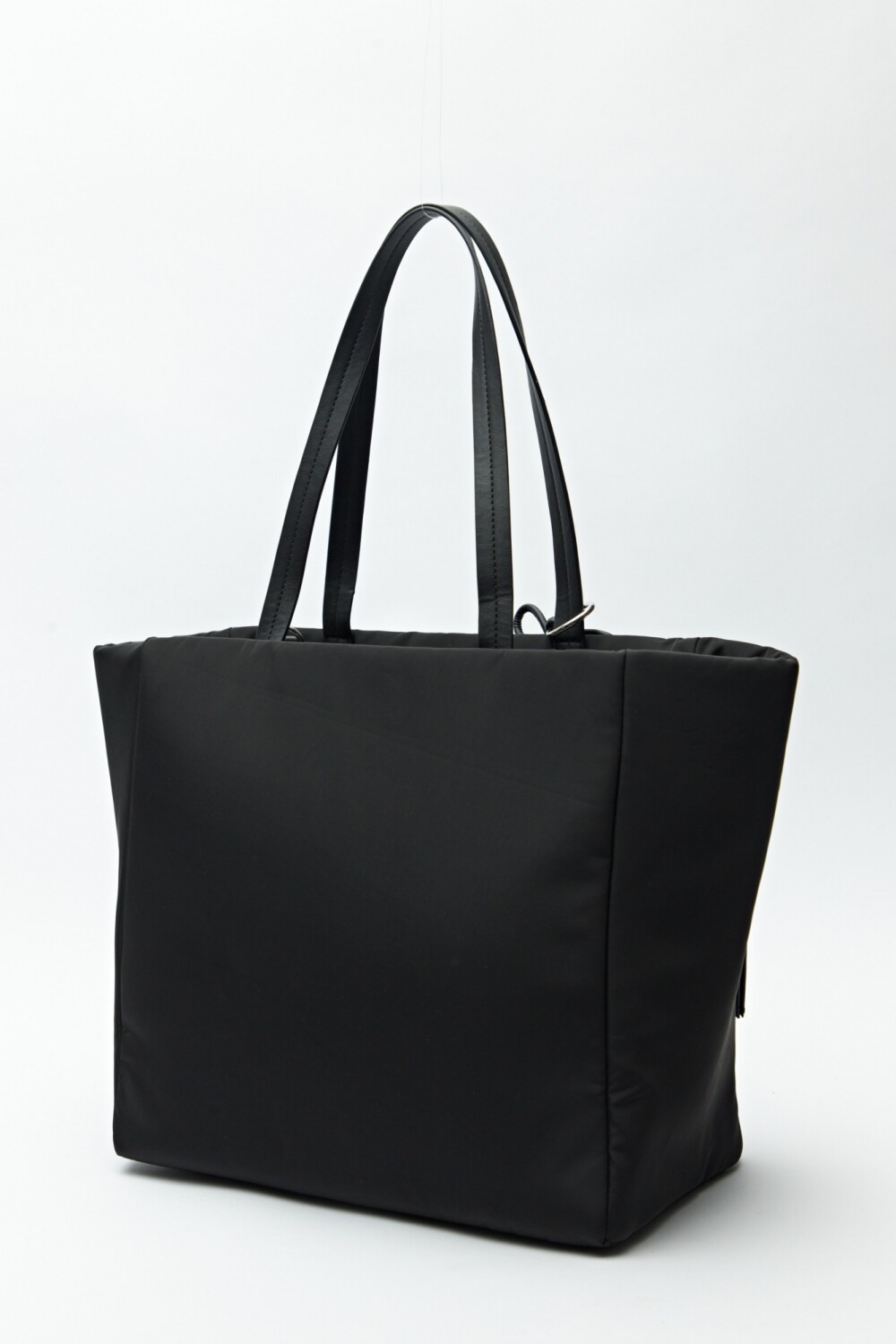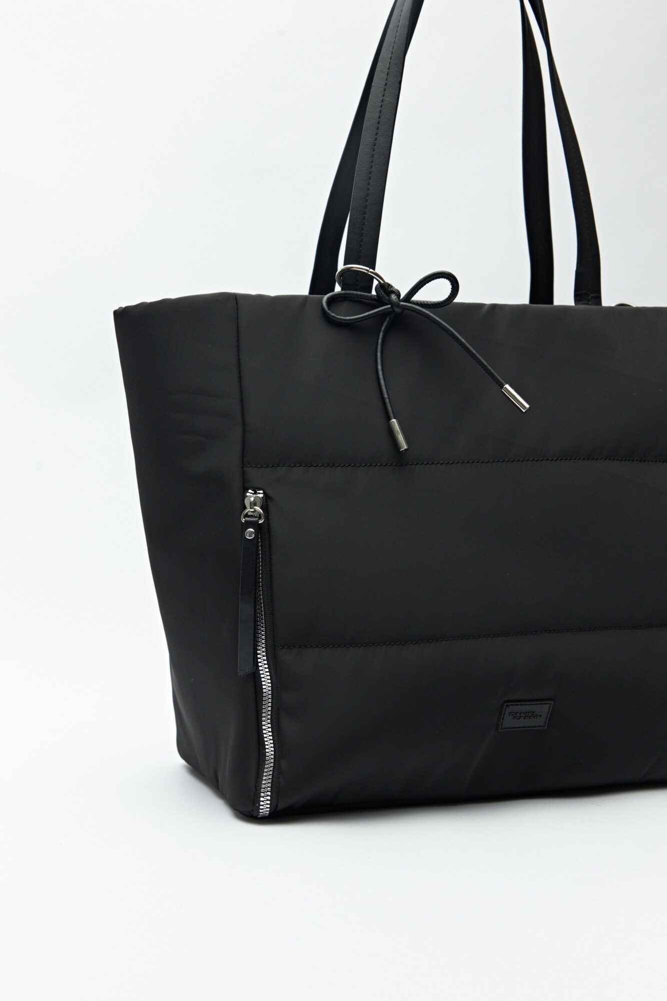 Bolso tote de nylon con diseño acolchado, ideal para sumar un aire sporty chic a tu look urbano. Sus asas largas permiten llevarlo cómodamente al hombro, mientras que los cierres metálicos laterales y el detalle de cordón le dan un toque moderno y funcional. Espacioso y versátil, perfecto para acompañarte tanto en la rutina diaria como en viajes cortos.