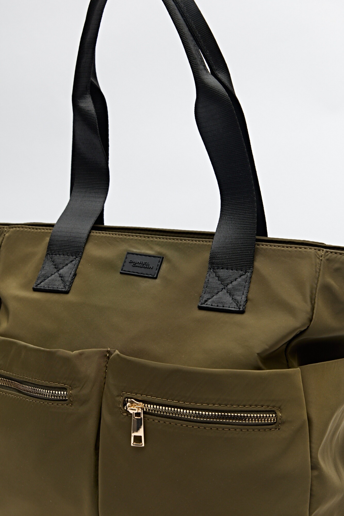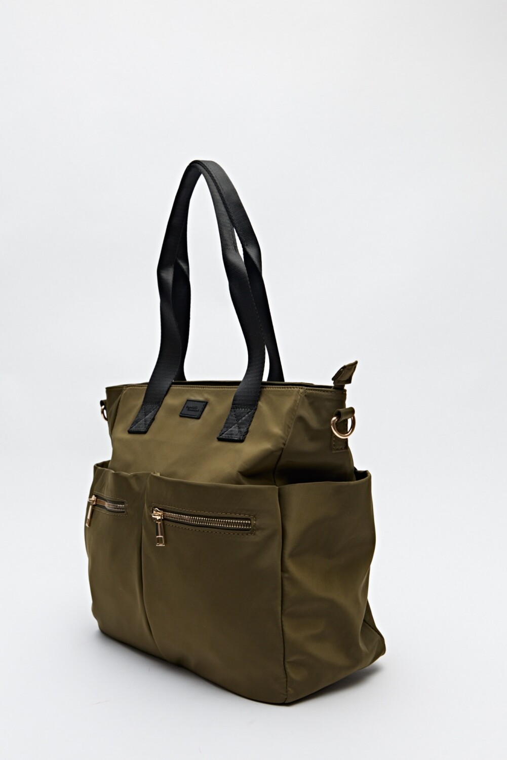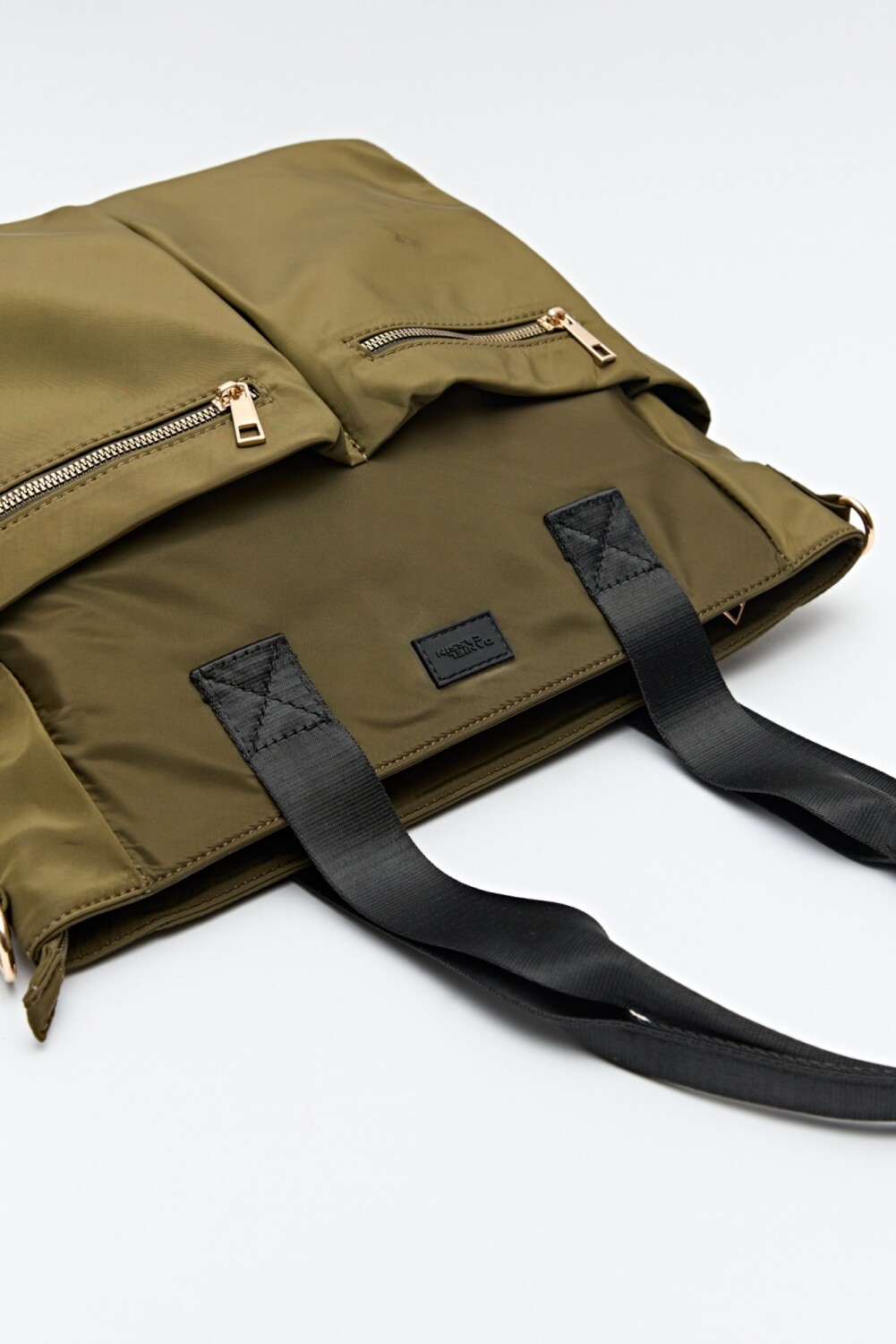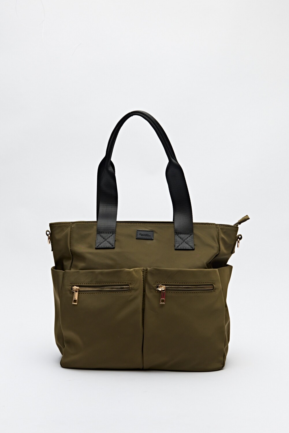 Cartera estilo tote confeccionada en nylon, pensada para acompañarte en la rutina diaria con practicidad y estilo. Su diseño amplio incluye bolsillos frontales con cierre metálico, asas resistentes y correa regulable y desmontable para llevar al hombro o cruzada. Perfecta para sumar un toque urbano y funcional a tus looks.