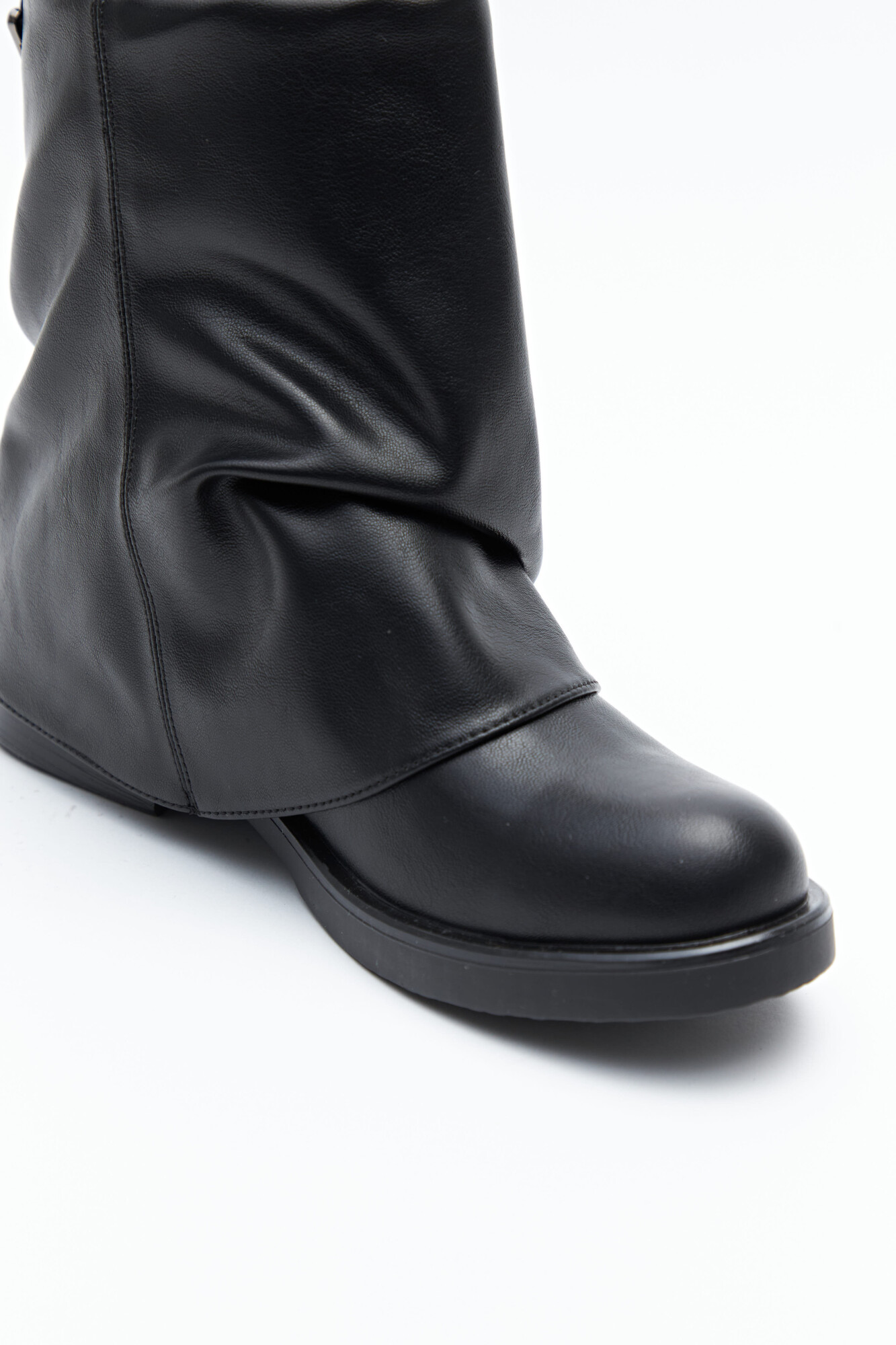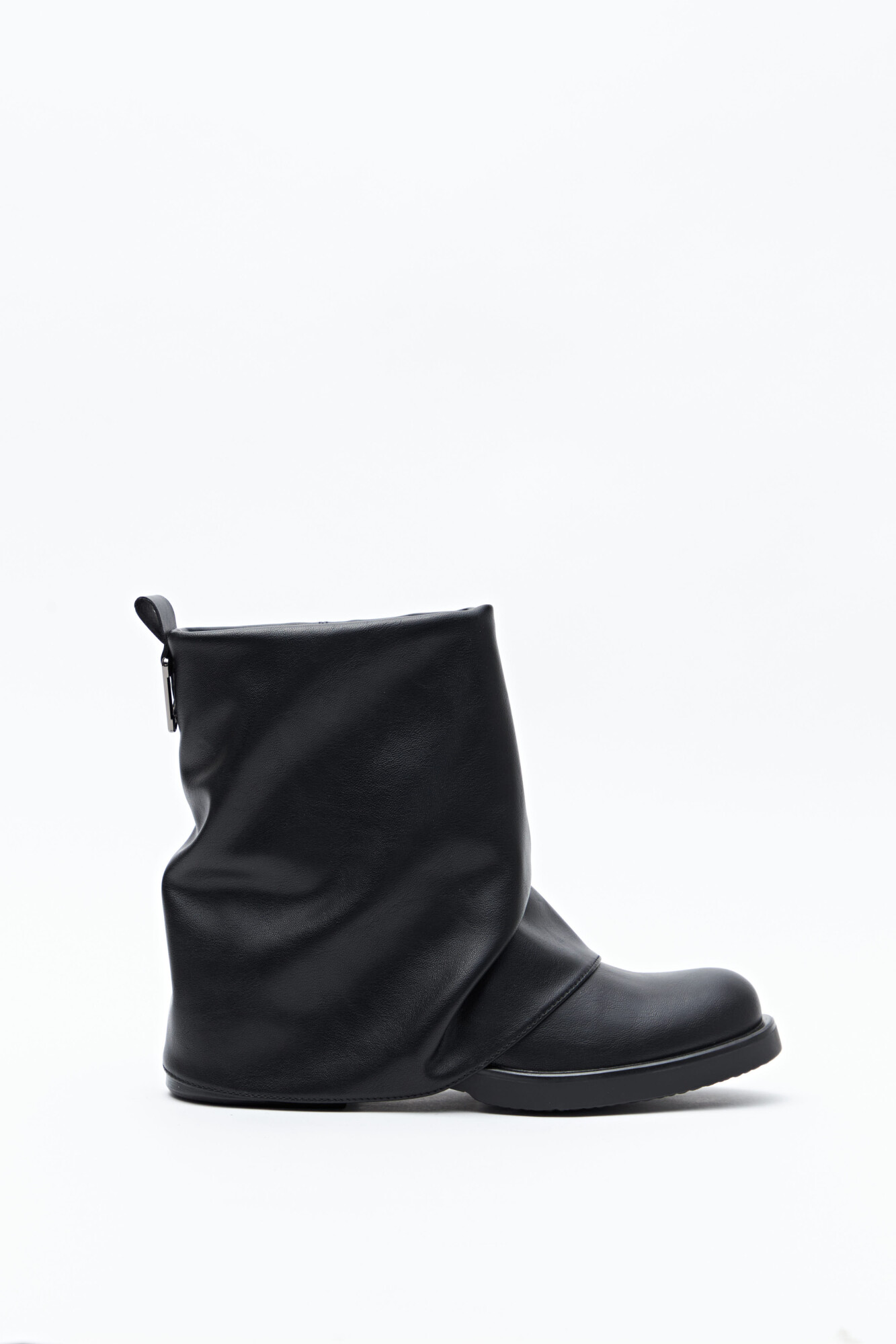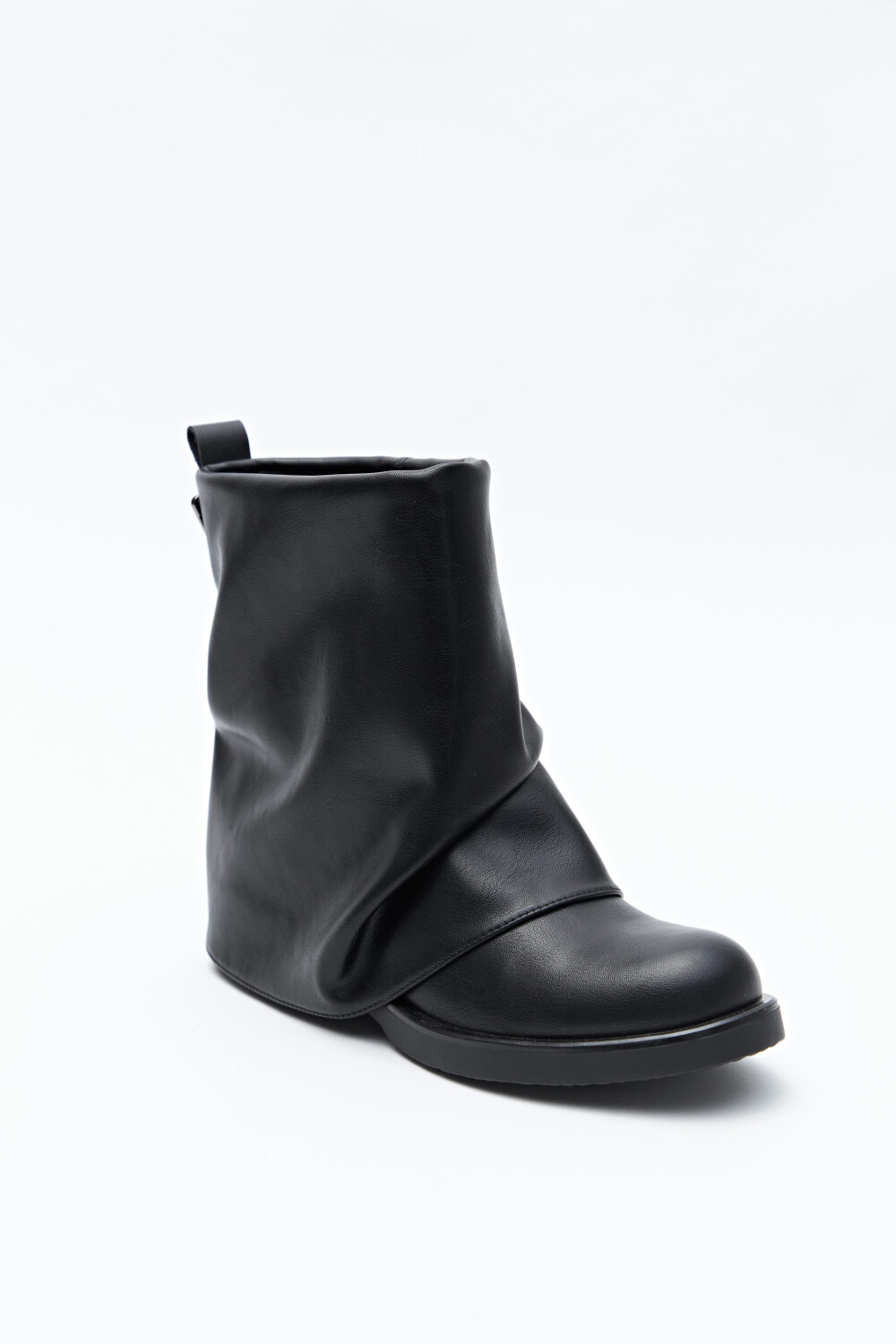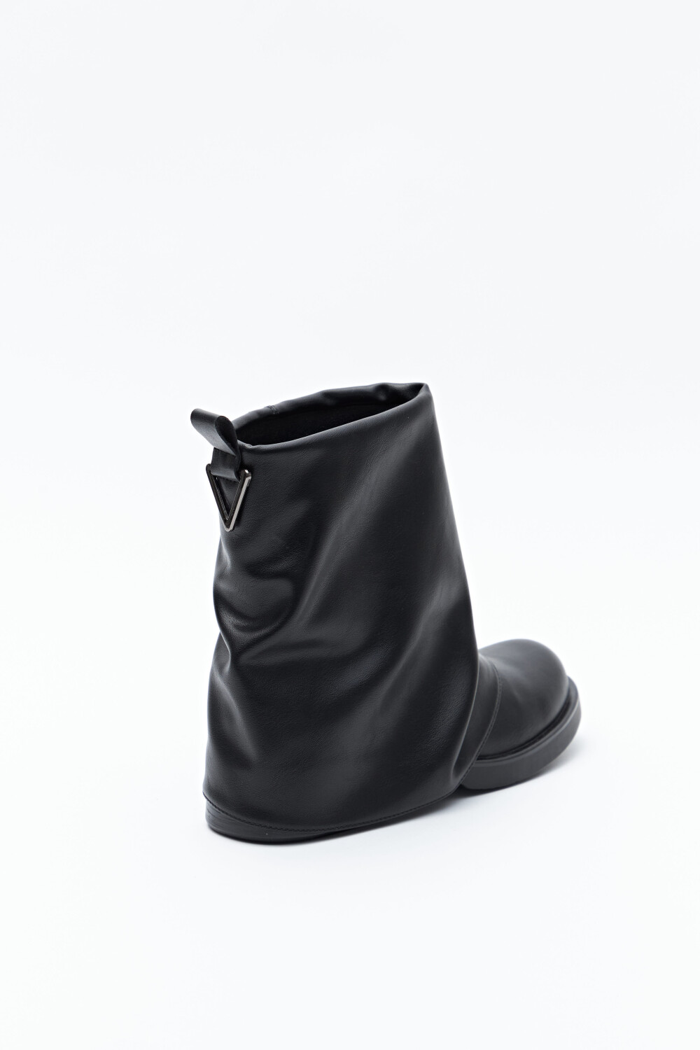 Bota de caña baja de diseño minimal, confeccionada en poliuretano de acabado liso y estructura flexible que genera un efecto levemente fruncido. Presenta puntera redondeada, base baja y detalle metálico sutil en la caña que suma carácter sin recargar. En línea con las tendencias de calzado 2026, las siluetas relajadas, limpias y con herrajes discretos se consolidan como piezas clave del guardarropa urbano, ideales para elevar cualquier look.