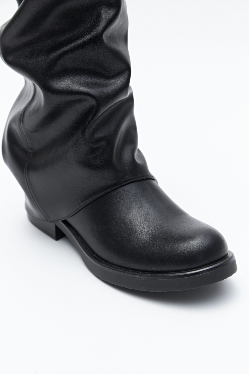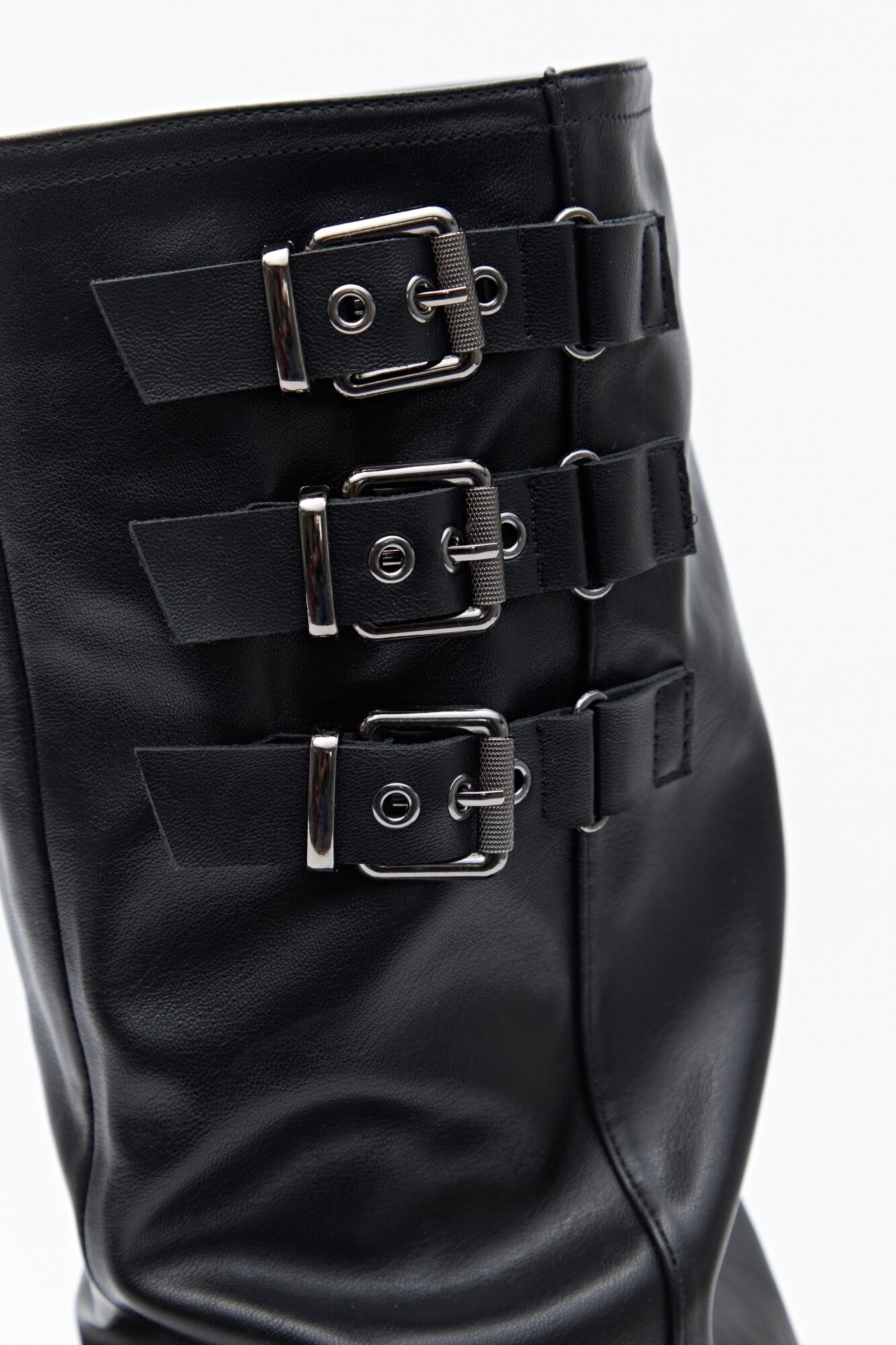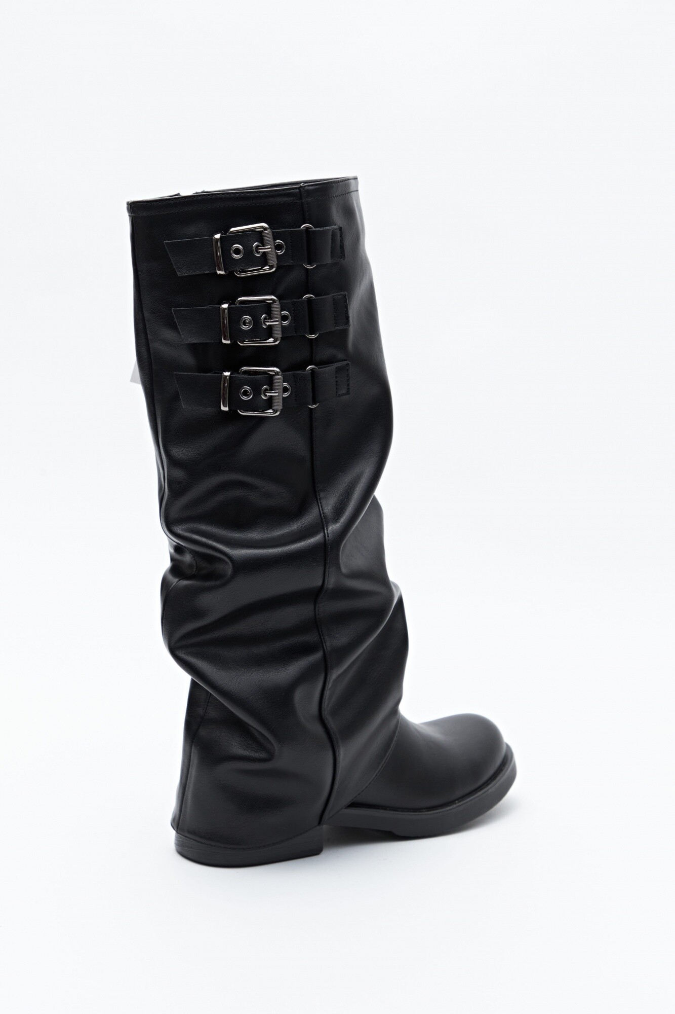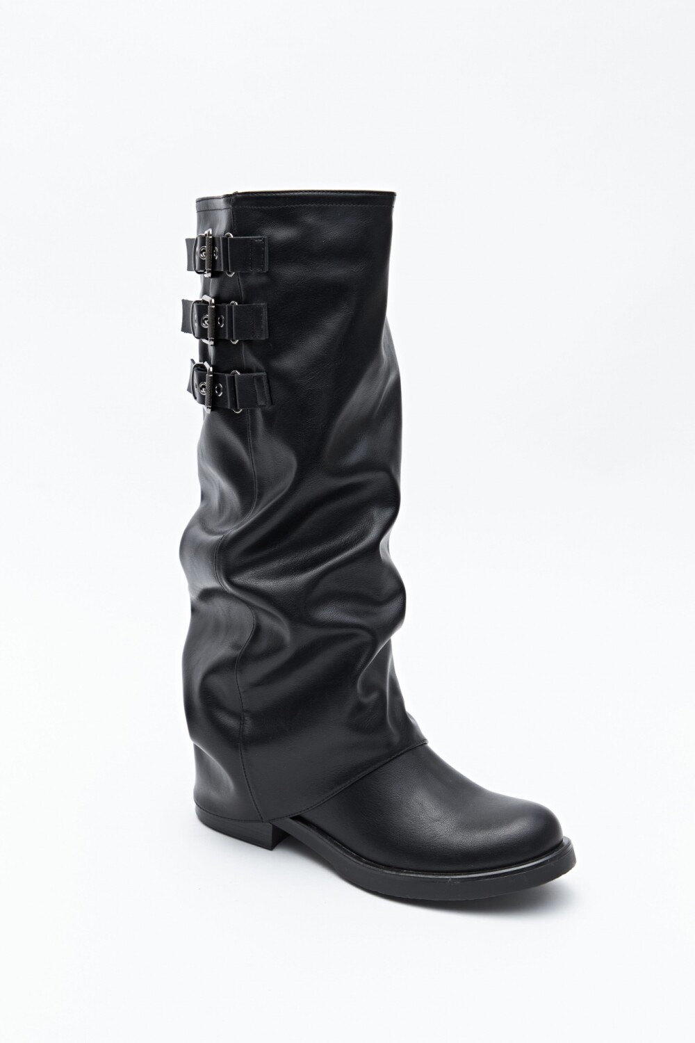 Bota de caña alta con diseño utilitario, confeccionada en poliuretano de acabado liso y estructura flexible que acompaña el movimiento. Presenta puntera redondeada, taco bajo y detalle de tres hebillas metálicas que aportan carácter y presencia. En línea con las tendencias de calzado 2026, las botas altas con siluetas relajadas, efecto fruncido y herrajes visibles se consolidan como piezas clave del guardarropa urbano, ideales para elevar cualquier look.