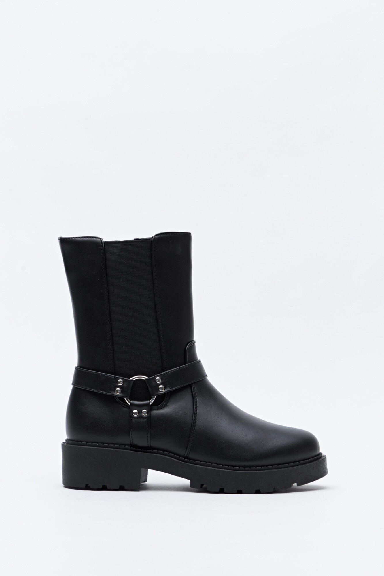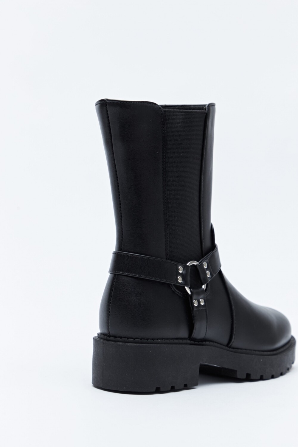 Botas tipo biker en símil cuero, de silueta robusta y espíritu urbano, inspiradas en el clásico calzado motero que se convirtió en un ícono de estilo desde mediados del siglo XX. Su diseño combina una caña media con panel elastizado lateral que facilita el calce y aporta comodidad, mientras que el arnés decorativo con herraje metálico suma carácter y un guiño rockero. La suela gruesa dentada refuerza su estética fuerte y moderna, convirtiéndolas en un calzado versátil que acompaña desde looks casuales hasta combinaciones más audaces.