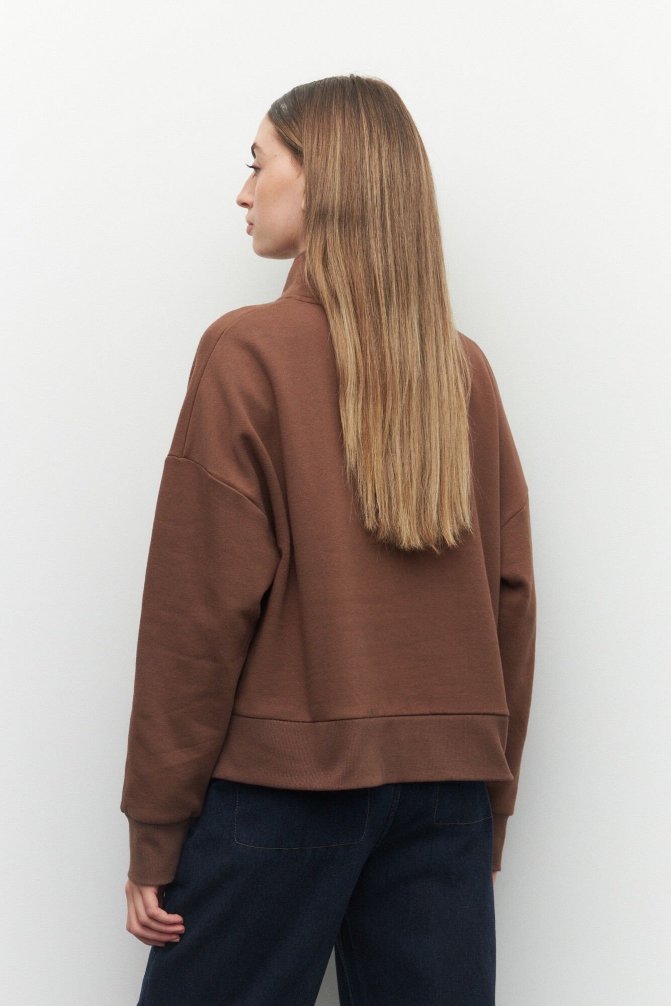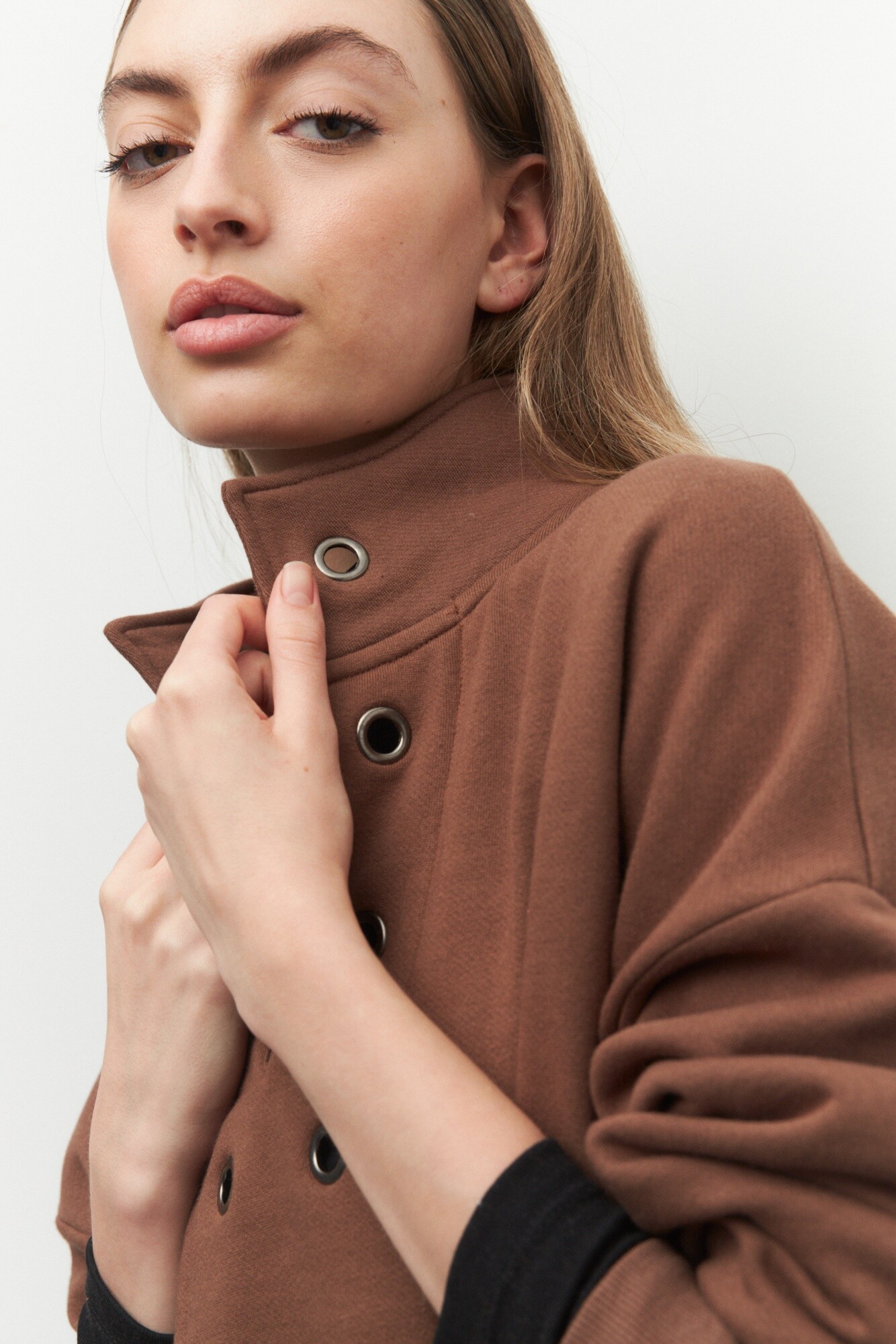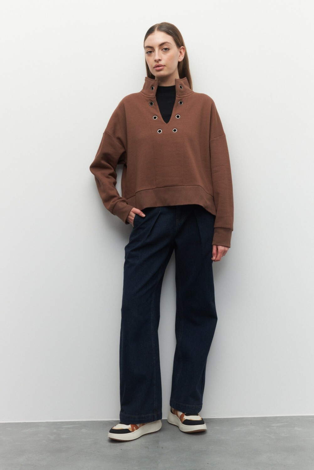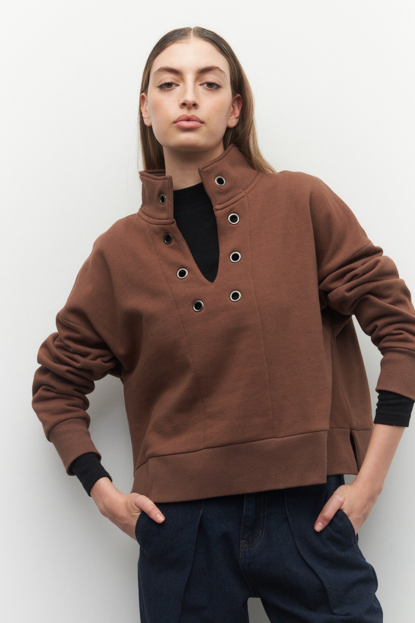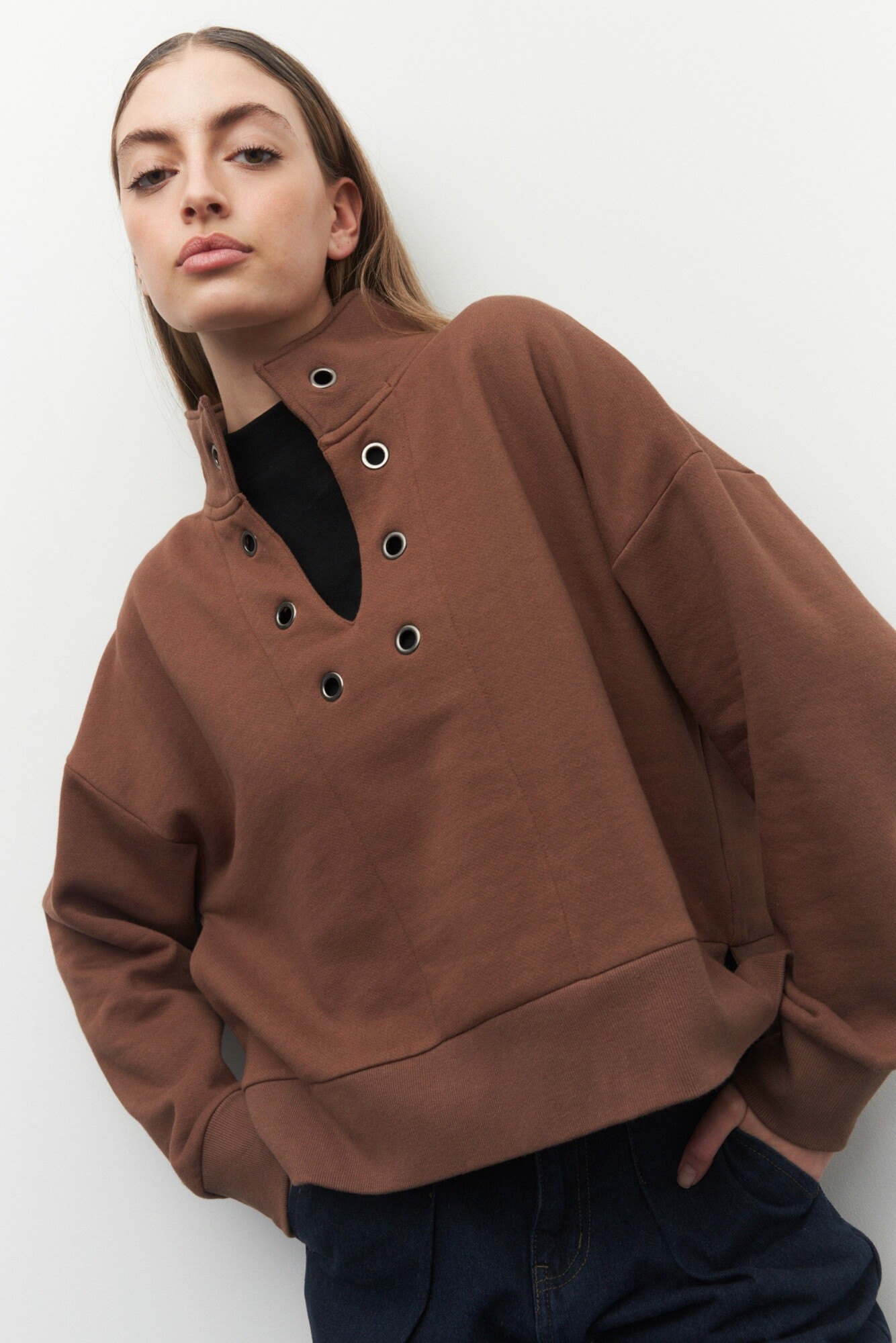 Buzo de algodón y cuello alto con apliques de argollas metálicas como detalle. De manga larga, cómodo y cozy.