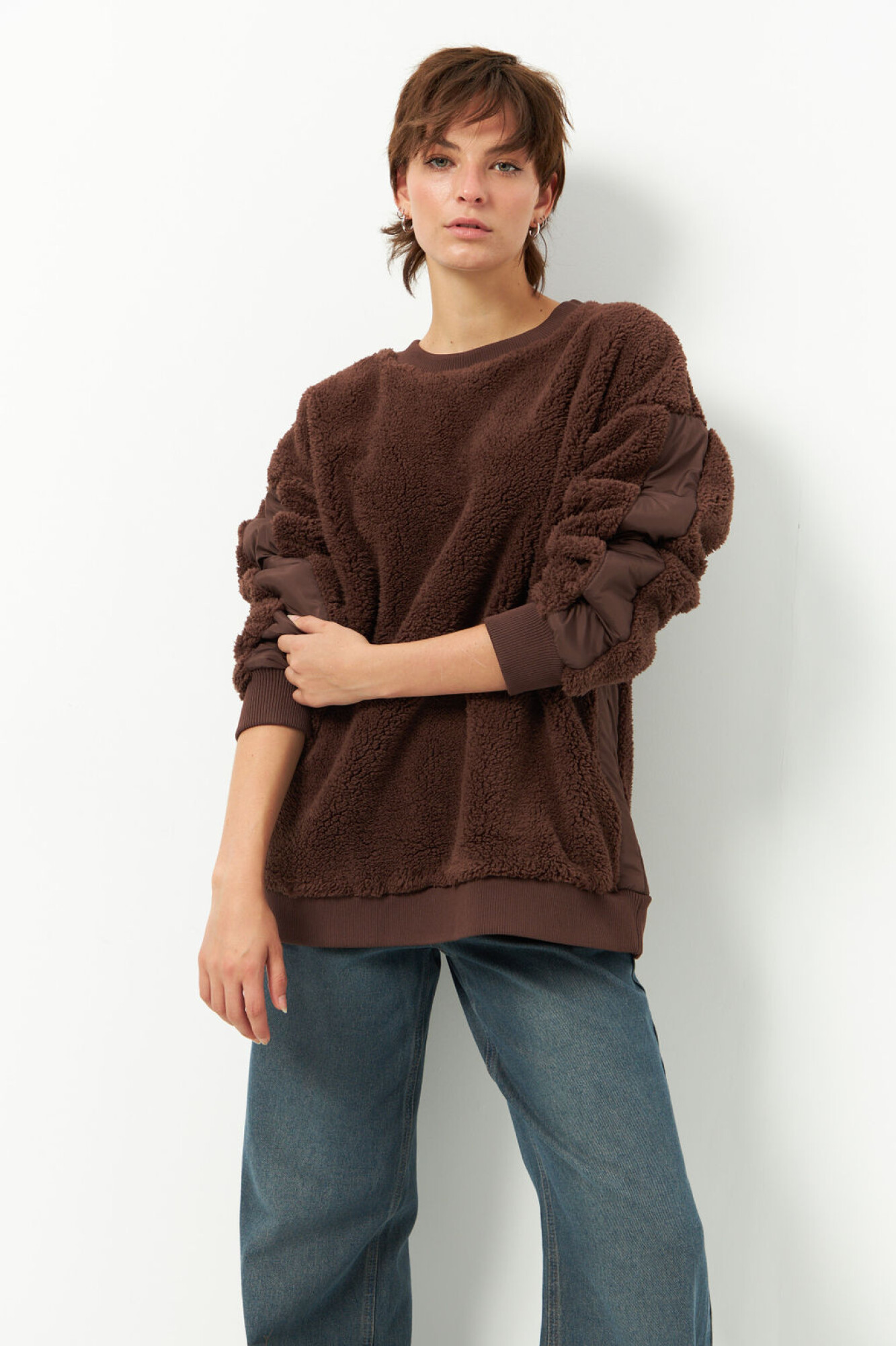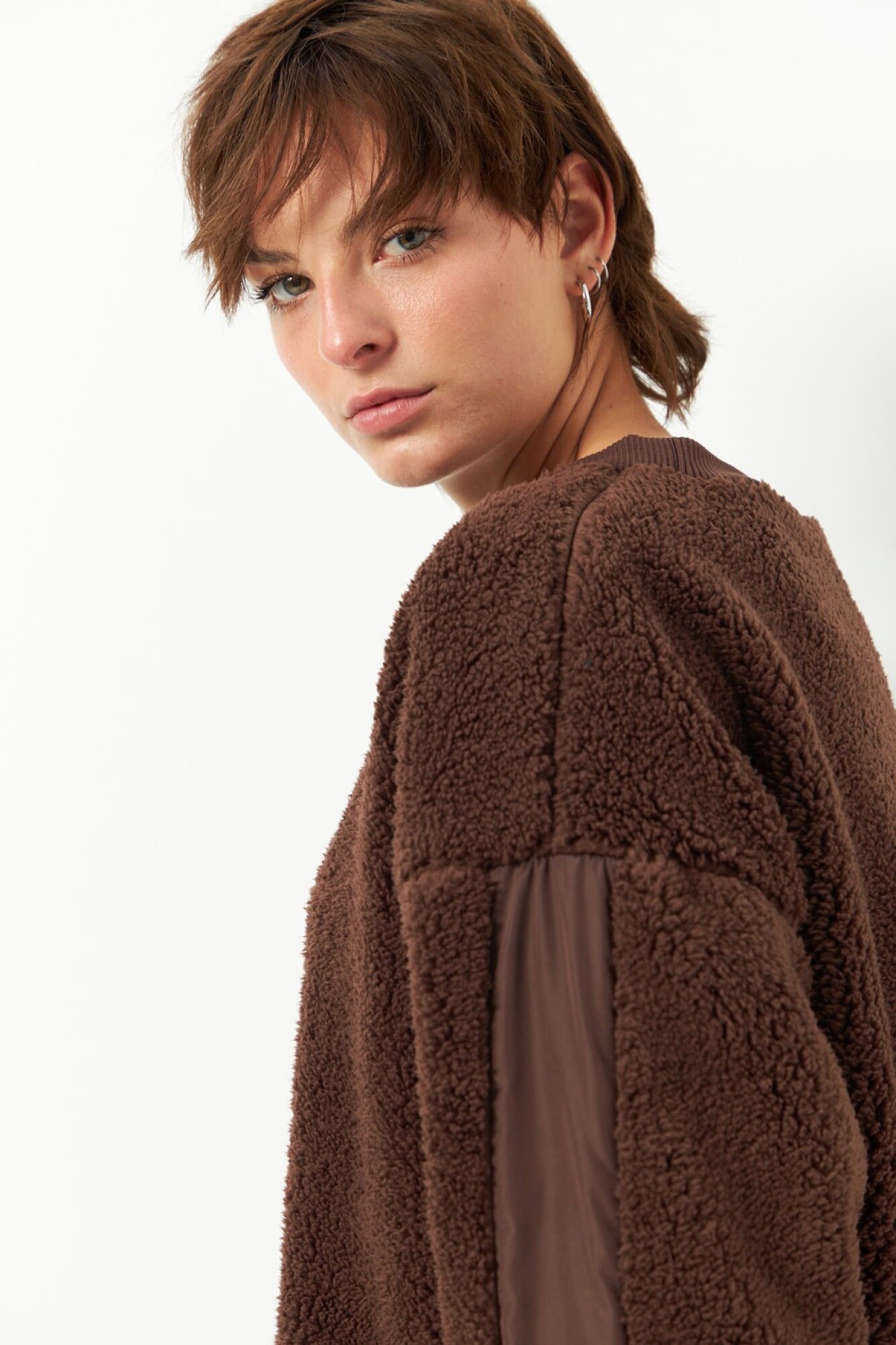 Buzo teddy de manga larga y cuello a la base, cuenta con tela diferenciada de nylon en ambos brazos, es fit oversized y es un aliado para enfrentar las frías temperaturas del invierno!