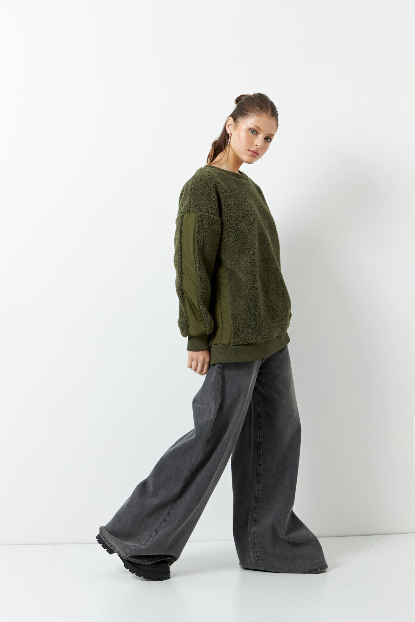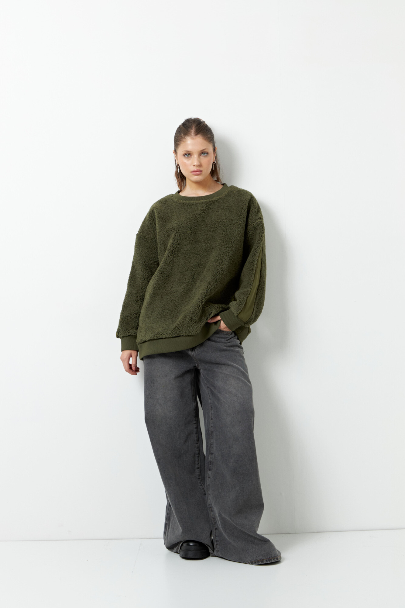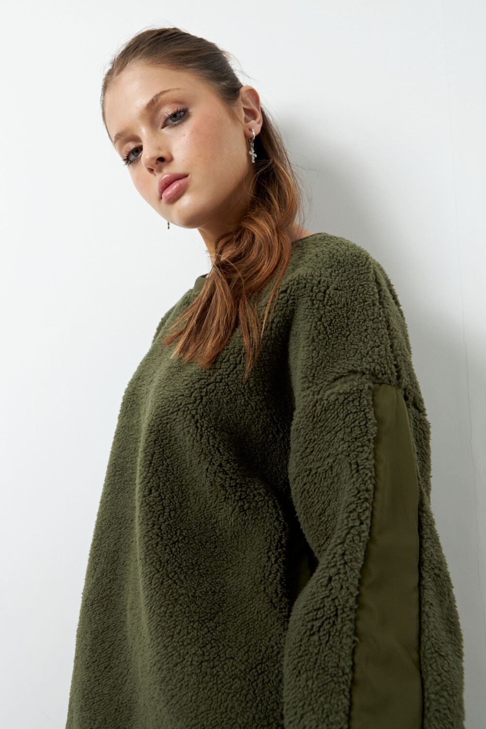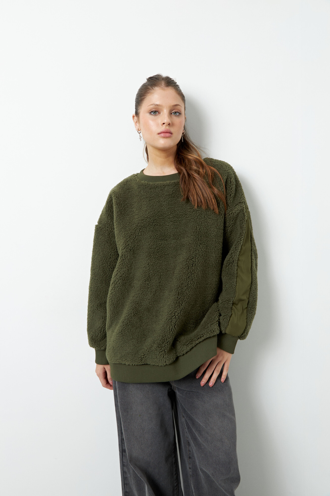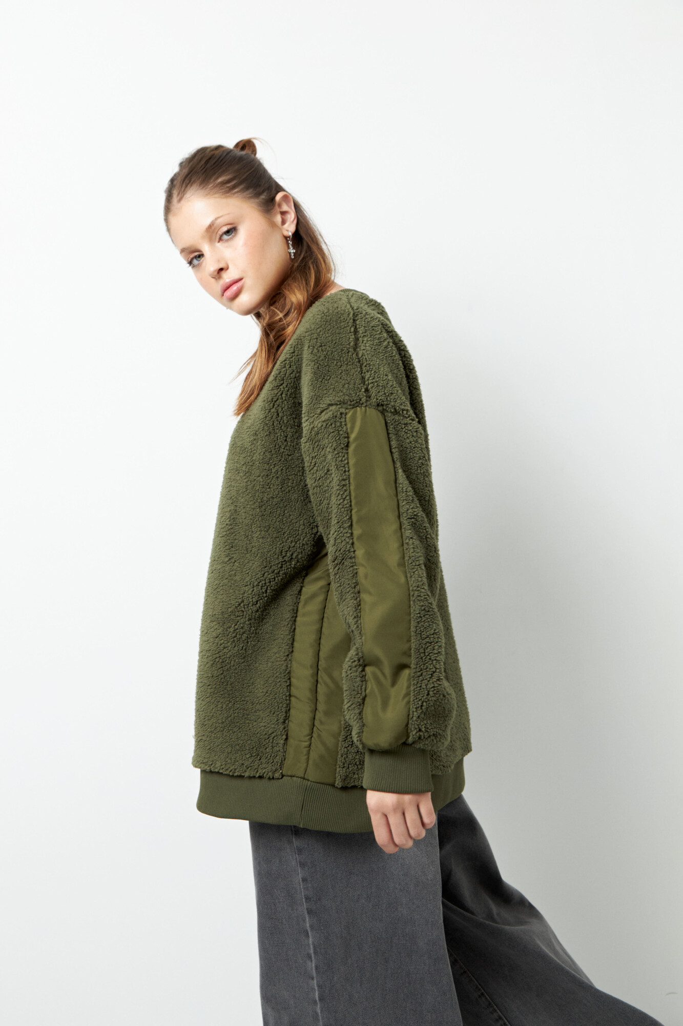 Buzo teddy de manga larga y cuello a la base, cuenta con tela diferenciada de nylon en ambos brazos, es fit oversized y es un aliado para enfrentar las frías temperaturas del invierno!
