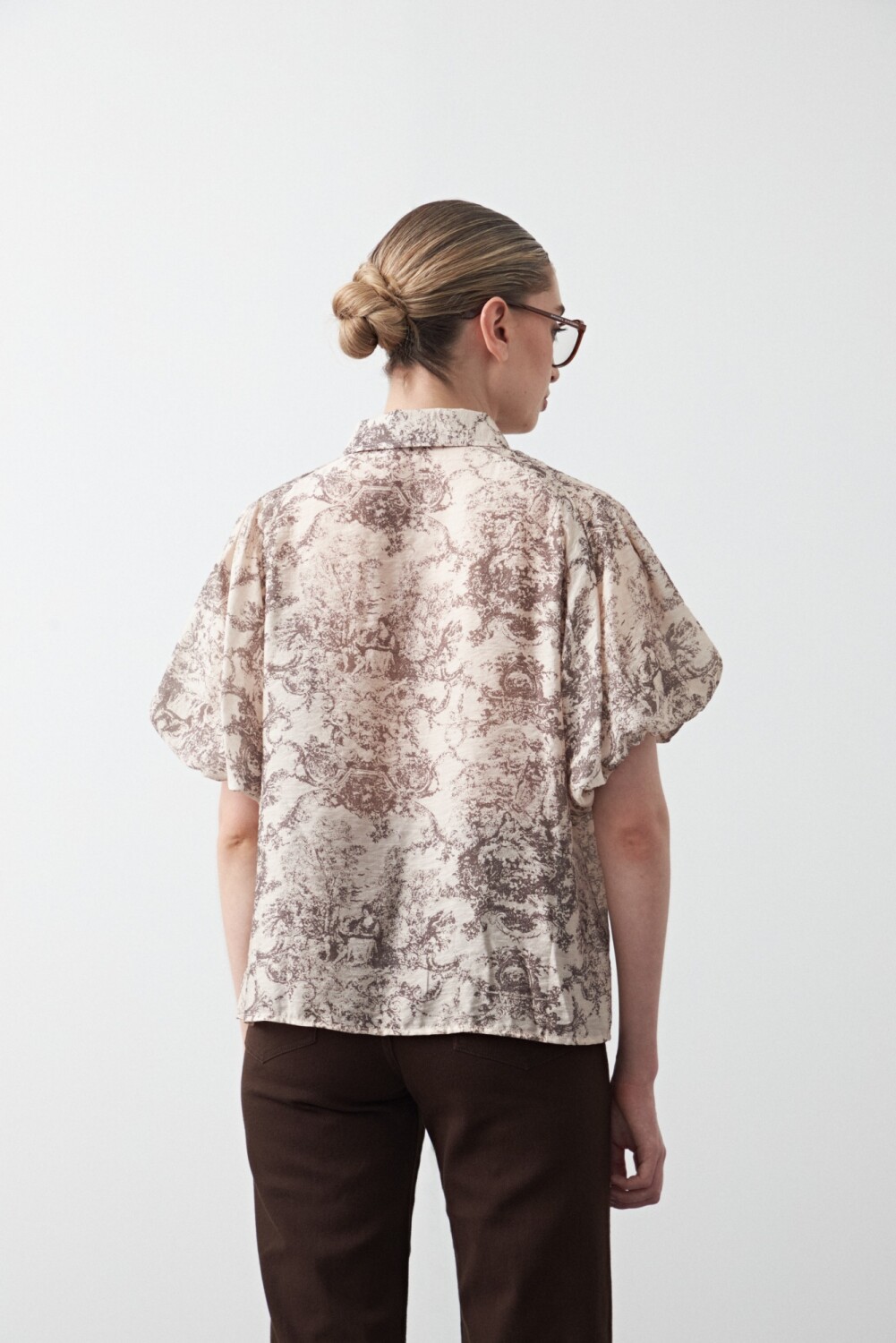 Camisa de mangas abullonadas con estampa de inspiración romántica y barroca, que aporta un aire sofisticado y atemporal. La caída suave del tejido acompaña el movimiento y realza el look con un toque delicado, ideal para elevar tanto outfits de día como propuestas más arregladas.