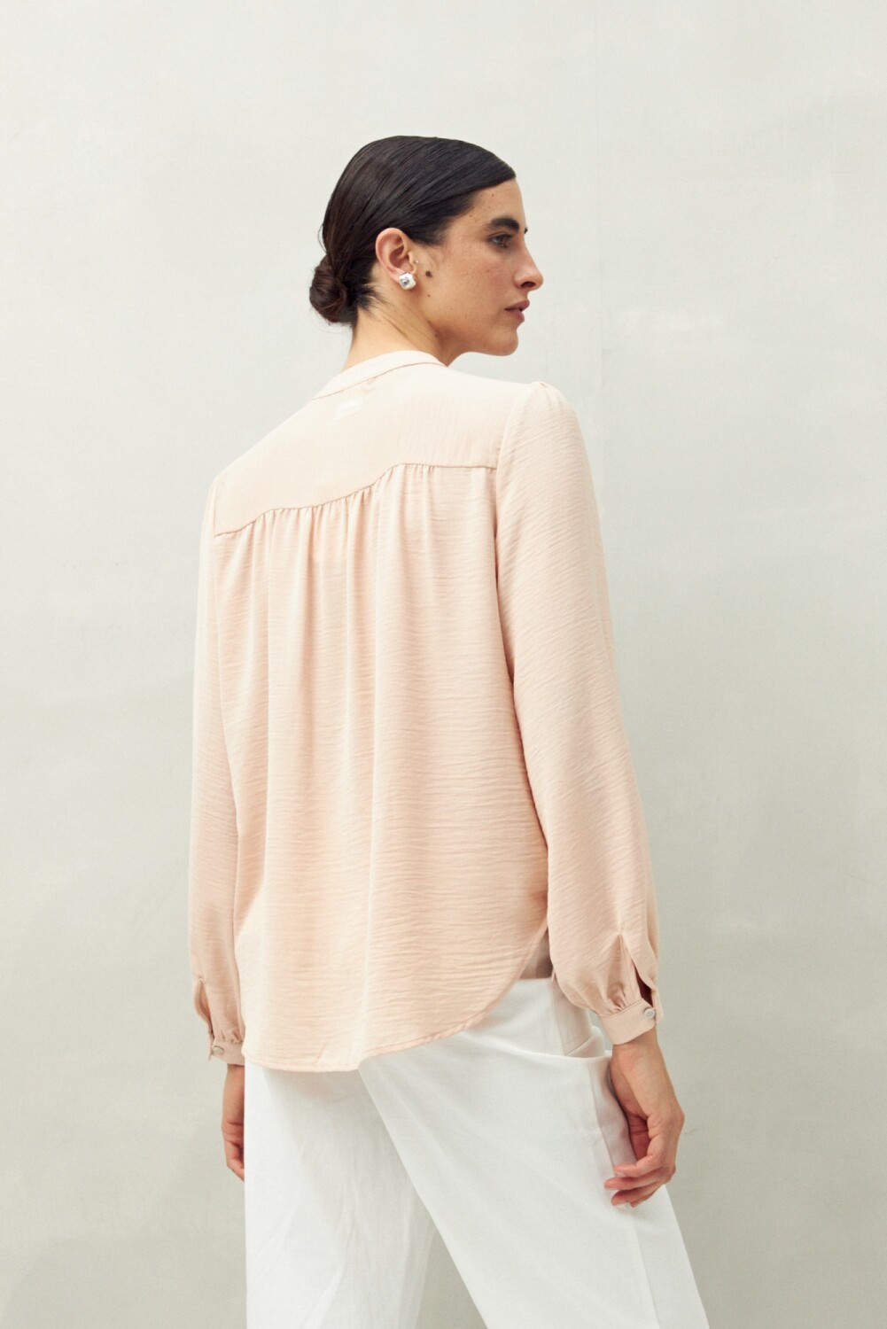 Camisa de manga larga con botones frontales y cuello mao. Los pequeños pliegues en los hombros y el detalle calado sutil realzan su diseño, convirtiéndola en una opción ideal para looks de oficina o combinaciones más relajadas con denim. Una prenda versátil que suma estilo a cualquier guardarropa.