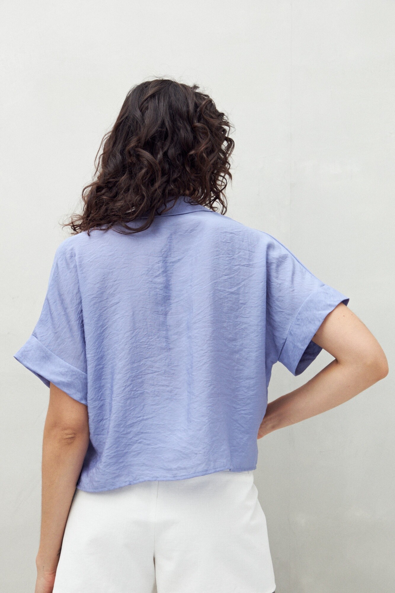 Camisa de manga corta con cuello solapa y botones de nácar al frente, confeccionada en un tejido liviano de sutil textura que aporta movimiento y frescura.
