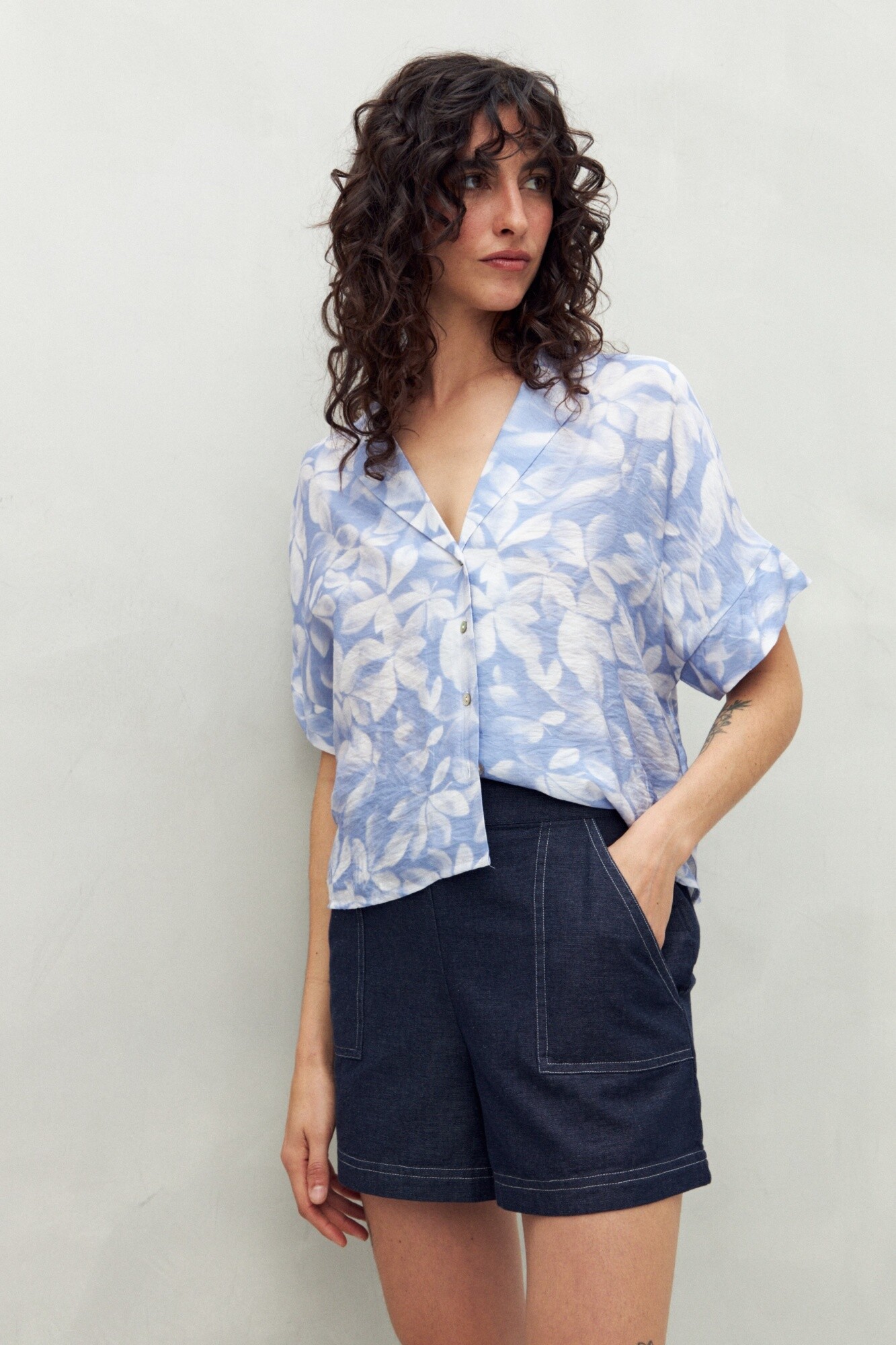 Camisa estampada de manga corta con cuello solapa y botones de nácar al frente, confeccionada en un tejido liviano de sutil textura que aporta movimiento y frescura.