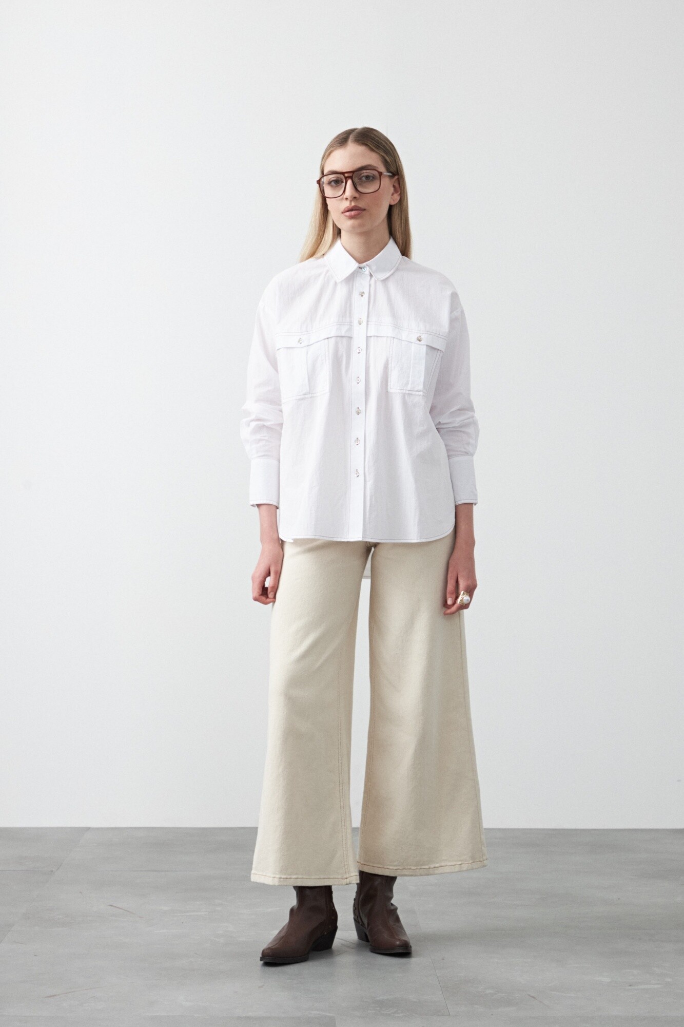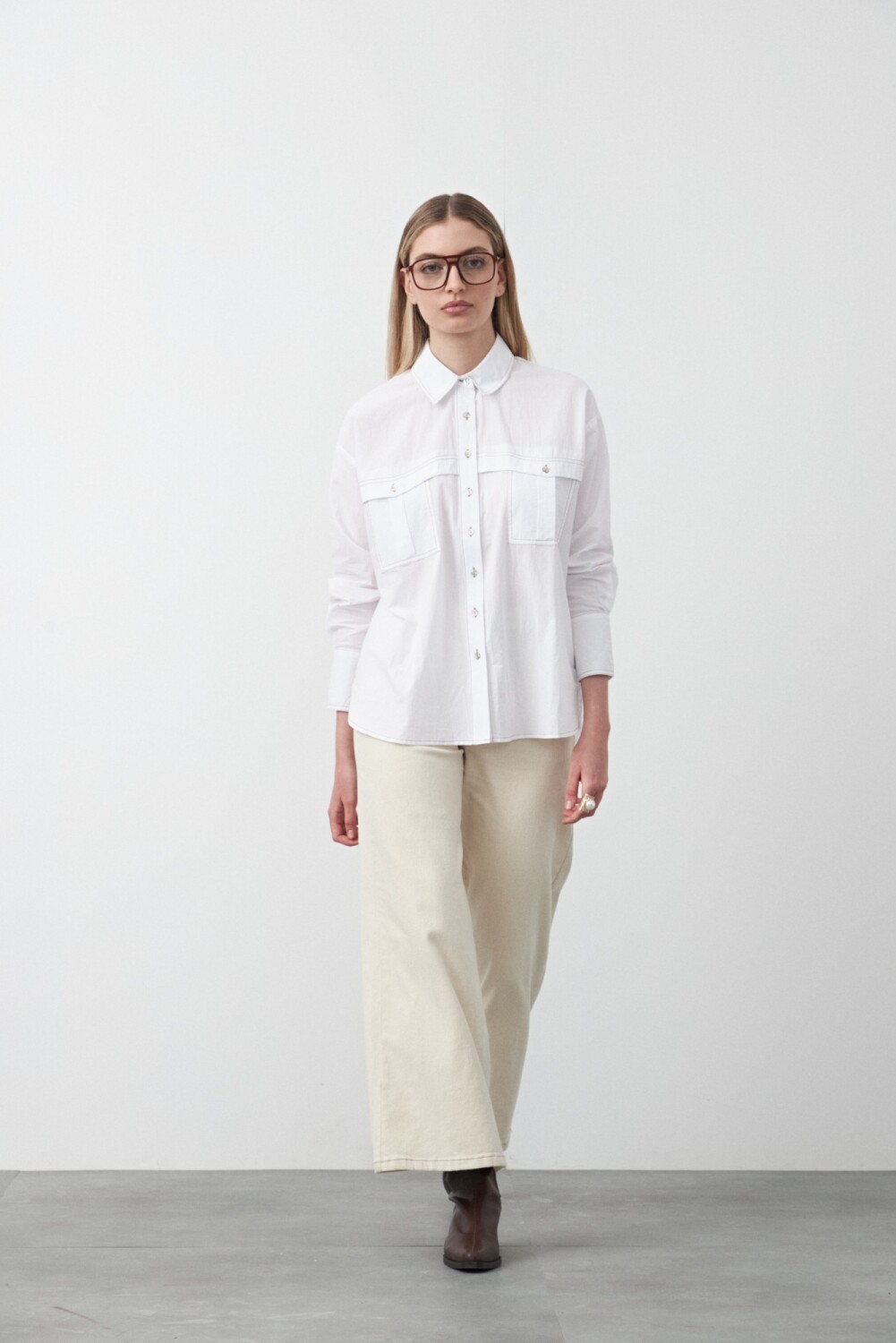 Camisa de algodón con diseño utilitario que aporta un look actual y funcional. Su silueta relajada se combina con bolsillos frontales de inspiración cargo y costuras a contratono que suman carácter al diseño. El largo levemente posterior y el calce cómodo la convierten en una prenda versátil, clave para elevar cualquier look tanto en propuestas casuales como en combinaciones más urbanas.