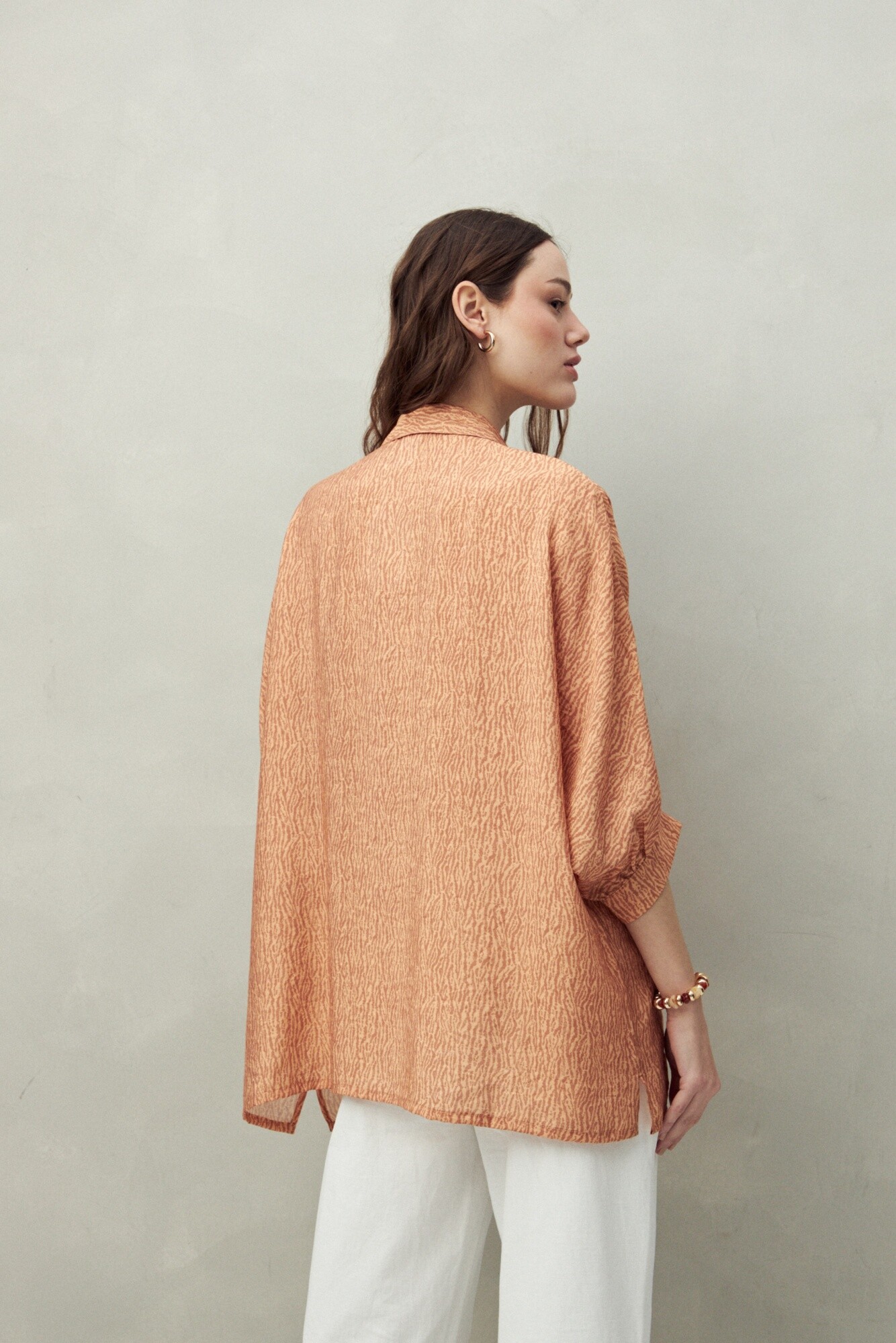 Camisa de corte relajado con manga tres cuartos y botones al frente. Su textura sutilmente arrugada le aporta carácter y un toque distintivo, perfecta para llevar suelta o dentro del pantalón según el look. Una prenda versátil que combina elegancia y frescura.