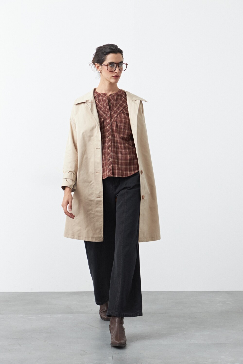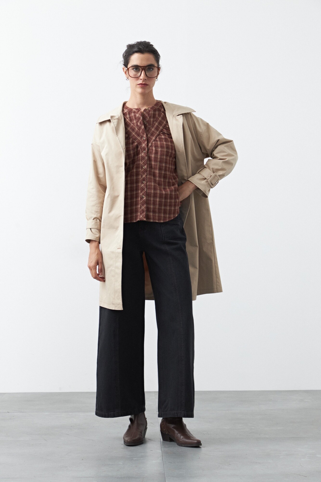 Camisa de manga larga a cuadros con diseño trabajado en recortes diagonales que realzan la prenda y aportan un diferencial sutil. Presenta cuello mao y botonadura frontal, con leve volumen en mangas y frunces que suman textura y movimiento. Una opción versátil que combina lo clásico con un aire más contemporáneo, ideal para looks de todos los días con un giro especial.