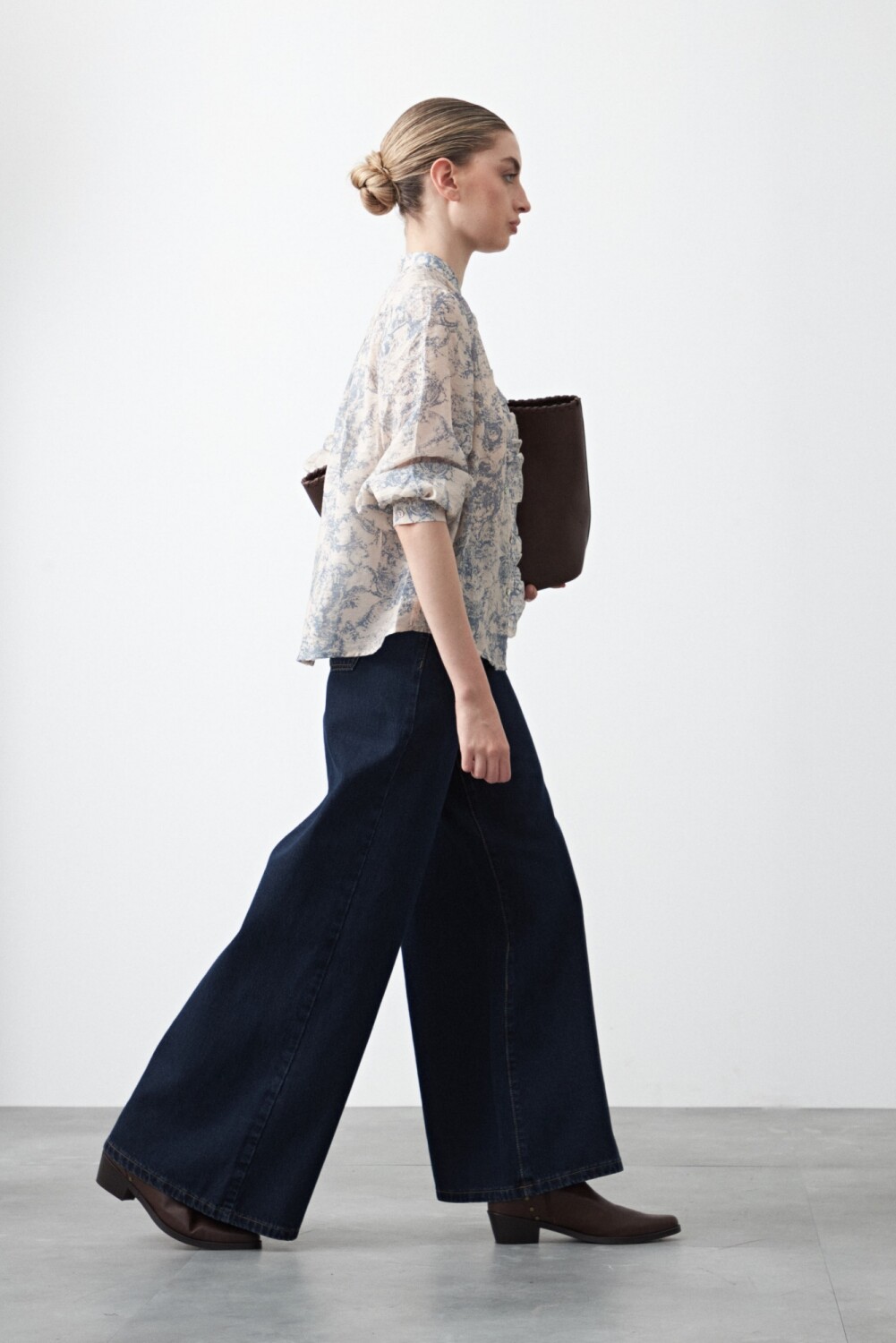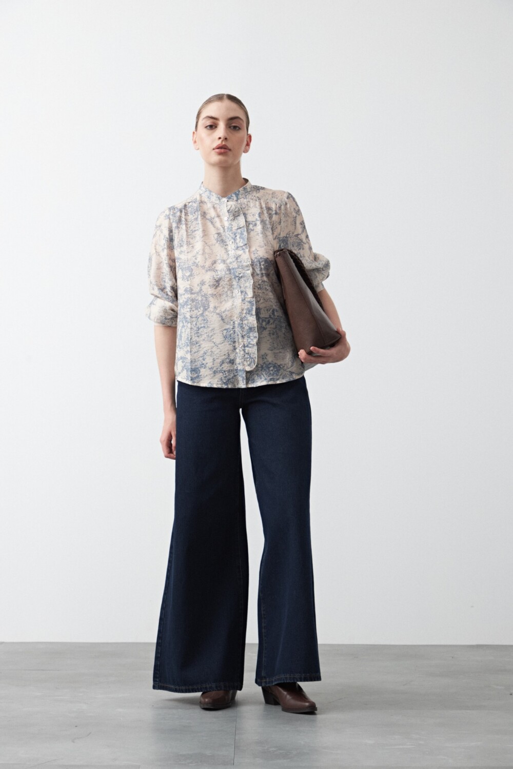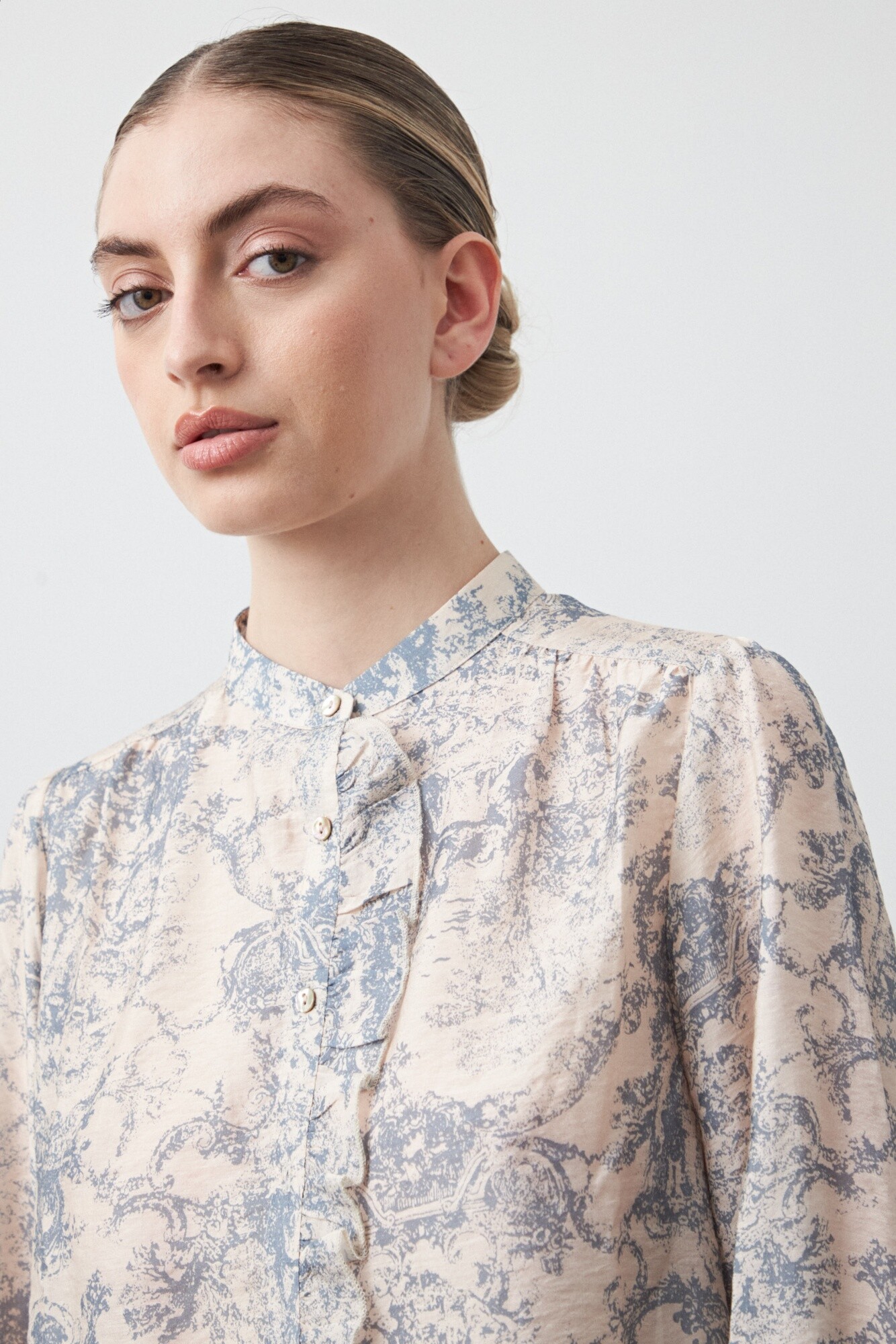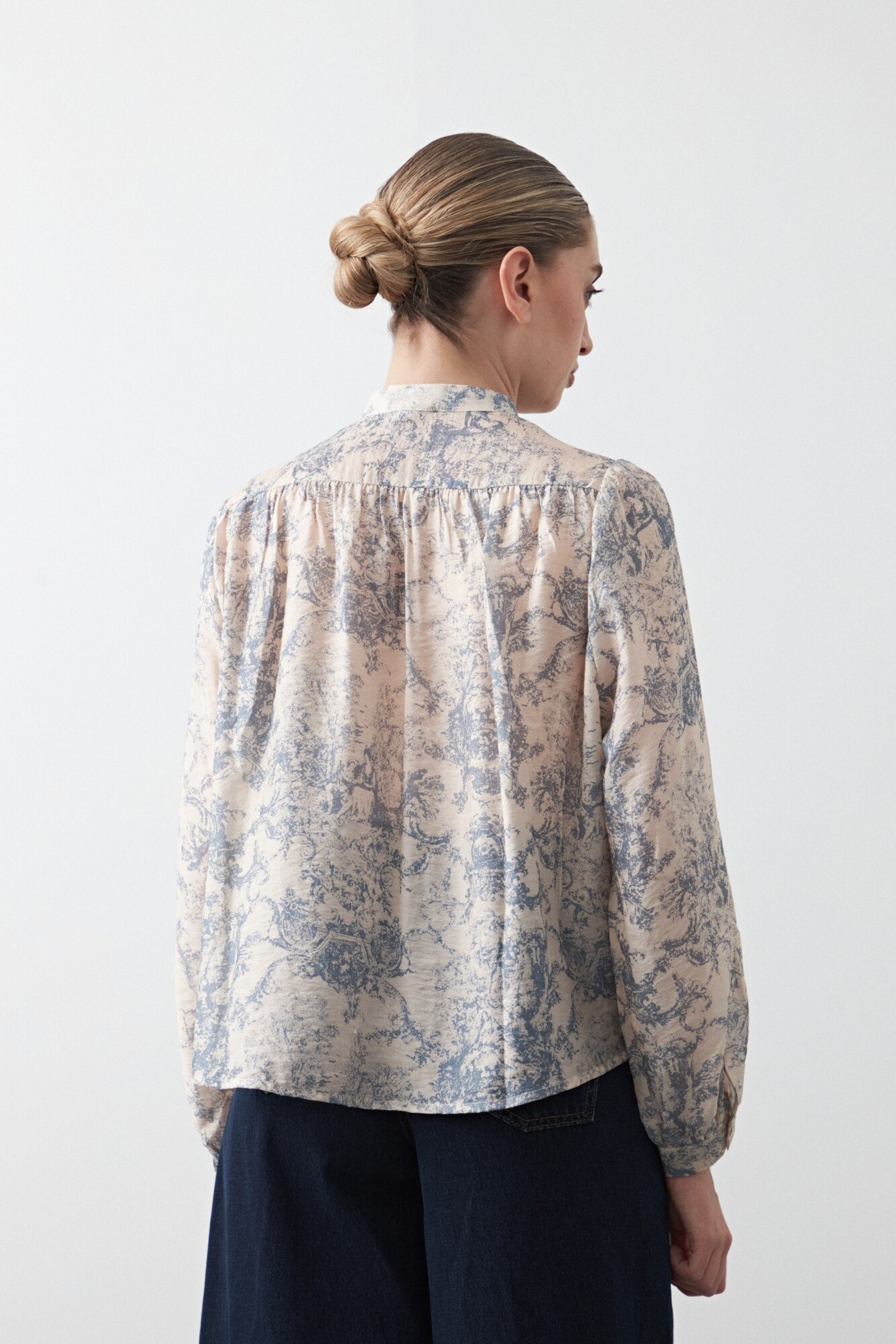 Camisa de estampa romántica de inspiración barroca, con un diseño delicado que combina motivos ornamentales y un aire clásico actualizado. De cuello con delicados bolados y botones anacarados. Las mangas largas con puño suavemente ajustado acompañan la silueta sin rigidez, logrando un equilibrio entre estructura y fluidez. Ideal para sumar un toque sofisticado tanto a looks de día como a propuestas más formales.