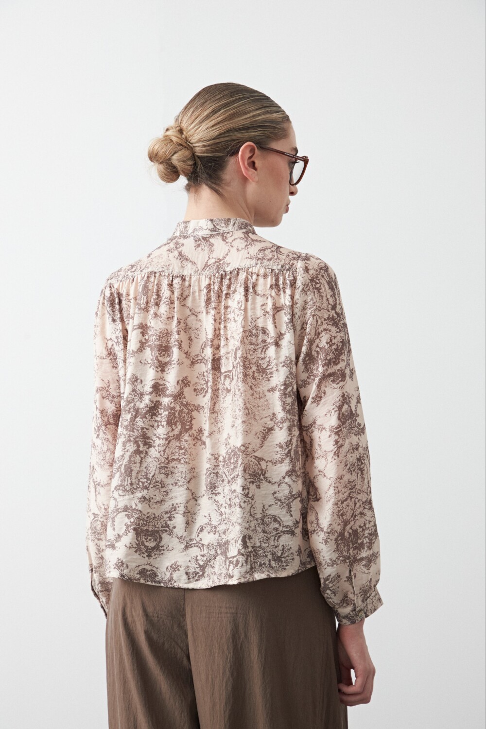 Camisa de estampa romántica de inspiración barroca, con un diseño delicado que combina motivos ornamentales y un aire clásico actualizado. De cuello con delicados bolados y botones anacarados. Las mangas largas con puño suavemente ajustado acompañan la silueta sin rigidez, logrando un equilibrio entre estructura y fluidez. Ideal para sumar un toque sofisticado tanto a looks de día como a propuestas más formales.