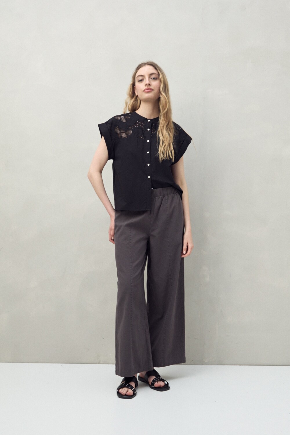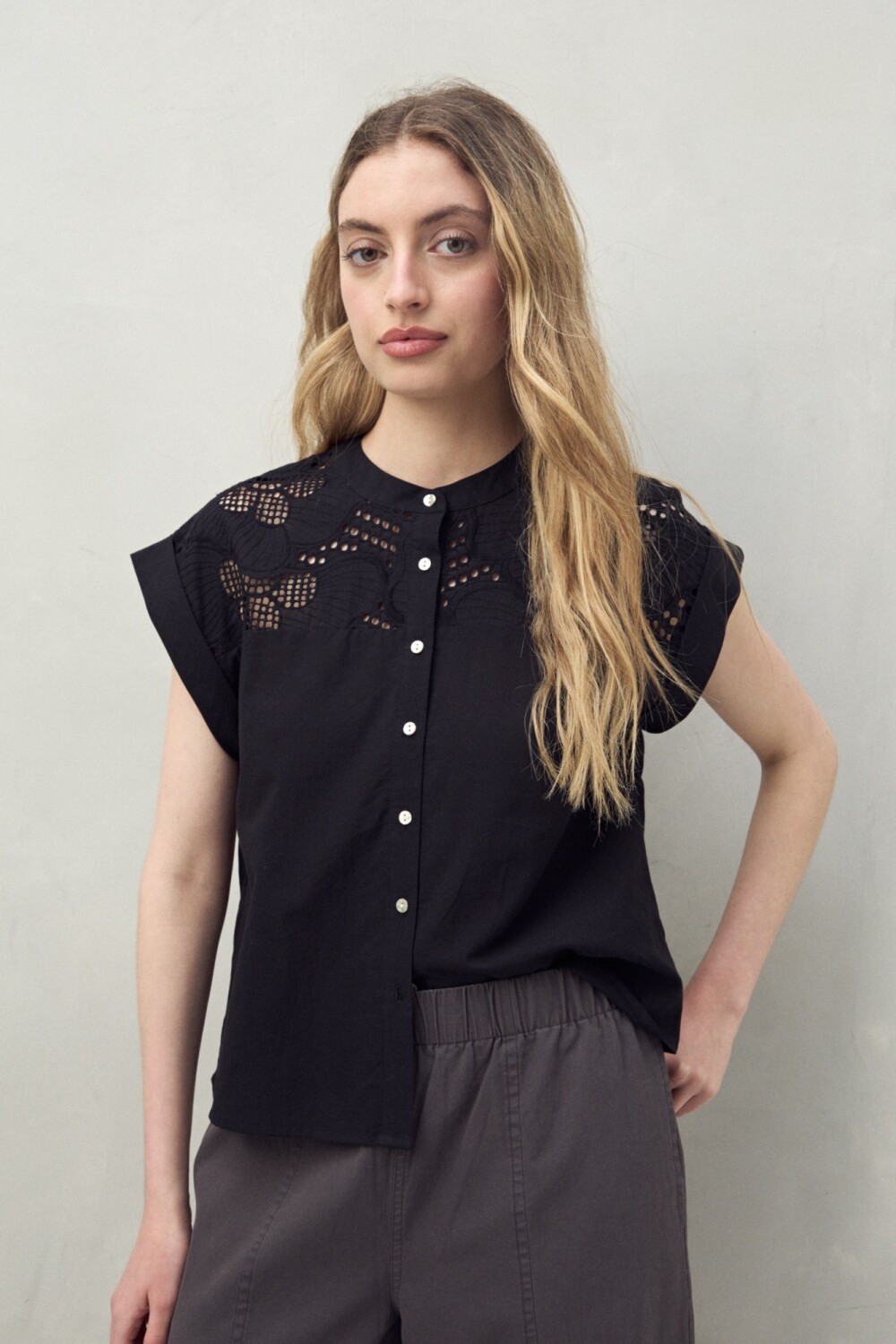 Camisa sin mangas confeccionada en 100% algodón, con delicados calados y bordados que aportan textura y un aire artesanal. Su cuello mao y abotonadura central le dan un toque moderno y versátil, ideal para combinar con jeans o pantalones amplios. Una prenda fresca y femenina, clave para elevar cualquier look de verano.