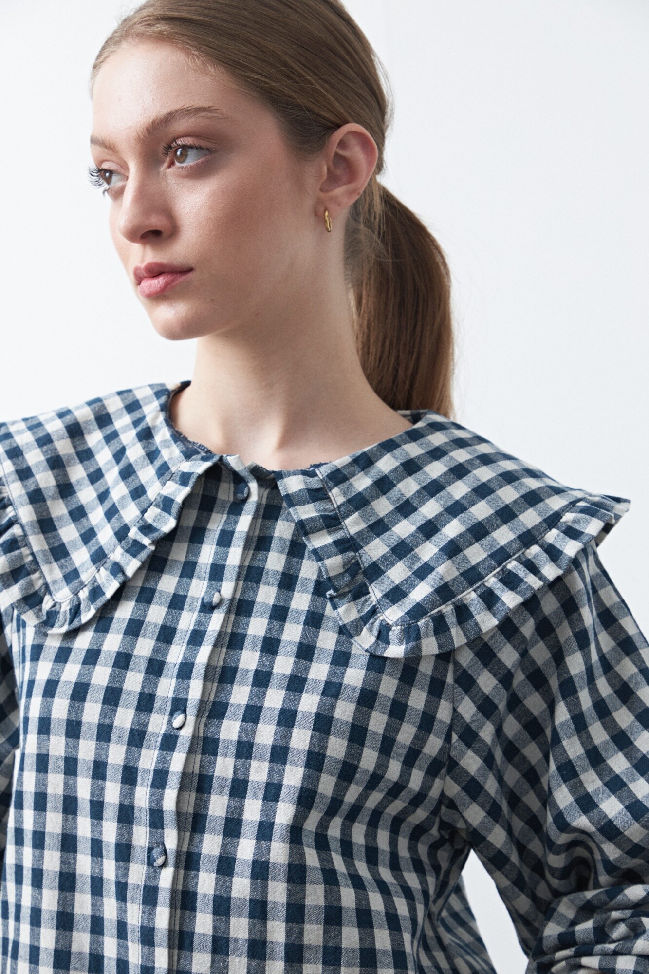 Camisa de algodón a cuadros con cuello protagonista, una reinterpretación del clásico vichy con un detalle romántico y en tendencia. El amplio cuello con volado enmarca el rostro y aporta un guiño retro que eleva el diseño, convirtiéndola en una pieza especial dentro del guardarropa diario.