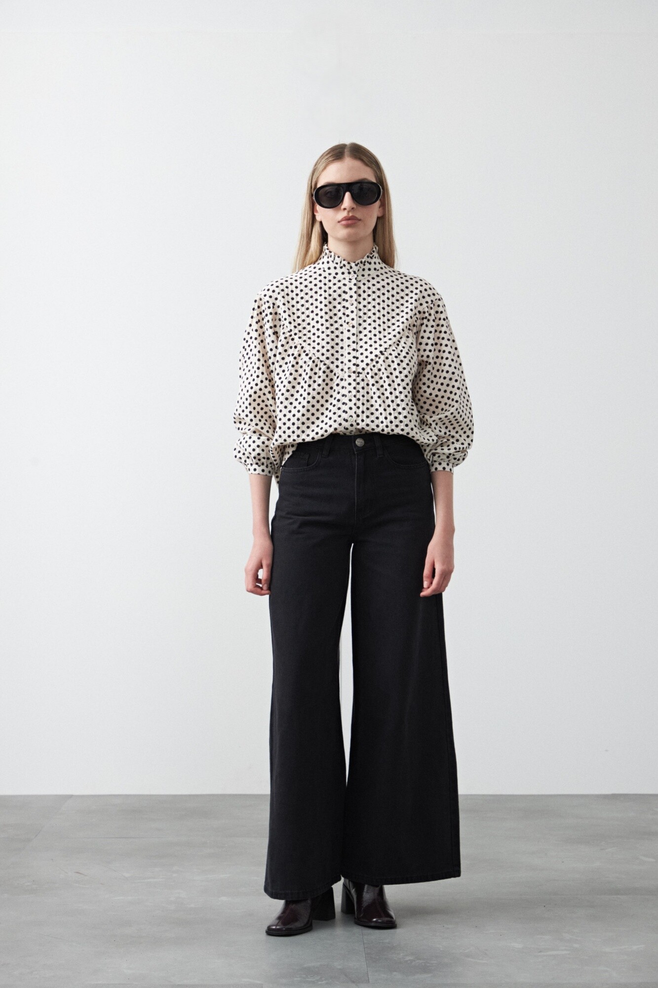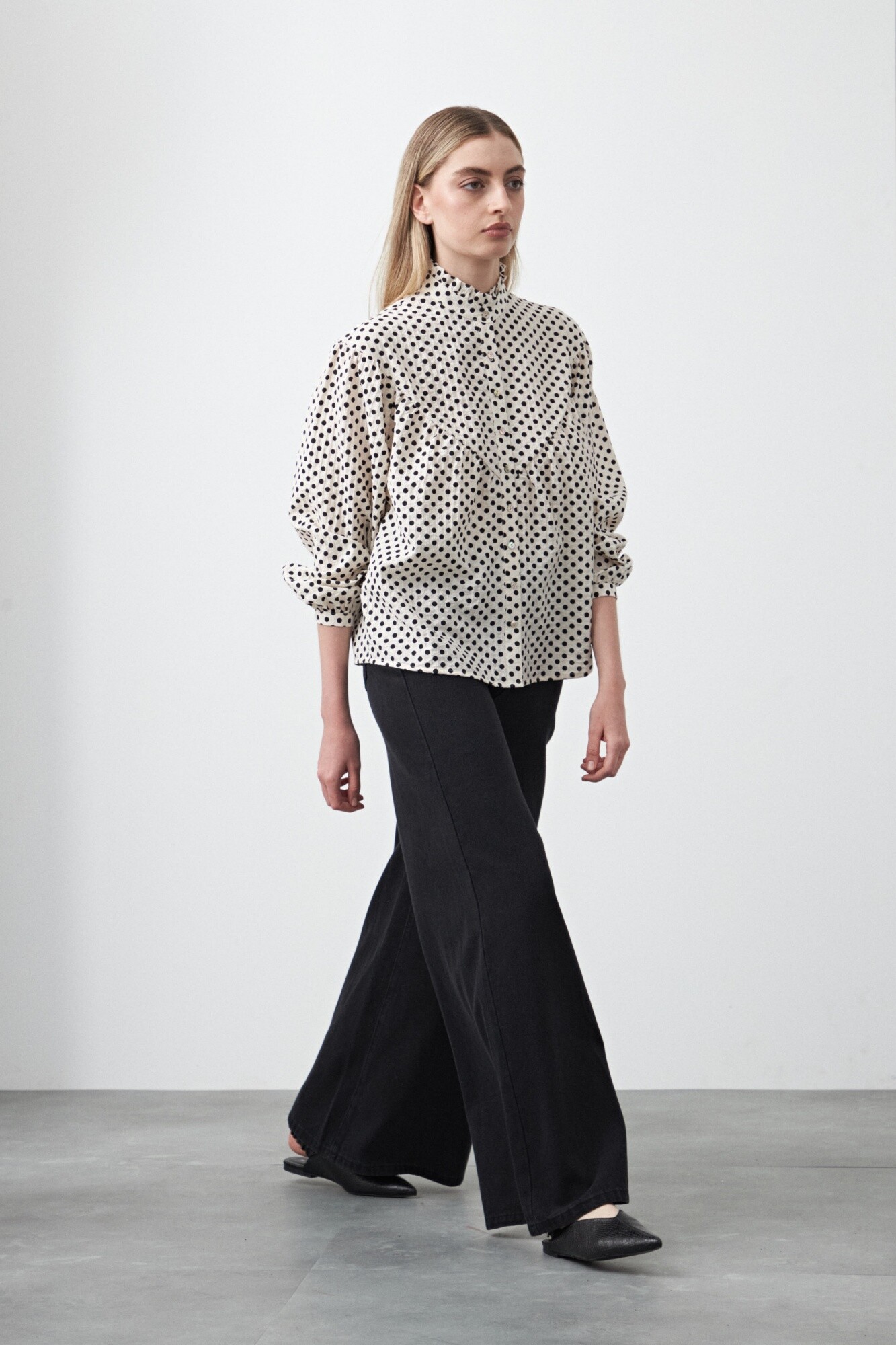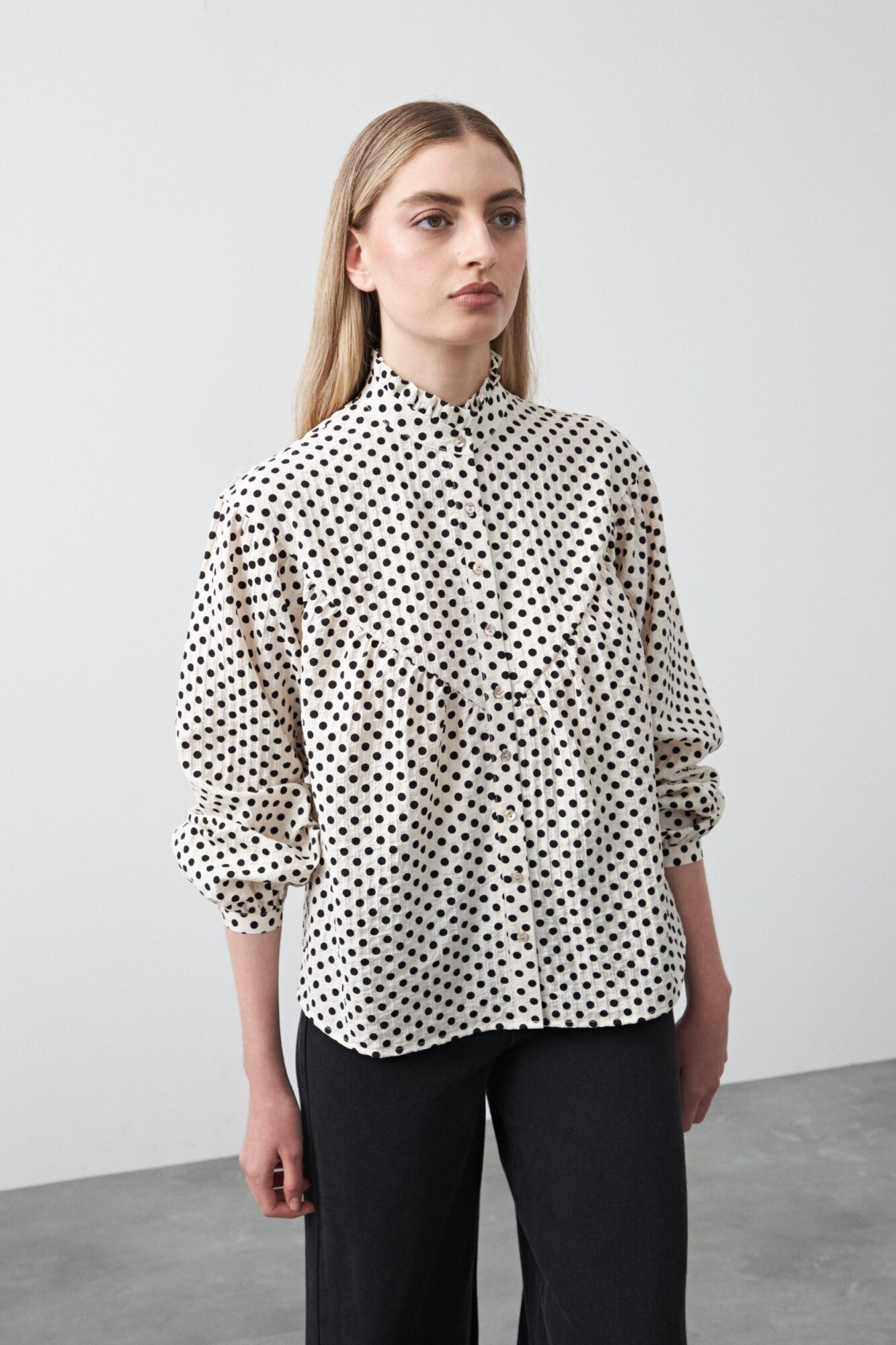 Diseño de silueta suelta con delicados frunces que aportan volumen y movimiento, logrando un equilibrio entre lo clásico y lo actual. El cuello alto con botonadura frontal suma un detalle sofisticado, mientras que la caída fluida del tejido acompaña el cuerpo con suavidad. Ideal para looks urbanos o de oficina, es una prenda versátil que se adapta fácilmente a distintas propuestas, clave para elevar cualquier look.