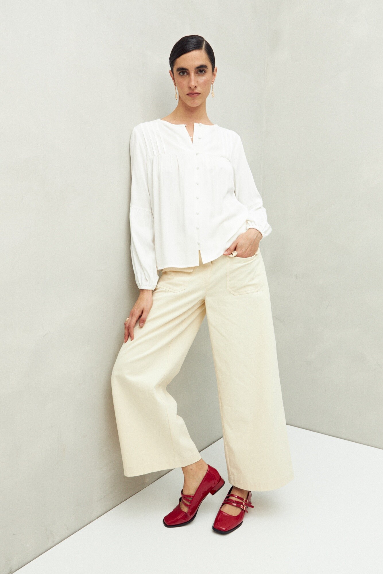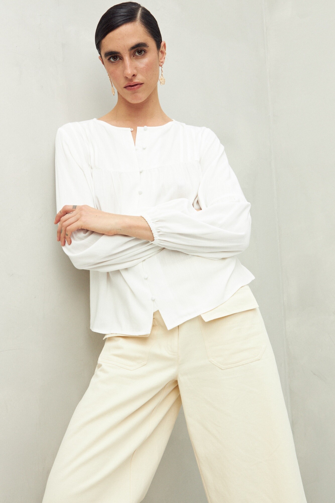 Con una silueta relajada y femenina, esta camisa destaca por su caída fluida y los delicados botones forrados a tono. El canesú con pequeñas tablas le aporta estructura, mientras que las mangas amplias con puño elastizado suman movimiento y un aire romántico. Ideal para llevar con pantalones de vestir o denim, logrando un look de oficina liviano y actual.