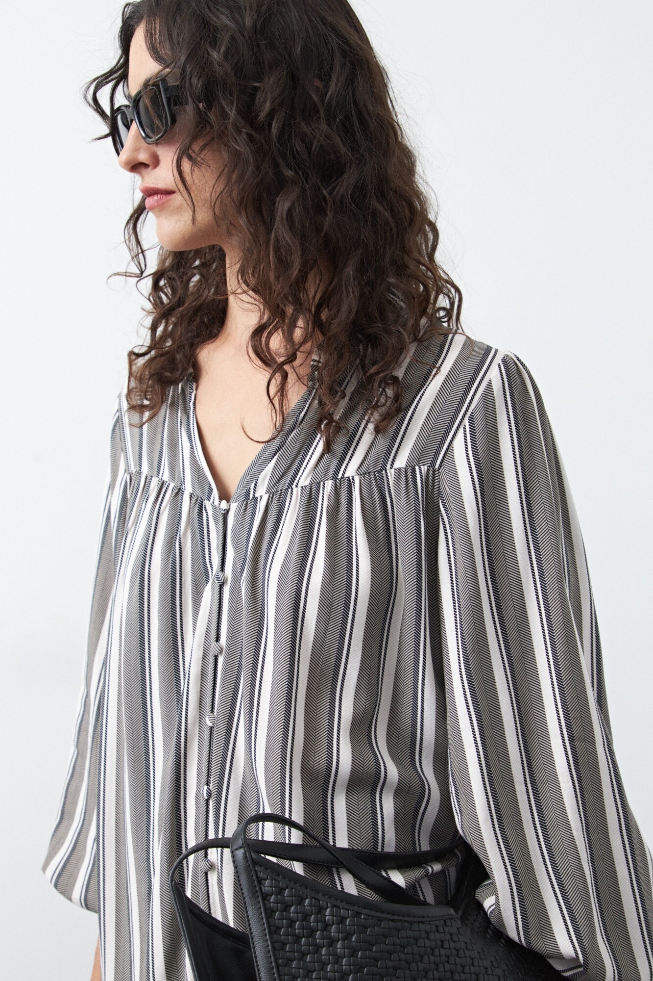 Camisa de manga larga con estampa que aporta un guiño sutil al look de office, ideal para sumar personalidad sin perder elegancia. El diseño equilibra líneas verticales y caída fluida, logrando una silueta prolija que acompaña el movimiento.