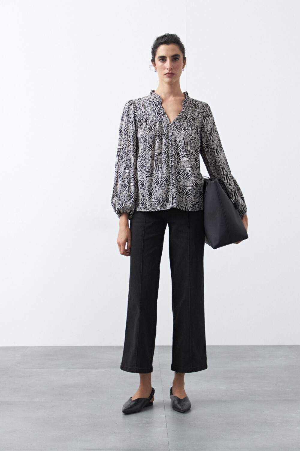 Camisa de manga larga con estampa que aporta un guiño sutil al look de office, ideal para sumar personalidad sin perder elegancia. El diseño equilibra líneas verticales y caída fluida, logrando una silueta prolija que acompaña el movimiento.