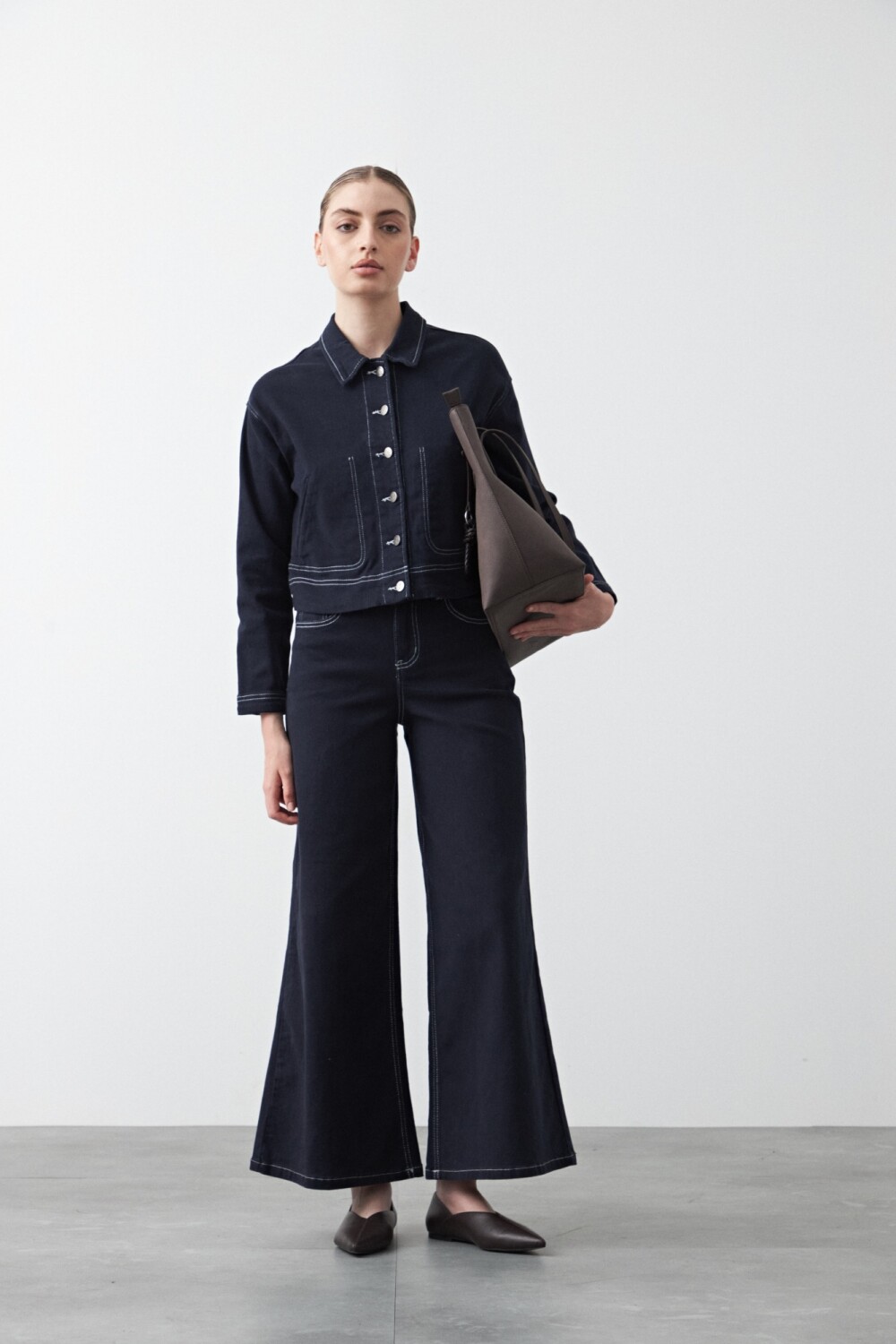 Diseño de silueta recta y corta que aporta estructura al look, con detalles de costura en contraste que realzan su impronta urbana y moderna. La botonadura frontal y los bolsillos aplicados suman funcionalidad, mientras que el toque de elastano brinda mayor comodidad y libertad de movimiento. Ideal para usar como capa liviana y sumar carácter a distintos outfits, es una prenda versátil y en tendencia, clave para elevar cualquier look.