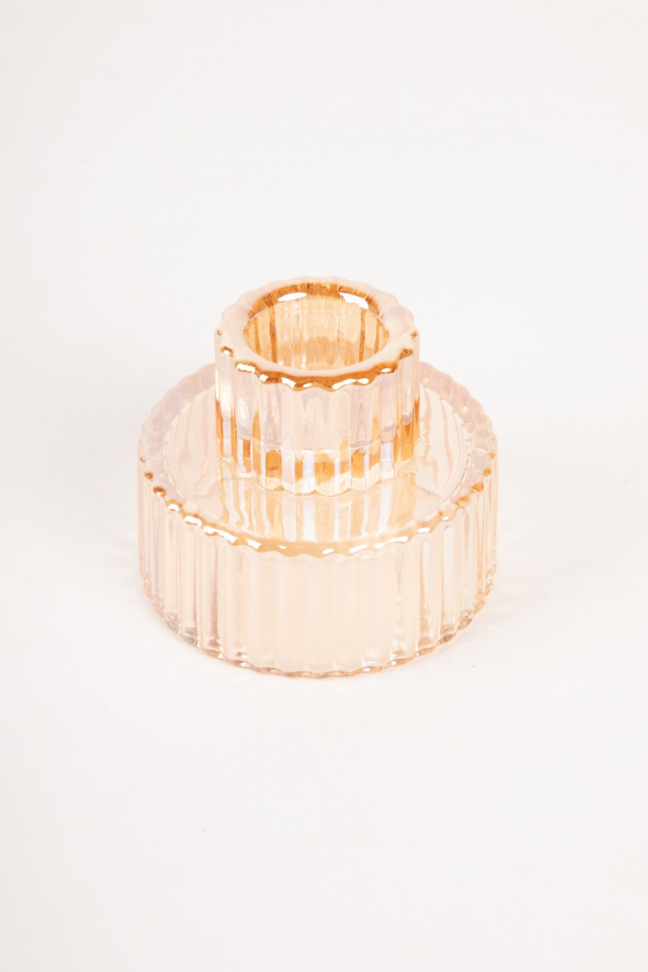 Dale un toque vintage a tu decoración con este encantador candelabro de vidrio caramelo. Su diseño acanalado y detalles texturizados evocan la elegancia clásica, ideal para velas pequeñas tipo té o votivas. Perfecto para centros de mesa o rincones especiales, combina lo decorativo con lo funcional de forma sutil y encantadora.
