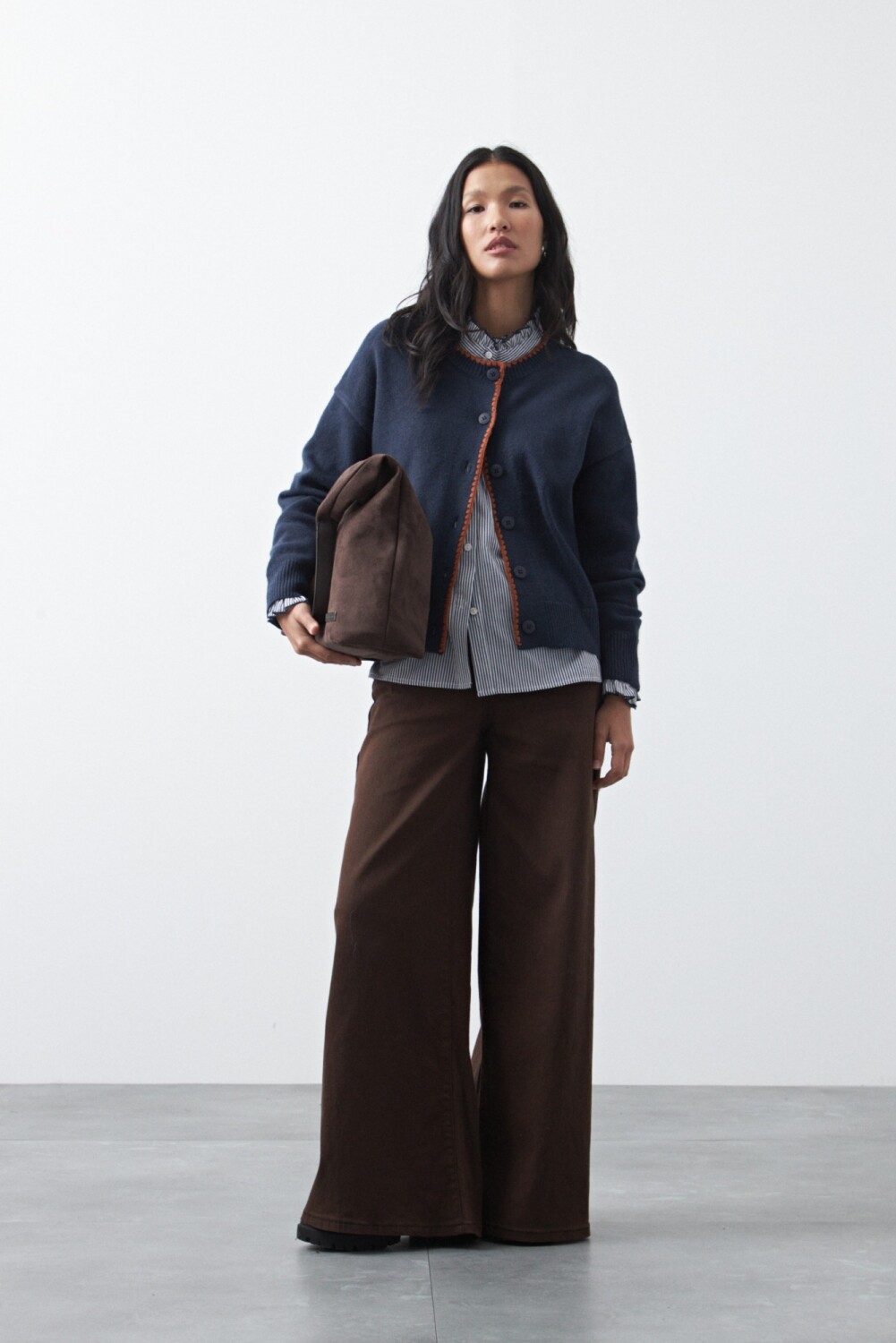 Cardigan tejido bordado, de silueta relajada y cuello redondo, diseñado para sumar textura y detalle al look. Presenta cierre frontal con botones y terminaciones acanaladas en cuello, puños y ruedo que aportan estructura y un calce cómodo.