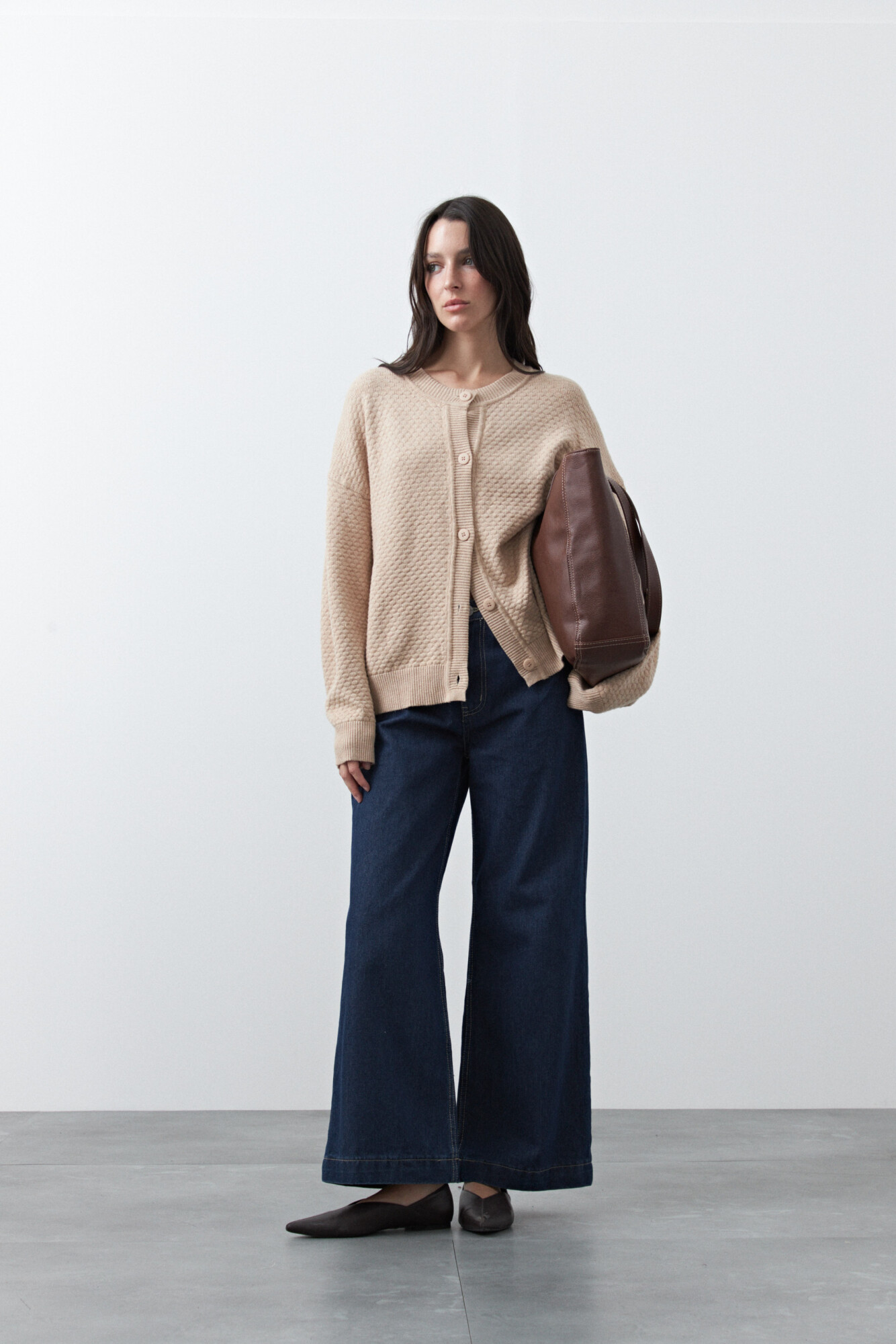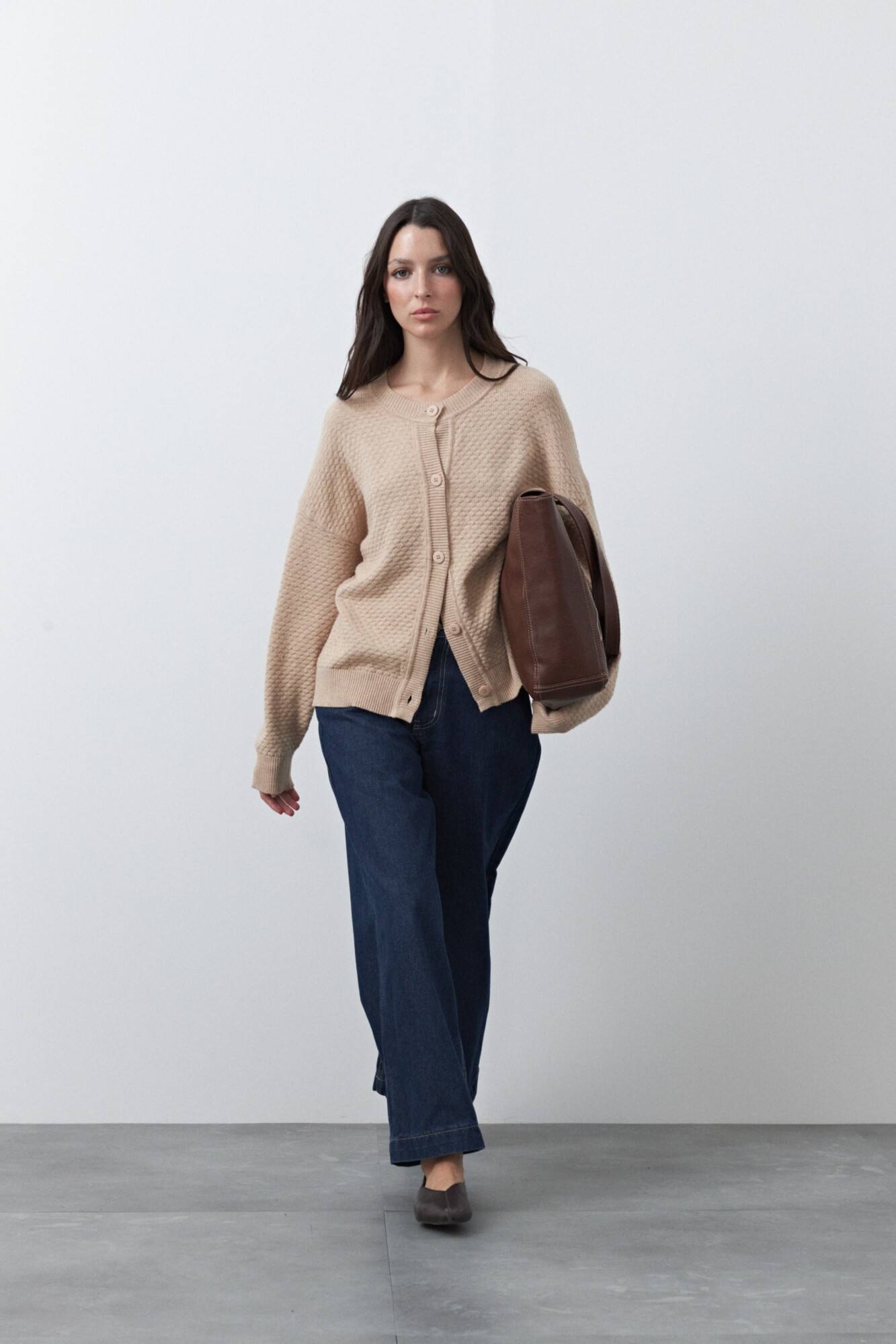 Cardigan de textura tramada con diseño sutil que aporta profundidad visual y una estética moderna. Su silueta relajada lo convierte en una prenda versátil, ideal para sumar a looks de oficina o más descontracturados, funcionando como una capa liviana pero con presencia.