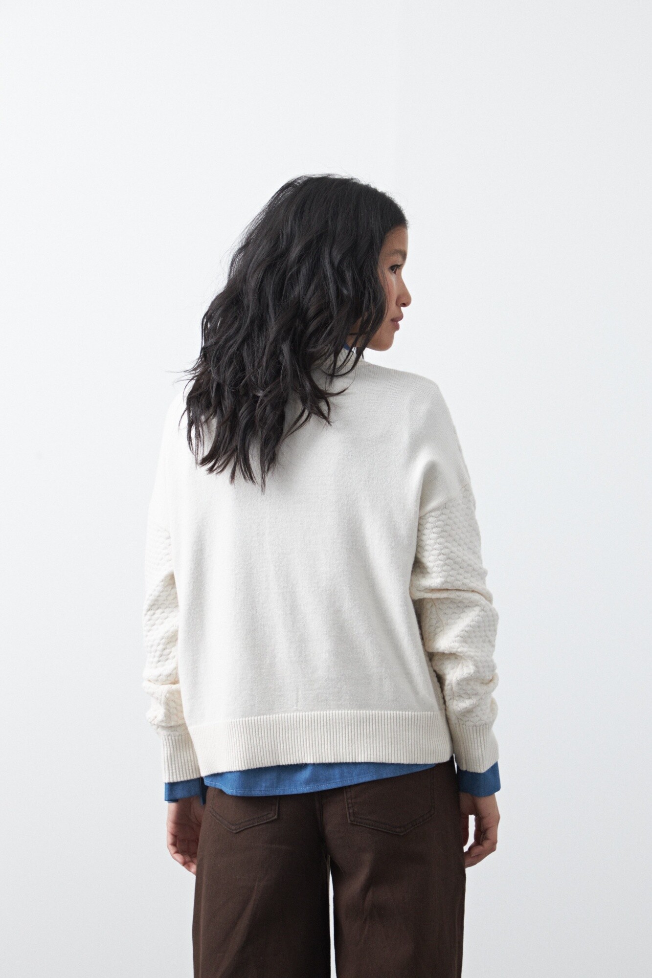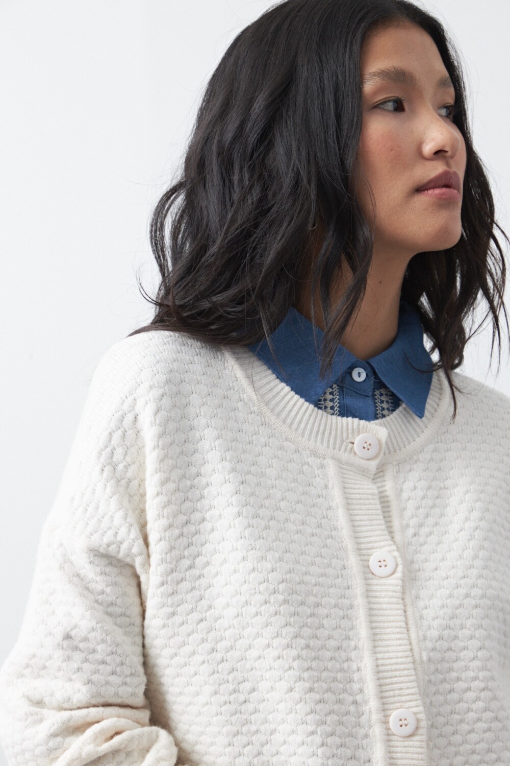 Cardigan de textura tramada con diseño sutil que aporta profundidad visual y una estética moderna. Su silueta relajada lo convierte en una prenda versátil, ideal para sumar a looks de oficina o más descontracturados, funcionando como una capa liviana pero con presencia.
