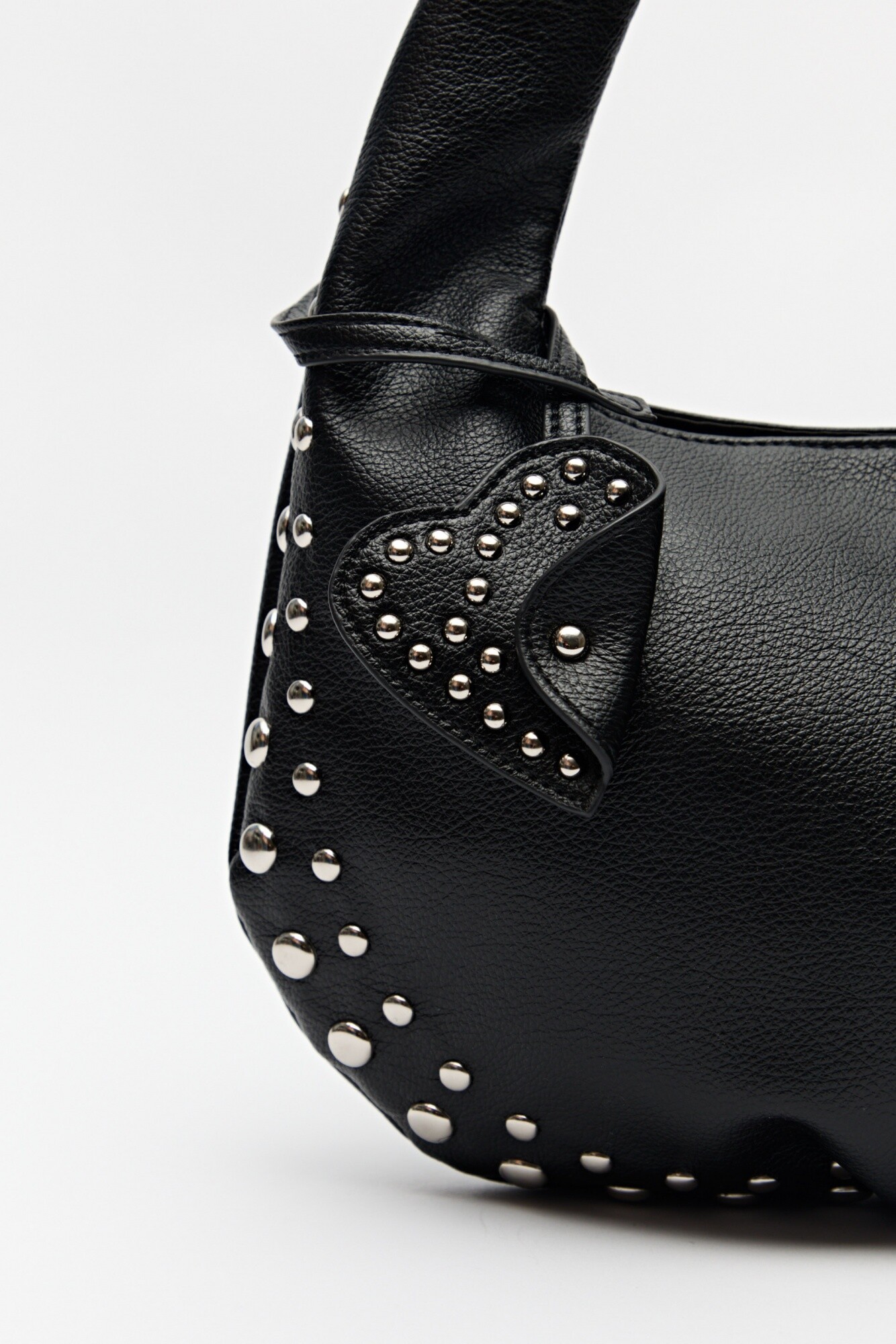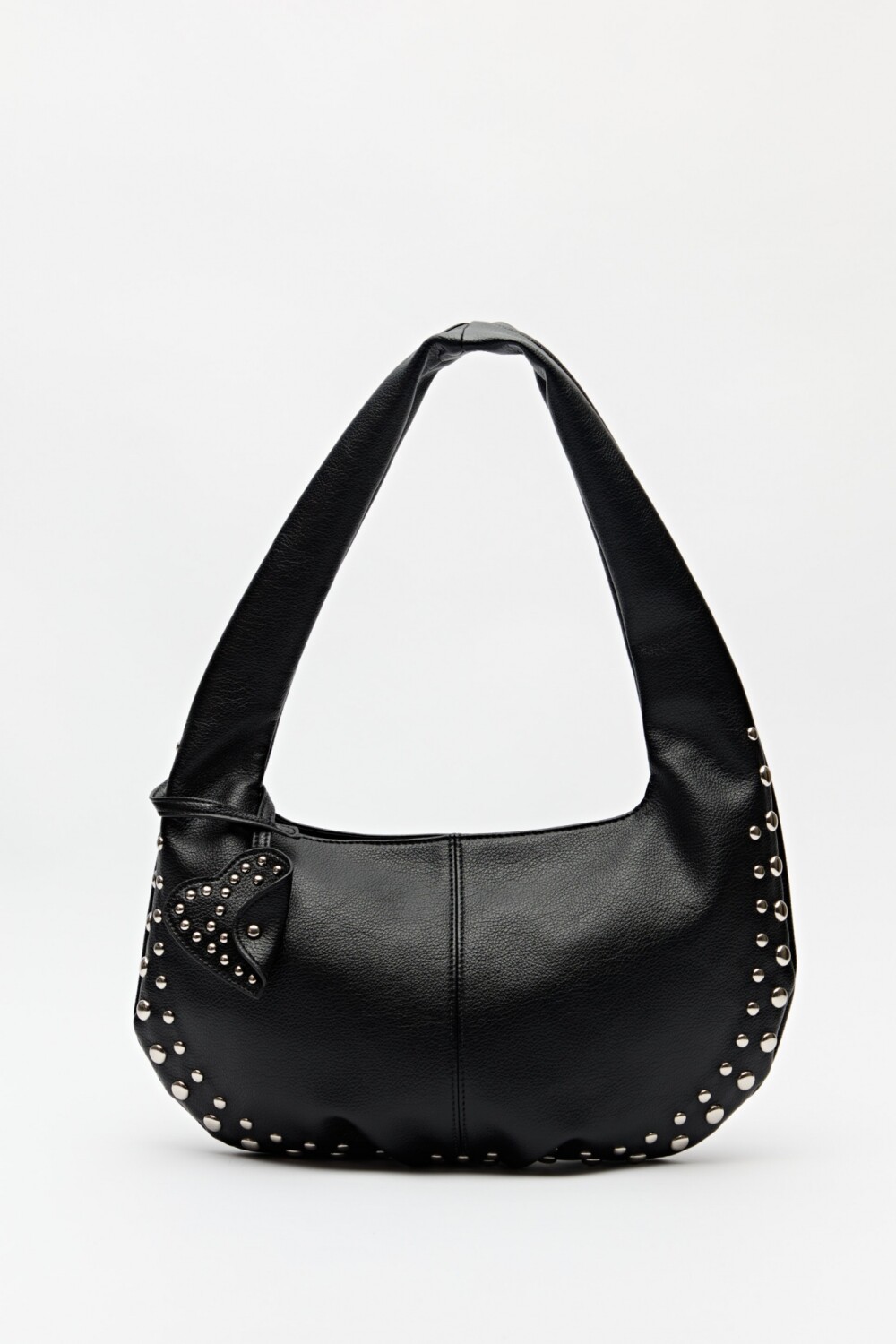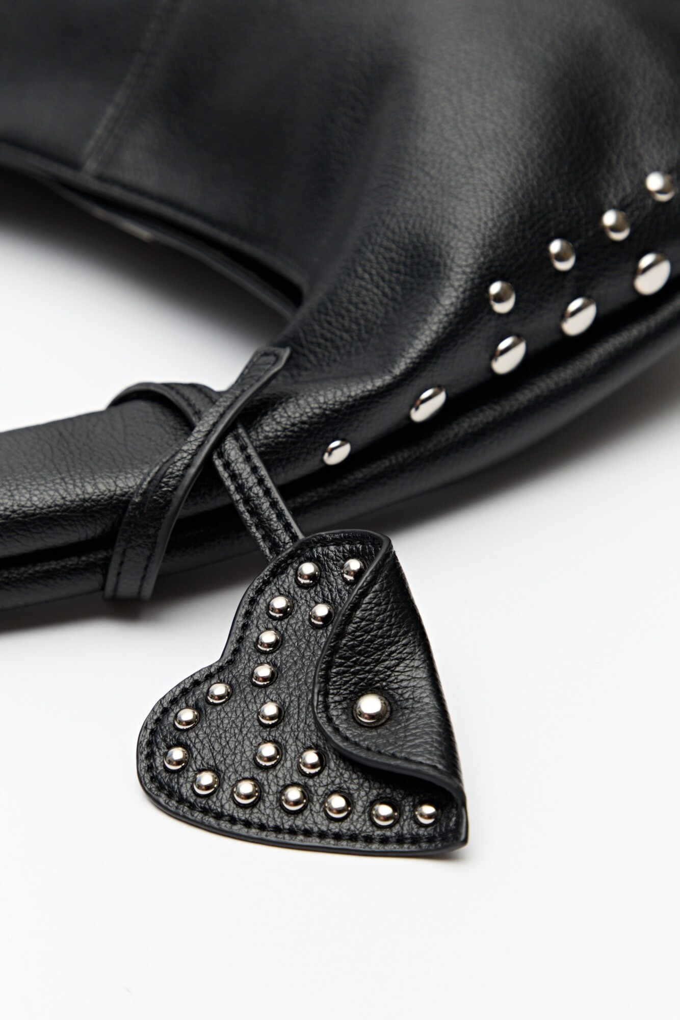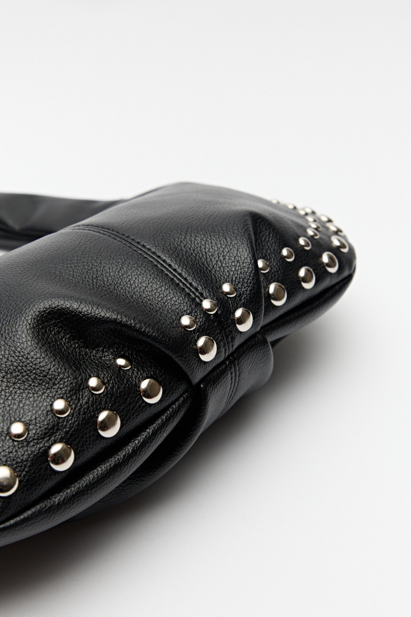 Cartera estilo hobo confeccionada en símil cuero con tachas metálicas que enmarcan el diseño y aportan un aire rocker chic. Su formato amplio con correa ancha la hace cómoda y funcional, perfecta para elevar un look urbano con actitud.
