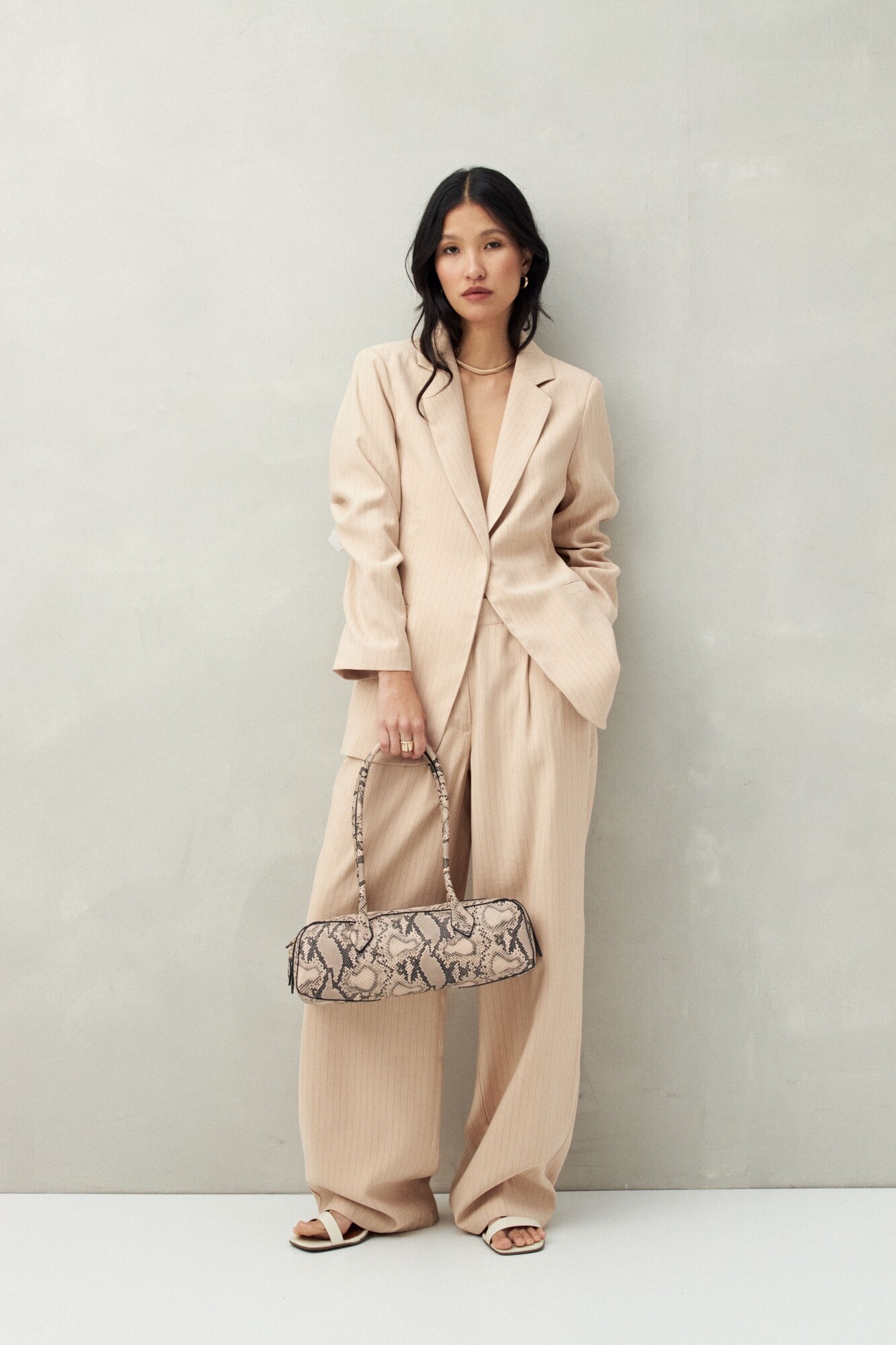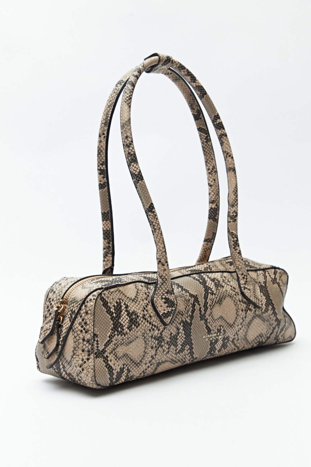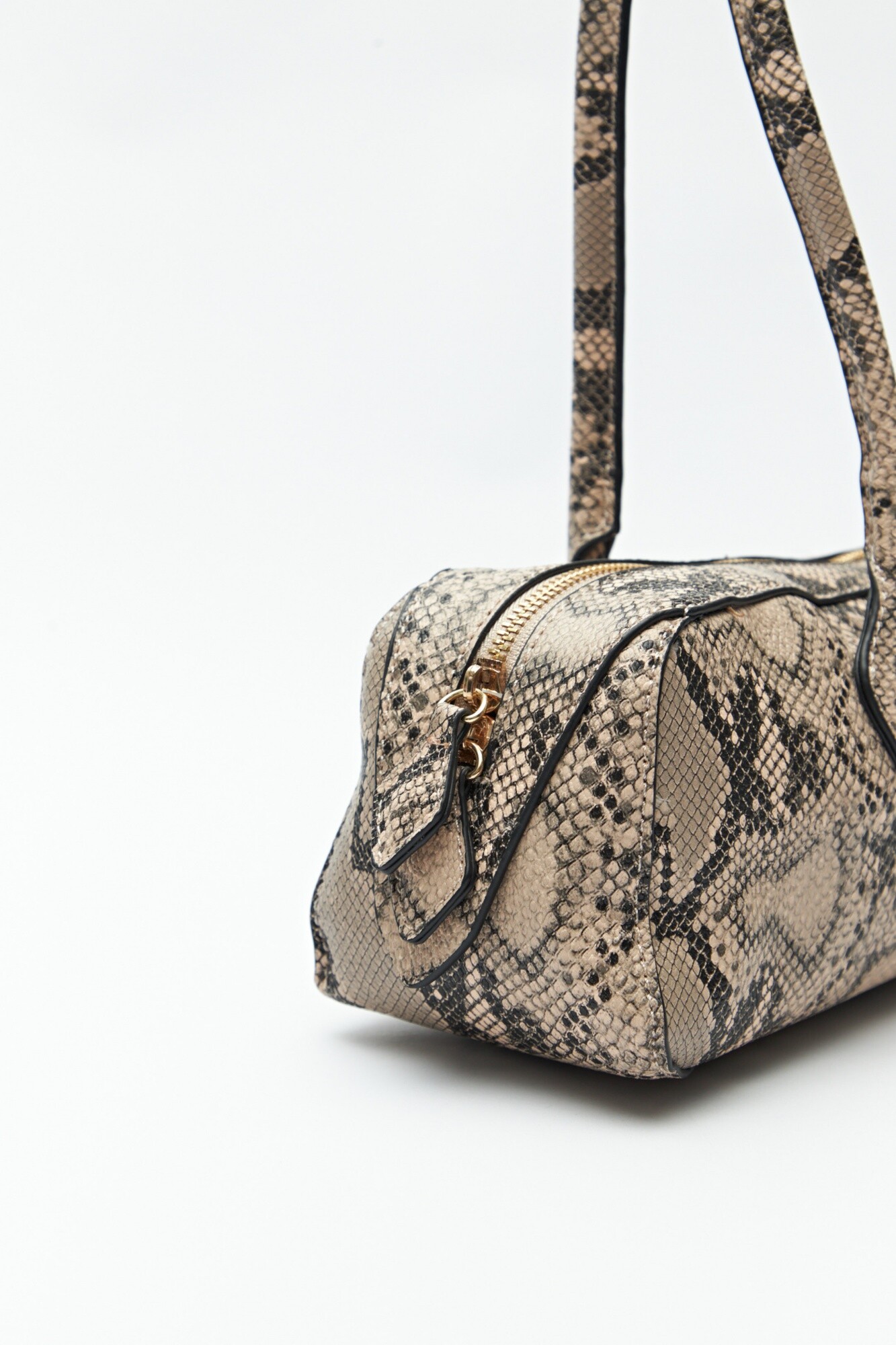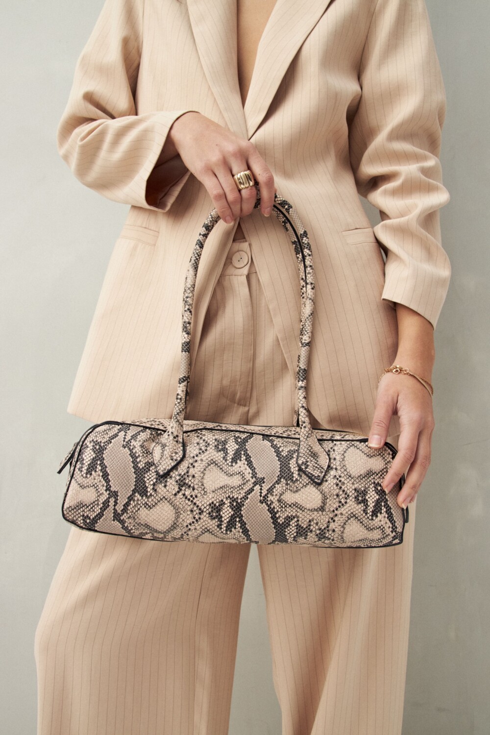 Cartera estilo baguette confeccionada en símil cuero con formato cilíndrico y asas cortas que aportan un aire trendy y versátil. Disponible en acabado liso o en versión animal print tipo reptil, es el accesorio perfecto para elevar desde un look de oficina hasta un outfit de noche con un guiño sofisticado.