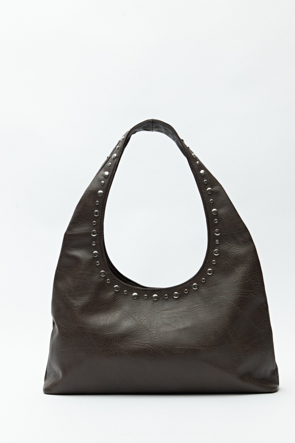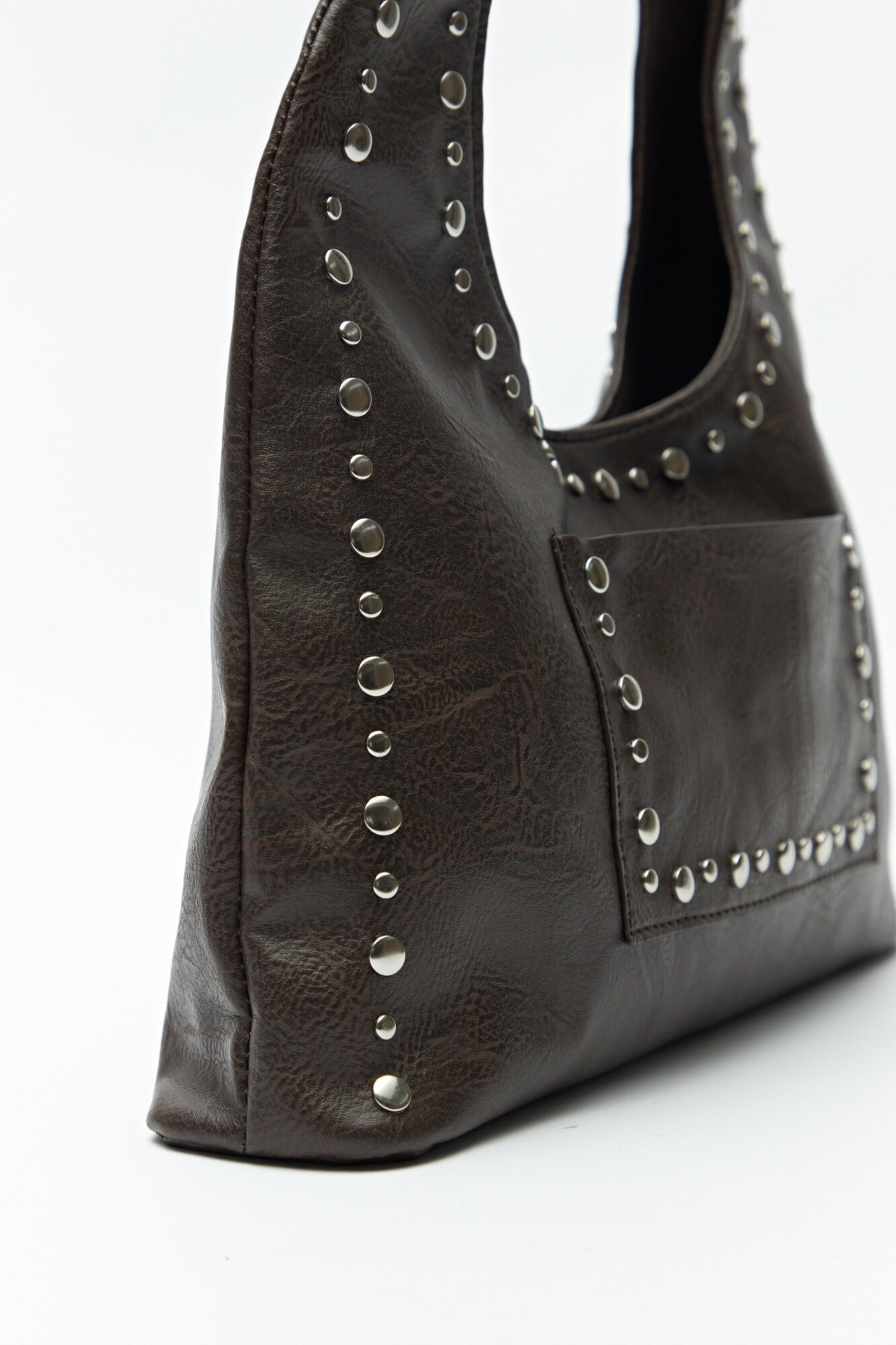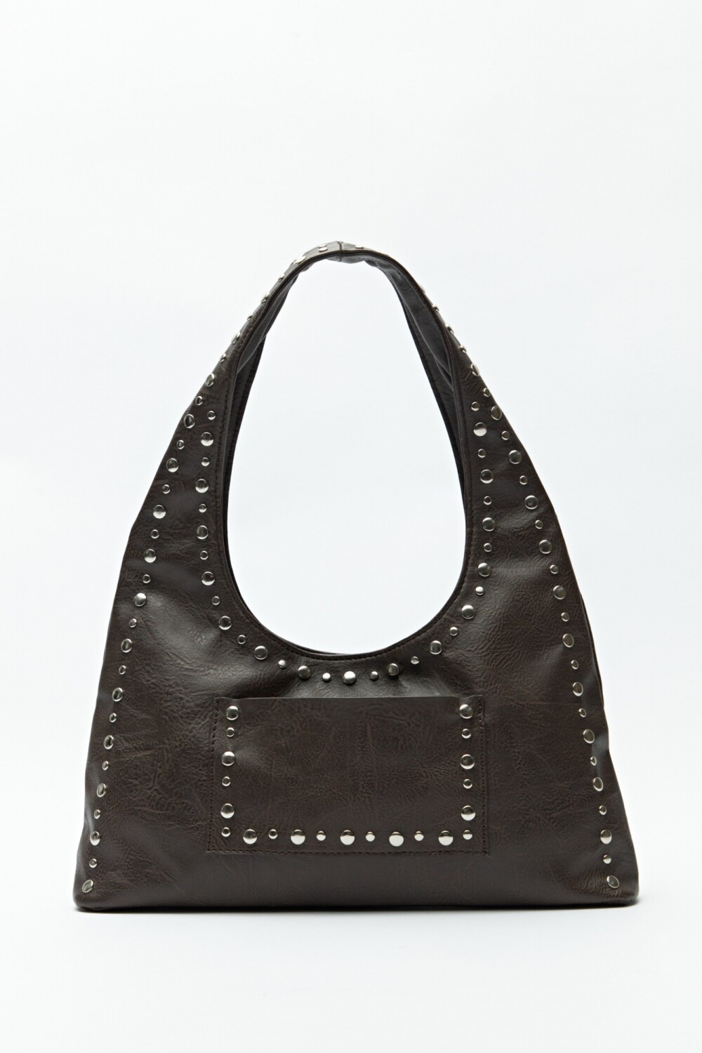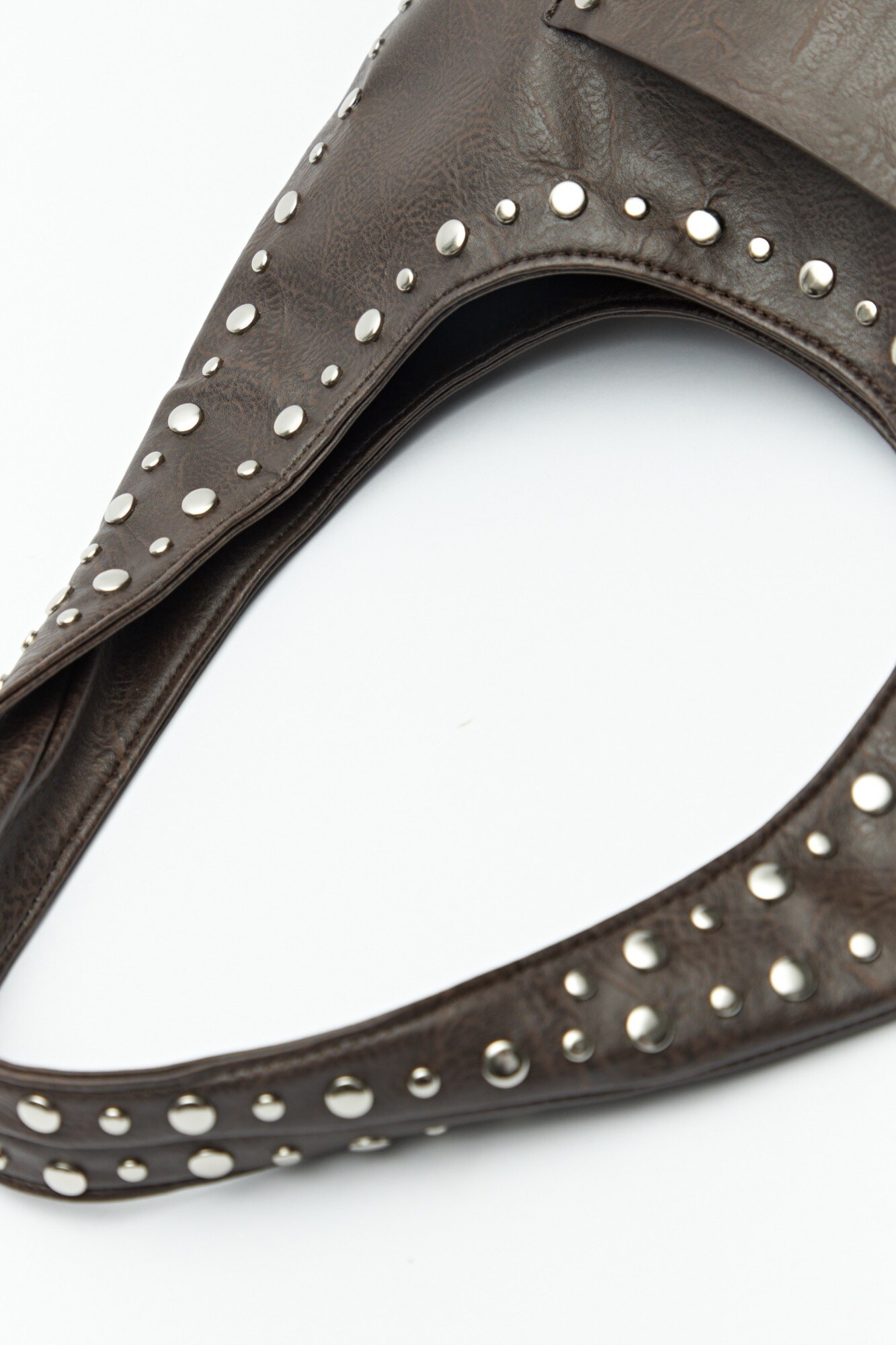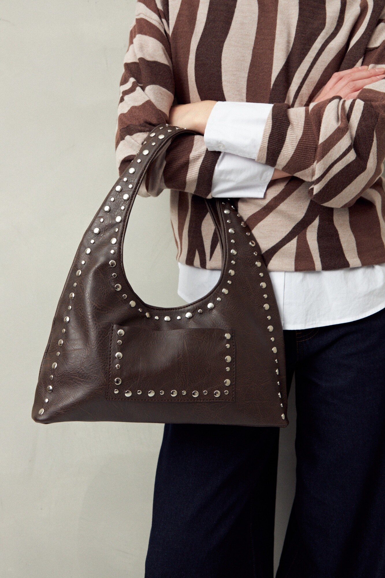 Cartera en símil cuero texturizado con apliques de tachas metálicas que recorren el frente y el contorno, aportando un estilo edgy y actual. Su silueta amplia con bolsillo frontal la convierte en una pieza funcional y trendy a la vez, perfecta para darle un giro moderno a tus looks diarios o elevar un outfit urbano.