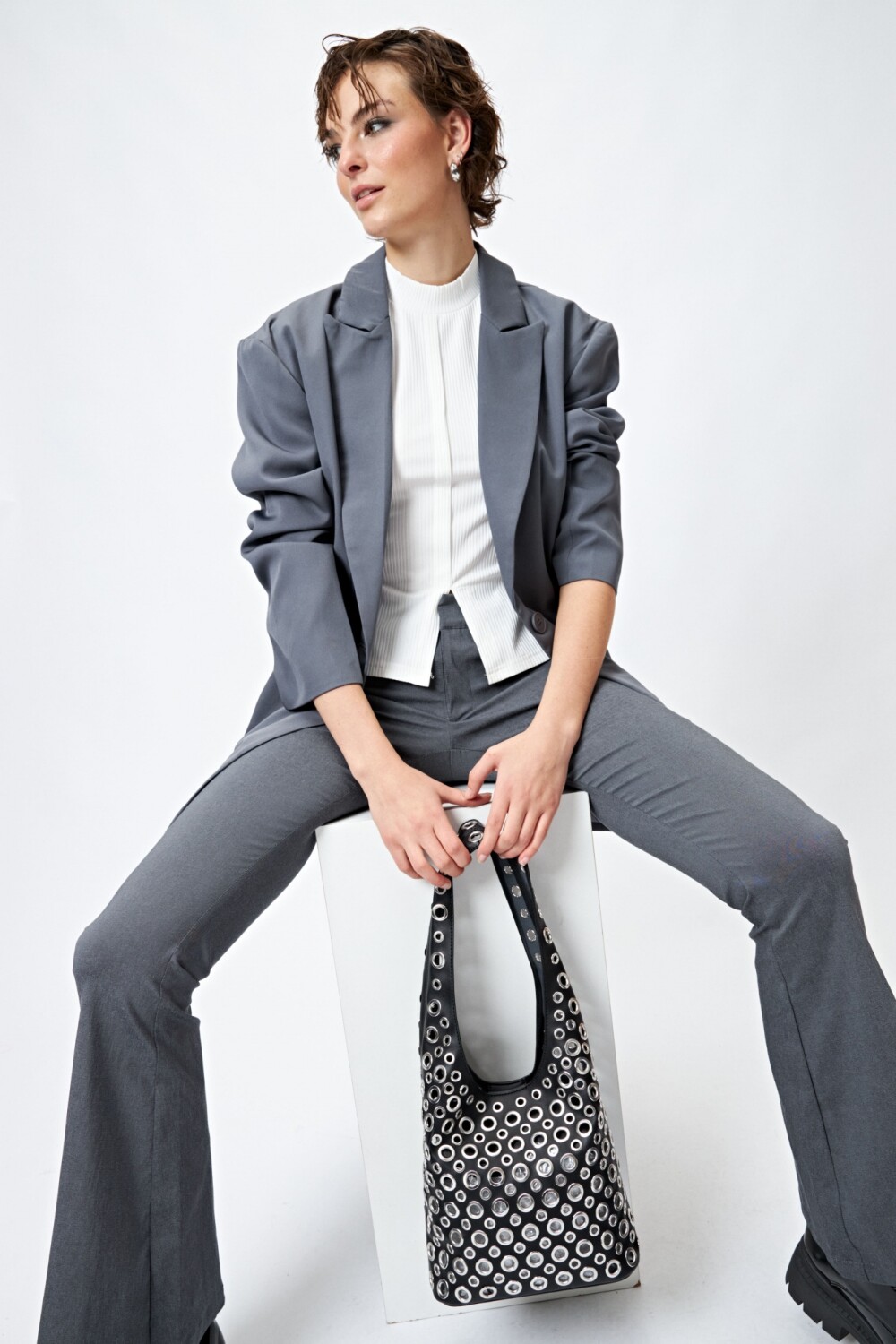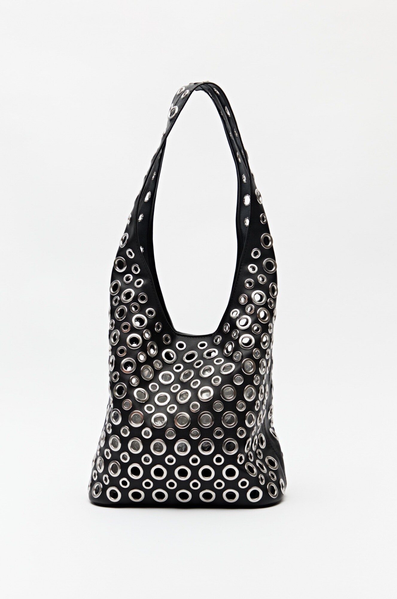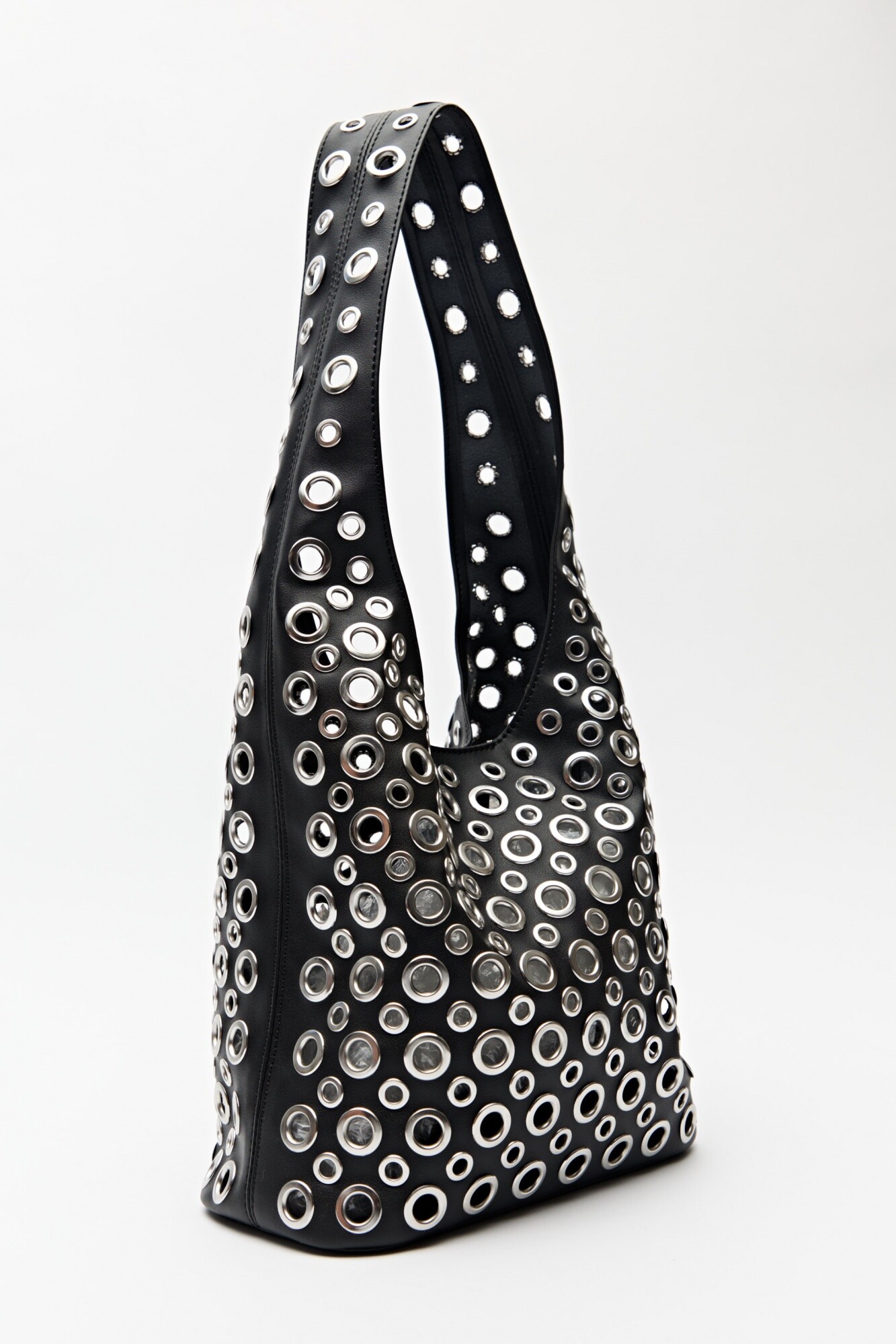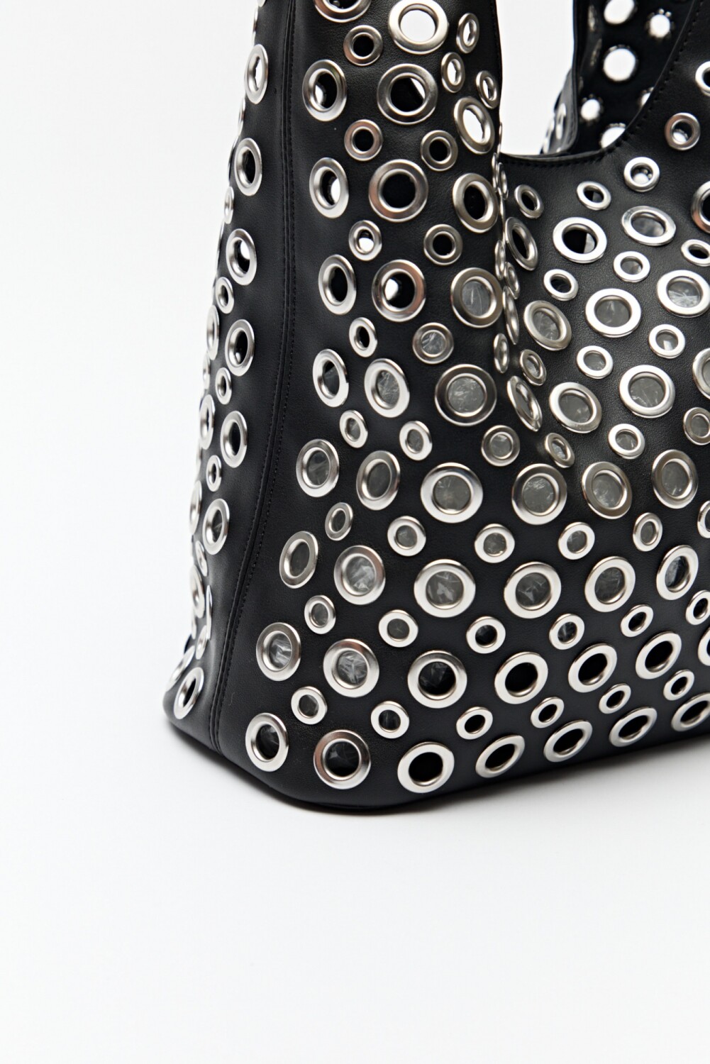 Cartera estilo hobo con apliques metálicos en toda su superficie, un diseño que se alinea con la tendencia de accesorios statement que marcan presencia. Su formato amplio combina practicidad con un aire edgy y vanguardista, convirtiéndola en la pieza perfecta para elevar un look urbano con personalidad y sumarse al espíritu de la moda actual.